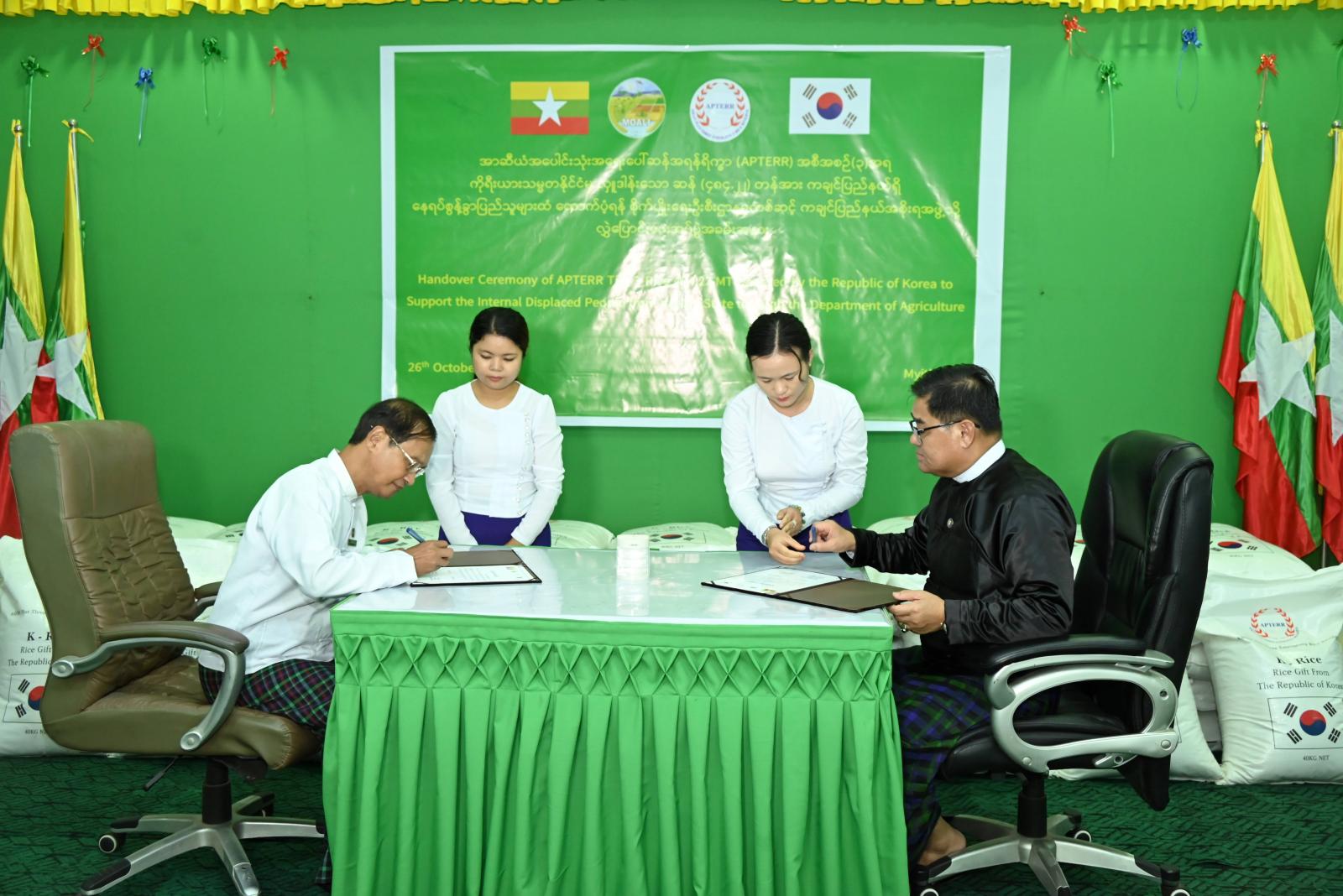 အဆိုပါ အခမ်းအနားတွင် ပြည်နယ်ဝန်ကြီးချုပ်က ကျေးဇူးတင်စကားပြောကြားကာ ပြည်နယ်ဦးစီးမှူး ဦးဌေးလွင်က ASEAN+3 အရေးပေါ်ဆန်အရန်ရိက္ခာ (APTERR) အစီအစဉ်(၃)ဖြင့် ကချင်ပြည်နယ်အပါအဝင် တိုင်းဒေသကြီးနှင့် ပြည်နယ် (၈)ခုတွင် ထောက်ပံ့ပေးခဲ့မှု အခြေအနေများကို ရှင်းလင်းတင်ပြပြီး ပြည်နယ်ဝန်ကြီးချုပ်က ပြည်နယ်ဦးစီးမှူး ထံမှ အာဆီယံ (၁၀)နိုင်ငံအပေါင်းသုံးမှ အရေးပေါ်ဆန်အရန်ရိက္ခာ (APTERR)အစီအစဉ်(၃)ဖြင့် ထောက်ပံ့လှူဒါန်းသော အရေးပေါ်ဆန်တန်ချိန် (၄၈၄ ဒဿမ ၂၂)တန်ရှိ ဆန်အိတ်များအား အလွှဲအပြောင်း စာရွက်စာတမ်းတွင် လက်မှတ်ရေးထိုး လက်ခံရယူကာ ကိုရီးယားသမ္မတနိုင်ငံနှင့် APTERR အတွင်းရေးမှူးချုပ်ထံသို့ ကျေးဇူးတင်ဂုဏ်ပြုမှတ်တမ်းလွှာကို ပြန်လည်ဂုဏ်ပြုပေးအပ်ခဲ့သည်။