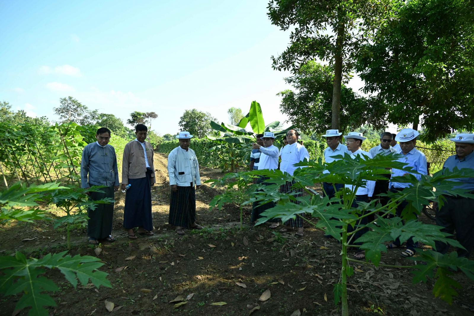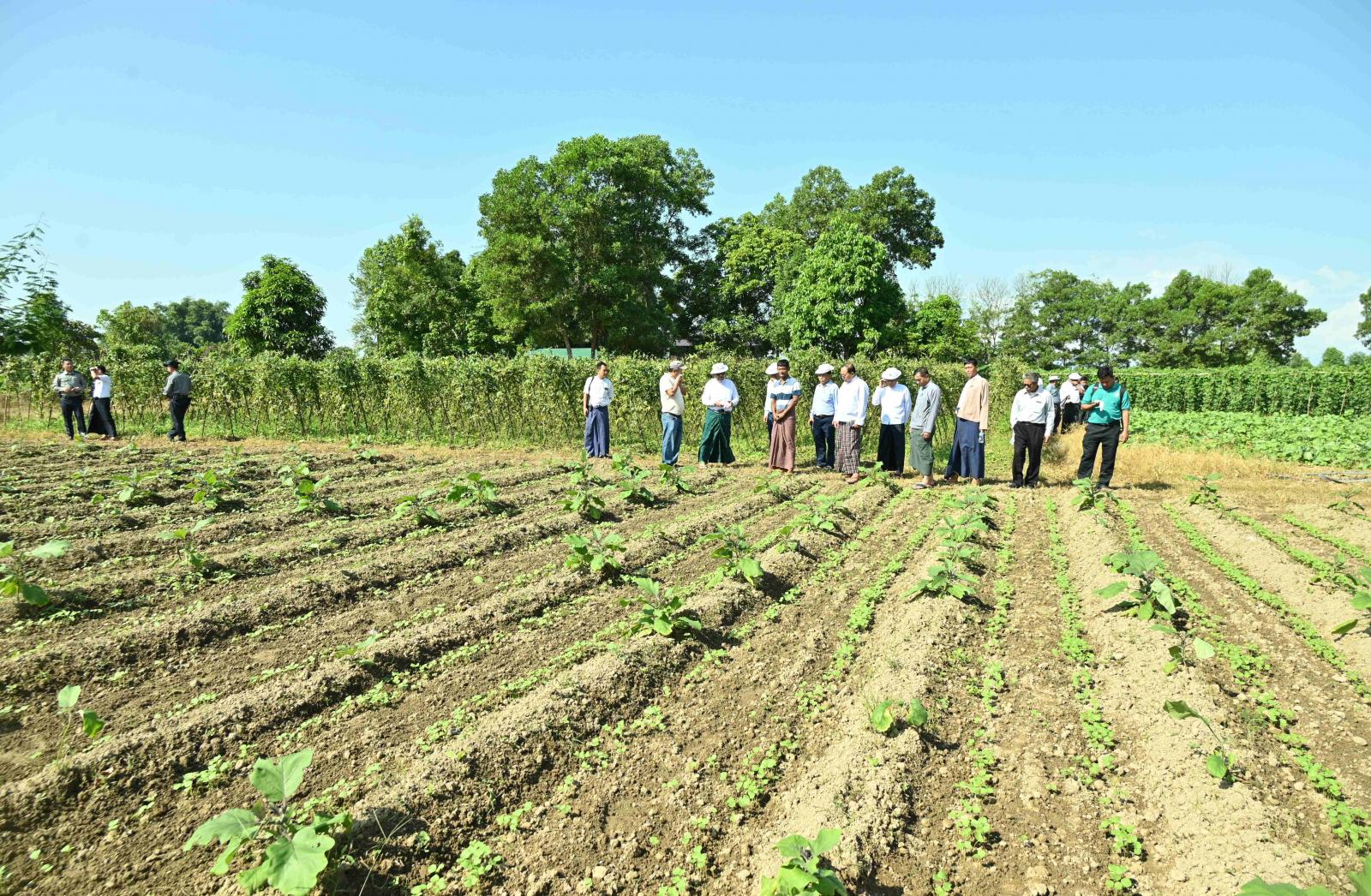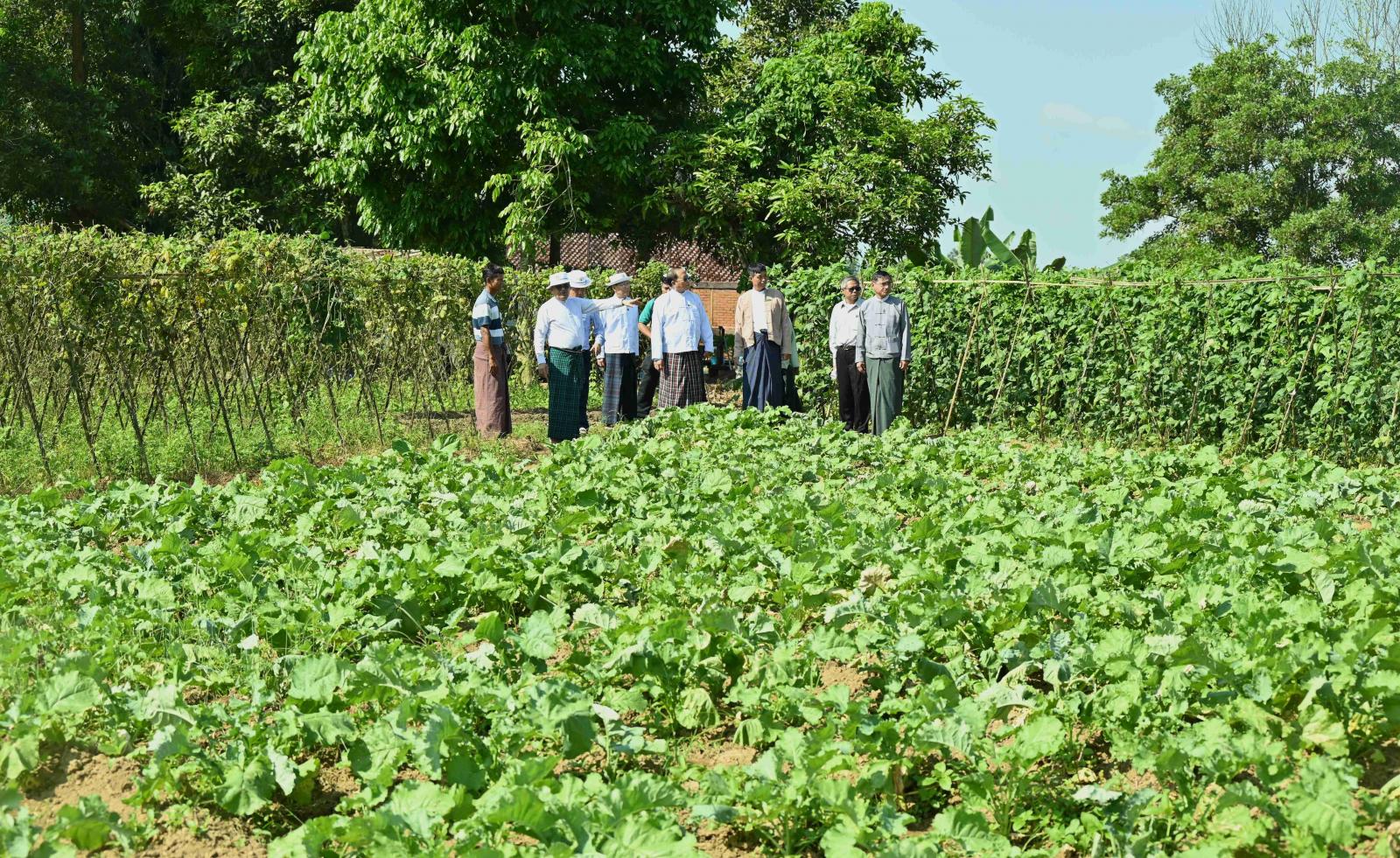 ထို့နောက် အဆိုပါ ကျေးရွာအတွင်းရှိ ၎င်းပိုင် ဟင်းသီးဟင်းရွက်စိုက်ပျိုးရေးခြံသို့ ထပ်မံသွားရောက်ပြီး အဆိုပါ ခြံဝင်း (၁၅)ဧကအတွင်း မိုးစပါး စိုက်ပျိုးထားရှိမှု၊ စီးပွားဖြစ် ရောင်းချနိုင်ရေး စိုက်ပျိုးဆောင်ရွက်ထားရှိသည့် ခရမ်းချဉ်သီး၊ ပဲရှည်သီး၊ ချဉ်ပေါင်၊ ဖရုံ၊ ကိုက်လံ၊ မုန်ညှင်းစသည့် ဟင်းသိးဟင်းရွက်ပင်များ စိုက်ပျိုးအောင်မြင်ဖြစ်ထွန်းနေမှု အခြေအနေများကို လှည့်လည်ကြည့်ရှု စစ်ဆေးခဲ့ကြပြီး ပြည်နယ်ဝန်ကြီးချုပ်က စိုက်ပျိုးရေးလုပ်ငန်း လုပ်ကိုင်ဆောင်ရွက်နေသူများကို ပံ့ပိုးကူညီပေးခြင်းဖြင့် ဒေသတွင်း သီးနှံစိုက်စွမ်းအား တိုးမြှင့်ပေးခြင်းဖြစ်ပြီး သီးနှံစိုက်စွမ်းအား တိုးမြှင့်လာသည်နှင့်အမျှ မိမိတို့ပြည်နယ်၏ စားရေရိက္ခာဖူလုံပေါများလာမည်ဖြစ်ပါကြောင်း၊ သို့ဖြစ် ပါ၍ လယ်စိုက် တောင်သူများနှင့် တစ်ပိုင်တစ်နိုင် စိုက်ပျိုးသူများအား စိုက်ပျိုးသီးနှံအလိုက် ပန်းတိုင် အထွက်နှုန်းရရှိစေရေး၊ တောင်သူများ ဝင်ငွေတိုးပွားစေရေး စိုက်ပျိုးနည်းပညာများနှင့် စပ်လျဉ်း၍ နည်းလမ်းတကျဖြစ်စေရေး၊ လိုအပ်သည့် သွင်းအားစုများရရှိအောင် လုပ်ထုံးလုပ်နည်းနှင့်အညီ ကူညီဆောင်ရွက်ပေးကြရေး ပေါင်းစပ်ညှိနှိုင်းဆောင်ရွက်ပေးခဲ့သည်။