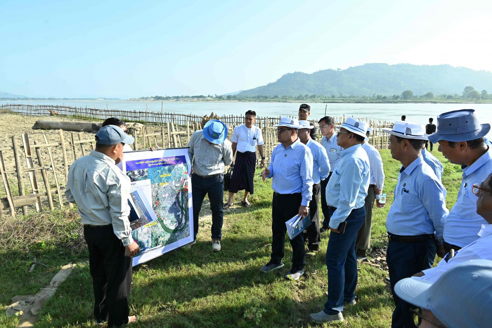 ယင်းနောက် အဆိုပါ မြစ်ဆိပ်မှ တစ်ဆင့် မီးသတ်ဦးစီးဌာနမှ အမြန်ရေယာဉ်များဖြင့် ဧရာဝတီ မြစ်ကြောင်းတစ်လျှောက် မြို့အထက်ဘက် ရွှေစက်ရပ်ကွက် ကရိန်နော်အထိလည်းကောင်း၊ ကရိန်နော်မှ သီတာရပ်ကွက် ရုံးကြီးလမ်းနှင့် ကမ်းနားလမ်းထောင့်ရှိ ဧရာဝတီမြစ်ဆိပ်အထိ လည်းကောင်း၊ မြစ်တွင်းမှတစ်ဆင့် ဘဏ္ဍာနှစ်အလိုက် ဦးစားပေးဆောင်ရွက်ရမည့် မန်ခိန်ရပ်ကွက် တရုတ်ဘုံကျောင်းမှ ဗလမင်းထင်တံတားအထိ ကျောက်စီကမ်းထိန်းတမံနှင့် ရေလျှံတားနံရံ တည်ဆောက်နိုင်ရေး လျာထားဆောင်ရွက်သွားမည့် အစီအစဉ်များ၊ ဗလမင်းထင်တံတားမှ ဆုတောင်းပြည့်ရေဆိပ်အထိ ရေလျှံတားနံရံတည်ဆောက်ရန် လျာထားမှု အခြေအနေများနှင့် ရေထိန်းတံခါးတည်ဆောက် မည့် တက္ကသိုလ်ရေပေါက်နှင့် အင်ဂျန်းချောင်းဝတို့အား လှည့်လည်ကြည့်ရှုစစ်ဆေးခဲ့ကြပြီး ရေလမ်းကြောင်း ဖွံ့ဖြိုးရေးအတွင်း ဗလမင်းထင်တံတားအောက်ဖက်ရှိ သဲသောင်ခုံနှင့် နောင်တာလောကျွန်း သဲသောင်ခုံတို့အား သဲသောင်တူးဖော်ရှင်းလင်းဆောင်ရွက်သွားမည့် အစီအမံများကို ညှိနှိုင်းဆွေးနွေးခဲ့ကြသည်။