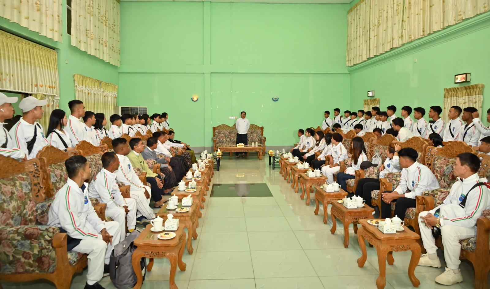 ယင်းနောက် လေဆိပ်ဧည့်ခန်းမဆောင်၌ အားကစားအသင်းများအလိုက် အုပ်ချုပ်သူ/နည်းပြများက မိတ်ဆက်တွေ့ဆုံခဲ့ကြပြီး ပြည်နယ်ဝန်ကြီးချုပ်က အားကစားအသင်းများအား မိမိတို့ကချင်ပြည်နယ်အနေဖြင့် အားကစားကဏ္ဍတွင် အတိုင်းအတာတစ်ခုထိ အောင်မြင်မှုရရှိနေပြီး ယခုအခါ တစ်နိုင်ငံလုံးအတိုင်းအတာဖြင့် ကျင်းပပြုလုပ်သွားမည့် အမျိုးသားအားကစားပွဲတော်ကြီးတွင် ပါဝင်ယှဉ်ပြိုင်အောင်မြင်မှုရရှိရေး ကြိုတင်ပြင်ဆင်လေ့ကျင့်မှုများ ပံ့ပိုးကူညီမှုများကို အတတ်နိုင်ဆုံး ဖြည့်ဆည်းပံ့ပိုးပေးခဲ့ပါကြောင်း၊ သို့ဖြစ်ပါ၍ အားကစားနည်းအလိုက် သွားရောက်ယှဉ်ပြိုင်ကြမည့် အားကစားအသင်းများအနေဖြင့် မိမိတို့အသင်း အနိုင်ရလိုစိတ်ထက် သတ်မှတ် စည်းမျဉ်း/စည်းကမ်းများနှင့်အညီ သန့်ရှင်းစွာဖြင့် ရွှေရည်မှန်းချက်ထား၍ အကောင်းဆုံး ကြိုးစားယှဉ်ပြိုင်ကြရန်လိုကြောင်း၊ ပြည်နယ်ဂုဏ်ဆောင်နိုင်ပြီး နိုင်ငံအတွက် အားကစားဖြင့် ထူးချွန်ထက်မြက်သည့် လူငယ်များဖြစ်အောင် မိမိတို့တတ်စွမ်းသမျှအားအင်ဖြင့် ကြိုးစားကြရန်လိုကြောင်း အားပေးစကားပြောကြားခဲ့သည်။
