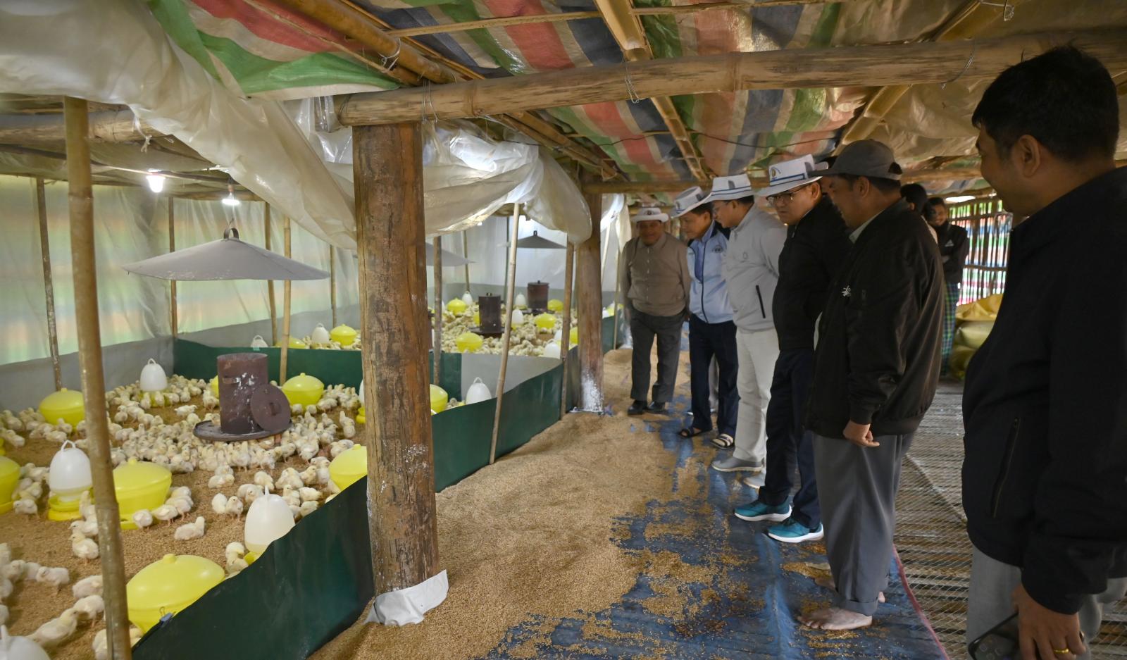 ထိုမှတစ်ဆင့် ပြည်နယ်ဝန်ကြီးချုပ်နှင့် အဖွဲ့သည် အဆိုပါကျေးရွာအုပ်စုအတွင်း ပြည်ထောင်စုလမ်းမကြီးဘေးရှိ ပိုင်ရှင်ဦးဝင်းမြင့်၏ စီးပွားဖြစ်အသားတိုးကြက်မွေးမြူရေးခြံသို့ သွားရောက်ပြီး ကြက်ခြံများအတွင်း ကြက်သားပေါက်ကောင်ရေ (၃၀၀၀)ကျော် မွေးမြူထားရှိမှု၊ အရွယ်ရောက် ကြက်ကောင်ရေ (၆၀၀၀)ကျော်တို့ဖြင့် စုစုပေါင်းကြက်ကောင်ရေ (၁၀၀၀၀)ကျော် မွေးမြူထားရှိမှု အခြေအနေများကို လှည့်လည်ကြည့်ရှုစစ်ဆေးကာ ပြည်နယ်ဝန်ကြီးချုပ်က မွေးမြူထုတ်လုပ်မှုတိုး တက်လာသည်နှင့်အမျှ ဒေသတွင်း အသားစားသုံးမှုဖူလုံစေသည့်အပြင် ကုန်ဈေးတည်ငြိမ်စေပါ ကြောင်း၊ ထို့အပြင် အာဟာရပြည့်ဝသည့် အစားအစာများ ညီညွတ်မျှတစွာ ကျွေးမွေးနိုင်ရေးနှင့် ရောဂါအန္တရာယ်ကြိုတင်ကာကွယ်နိုင်ရေး လိုအပ်သည်များ ပံ့ပိုးထောက်ပံ့ကူညီပေးနိုင်ရေး ဌာနဆိုင်ရာတာဝန်ရှိသူများနှင့် ပေါင်းစပ်ညှိနှိုင်း၍ ဖြည့်ဆည်းဆောင်ရွက်ပေးခဲ့ကာ စွမ်းအားပြည့်ရောစပ် အစာမှုန့်များ၊ ခြံဖျန်းပိုးသတ်ဆေးများ၊ ကြက်အစာအိတ်များနှင့်မွေးမြူရေးအထောက်အကူပြုဆေးဝါးများကို ထောက်ပံ့ပေးအပ်ခဲ့ကြသည်။