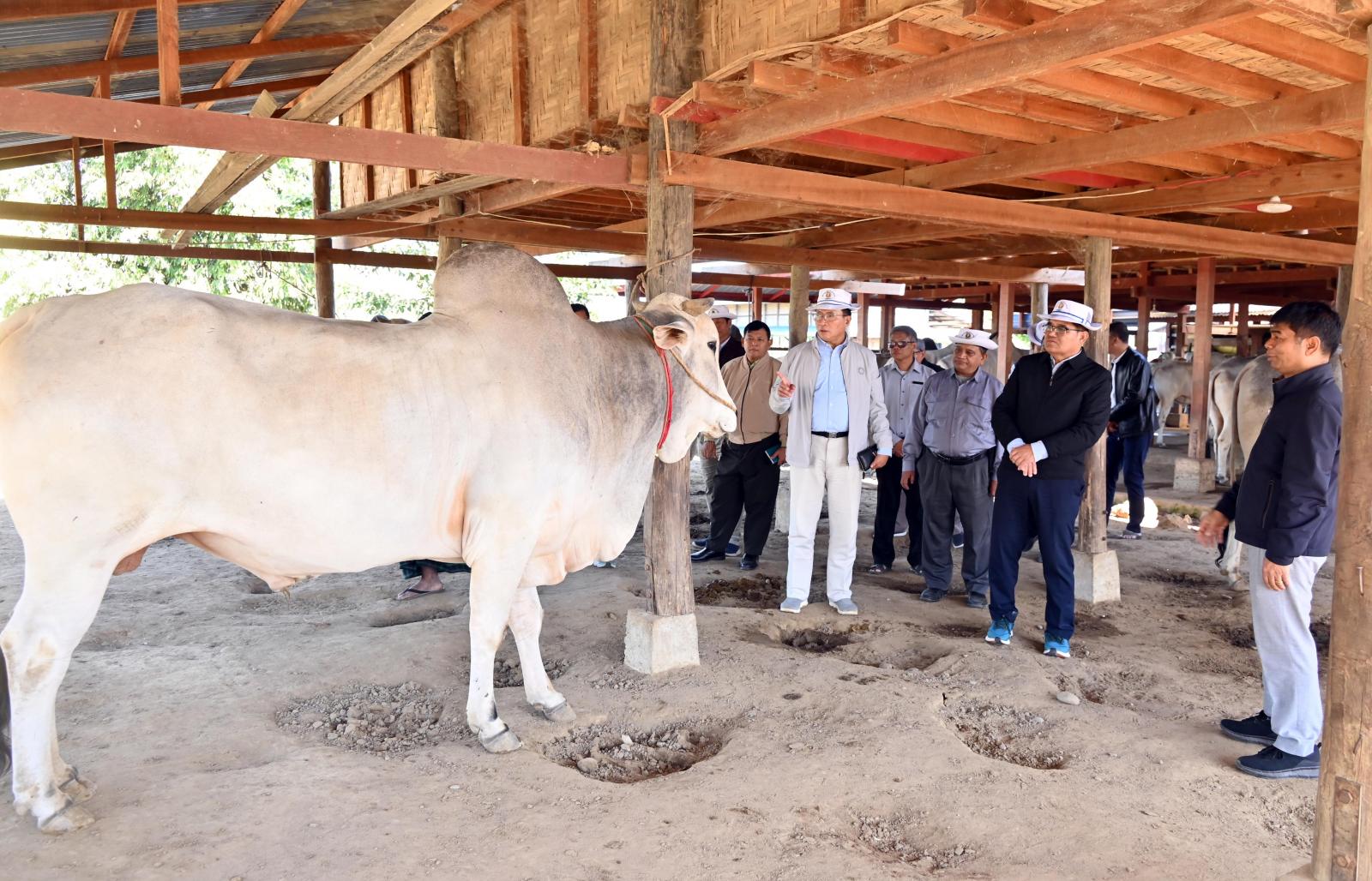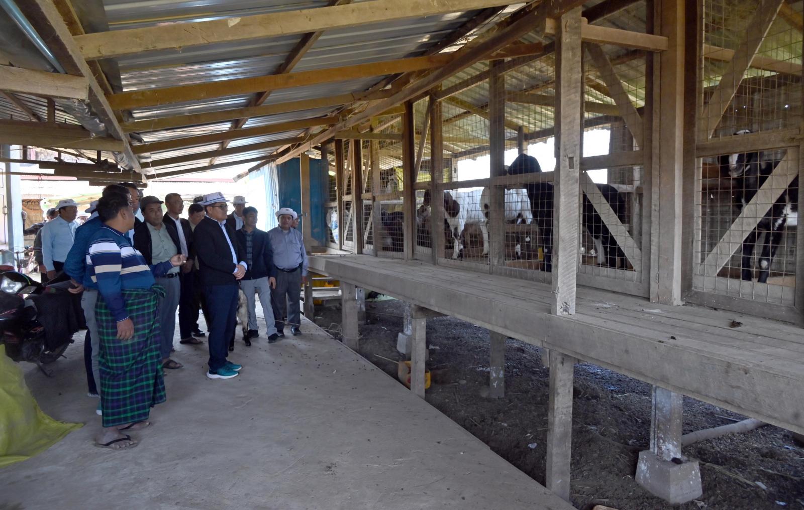 ယင်းနောက် ပြည်နယ်ဝန်ကြီးချုပ်နှင့် အဖွဲ့ဝင်များသည် ရွှေအိုက်(ရွှေပြည်သာ)ရပ်ကွက်အတွင်း နိုင်ငံ့စီးပွားမြှင့်တင်ရေး ရန်ပုံငွေဖြင့် ဆောင်ရွက်လျက်ရှိသော ပိုင်ရှင်ဦးဉာဏ်လင်းကျော် အပါအဝင် အစုအဖွဲ့ဝင် (၁၅)ဦးတို့၏ “ဇွဲမာန်” အထွေထွေစီးပွားရေးလုပ်ငန်းသမဝါယမအသင်းစု၏ နွားမွေးမြူရေးခြံသို့ သွားရောက်ခဲ့ပြီး အဆိုပါခြံဝင်းအတွင်း ဒေသနွားကောင်ရေ (၃၀)ကျော်မွေးမြူ အောင်မြင်ဖြစ်ထွန်းနေမှု အခြေအနေများကို ကြည့်ရှုစစ်ဆေးခဲ့ကြပြီး နွားစာဝယ်ယူရရှိမှု အခြေအနေ များ၊ ဒေသတွင်း ဈေးကွက်ရရှိမှု အခြေအနေများနှင့် လိုအပ်သည်များကို မေးမြန်းဆွေးနွေးကာ ခြံဖျန်း ပိုးသတ်ဆေးများ၊ မွေးမြူရေးအထောက်အကူပြုဆေးဝါးများကို ထောက်ပံ့ပေးအပ်ခဲ့ကြသည်။