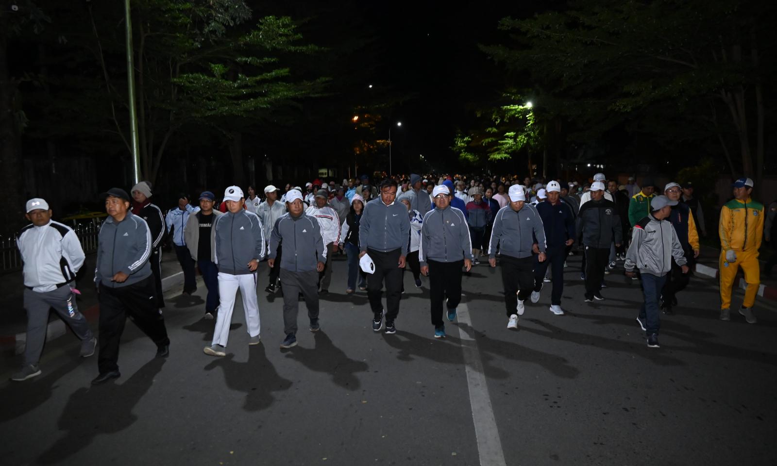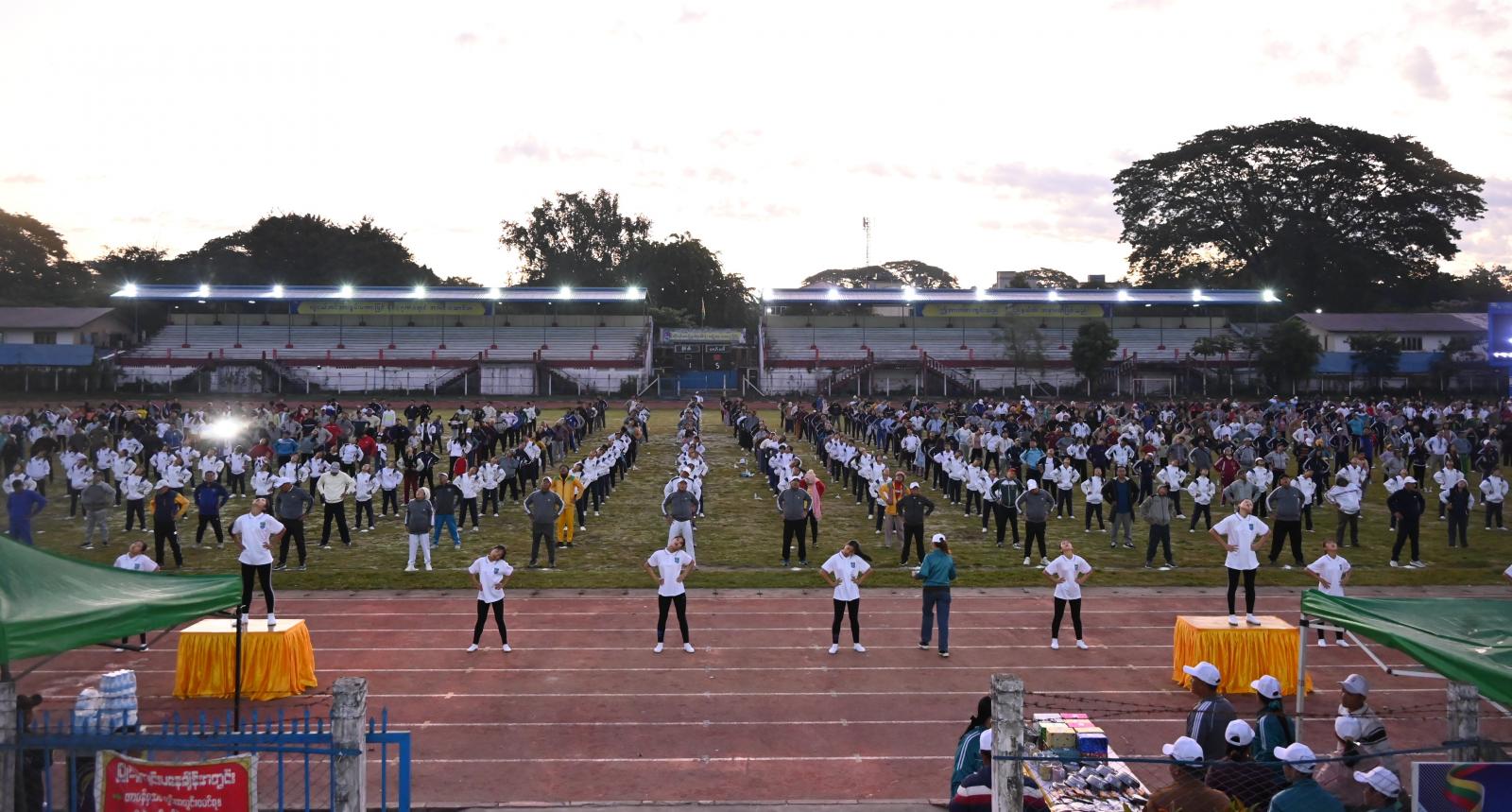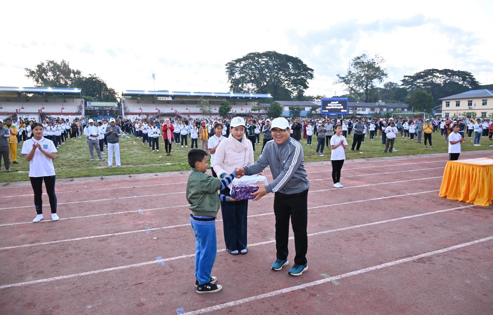 ထို့နောက် ပြည်နယ်ဘောလုံးကွင်းအတွင်း ကိုယ်ကာယလေ့ကျင့်ခန်း အတွဲအမှတ်(၁)နှင့် (၂)လေ့ကျင့်ခန်းနှင့် Fitness Dance တို့ကို စုပေါင်းလေ့ကျင့်ခဲ့ကြပြီး ပြည်နယ်ဝန်ကြီးချုပ်နှင့် တာဝန်ရှိသူများက လမ်းလျှောက်ပွဲပါဝင်ဆင်နွှဲကြသူများအား ကံစမ်းမဲဖောက်၍ အိမ်အသုံးအဆောင်ပစ္စည်း များကို ပေးအပ်ချီးမြှင့်ခဲ့ကြကာ ပျော်ပွဲရွှင်ပွဲ အားကစားပြိုင်ပွဲအဖြစ် မီတာ ၁၀၀ ၊ မီတာ ၂၀၀ နှင့် မီတာ ၄၀၀ အပြေးပြိုင်ပွဲများကို ကျင်းပပြုလုပ်ခဲ့ကြပြီး ဆုရရှိသူများနှင့် ပြိုင်ပွဲဝင်များအား ဂုဏ်ပြုချီးမြှင့်ငွေများကို ပေးအပ်ချီးမြှင့်ခဲ့ကြသည်။