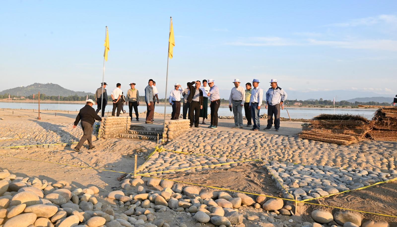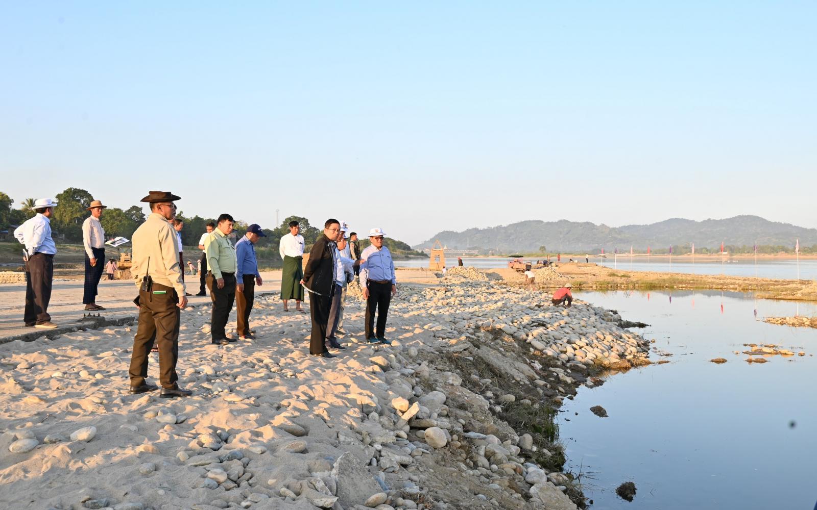 ထိုမှတစ်ဆင့် ပြည်နယ်ဝန်ကြီးချုပ်နှင့်အဖွဲ့ဝင်များသည် မြစ်ကြီးနားမြို့ စီတာပူရပ်ကွက်၊ မနောကွင်းအရှေ့ဘက်ရှိ ဧရာဝတီမြစ်ကမ်း၌ သဲနှုန်းတင်ကျန်မှုကြောင့် ဖြစ်ပေါ်လျက်ရှိသော မြစ်ကမ်းဘေး သဲသောင်ခုံပေါ်တွင် ဧရာဝတီမြစ်၏ အလှနှင့်အတူ စိမ်းလန်းစိုပြည်ပြီး အများပြည်သူ အပန်းဖြေနိုင်သည့်နေရာတစ်ခုအဖြစ် အကောင်အထည်ဖော်ဆောင်ရွက်လျက်ရှိသည့် ဧရာဝတီရှုခင်းသာ အပန်းဖြေစခန်းစီမံကိန်းနေရာသို့ သွားရောက်ပြီး မြစ်ကမ်းပါးတစ်လျှောက် စက်ယန္တရားကြီးများဖြင့် မြေယာရှုခင်းနှင့် ကမ်းနားအဆင်းလမ်းအား အမာခံကျောက်သား ခင်းကြိတ်ခြင်း၊ မြစ်ကျောက်တုံးများဖြင့် ရှုခင်းသာနေရာများအား အလှဆင်တည်ဆောက်ခြင်းနှင့် အင်ဂျန်းခချောင်းဆုံနေရာတွင် ဝါးတံတားတည်ဆောက်ခြင်းလုပ်ငန်းများအား လှည့်လည်ကြည့်ရှုစစ်ဆေးခဲ့ကြပြီး အဆိုပါစီမံကိန်းနေရာမှ လောကမာန်အောင်ဆုတောင်းပြည့်စေတီဆိပ်ကမ်းအထိ မြစ်ကမ်းပါးတစ်လျှောက် သဲသောင်ခုံပေါ်တွင် ပန်းနှမ်း၊ ဆီမုန်ညှင်းများ စိုက်ပျိုးအောင်မြင်ဖြစ်ထွန်းမှုအခြေအနေများကို လှည့်လည်ကြည့်ရှုစစ်ဆေးခဲ့ကြကြောင်း သိရသည်။