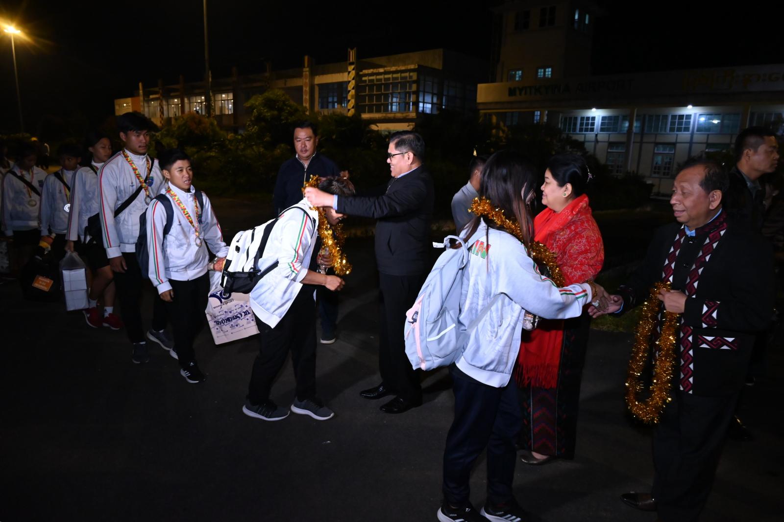 ထိုသို့ ဂုဏ်ပြုကြိုဆိုရာတွင် လေဆိပ်၌ ပြည်နယ်ဝန်ကြီးချုပ် ဦးခက်ထိန်နန်နှင့်ဇနီး ဒေါ်နန်ဆိုင်း၊ ပြည်နယ်တရားလွှတ်တော်တရားသူကြီးချုပ်၊ ပြည်နယ်အစိုးရအဖွဲ့ဝင် ဝန်ကြီးများနှင့် ၎င်းတို့၏ ဇနီးများ၊ ပြည်နယ်အဆင့်ဌာနဆိုင်ရာများ၊ အားကစားသမားများ၏ မိဘများနှင့် ညီအစ်ကို မောင်နှမများ၊ ကျောင်းသား/ ကျောင်းသူများက ဘင်ခရာအဖွဲ့နှင့်အတူ လေကြောင်းခရီးဖြင့် ပြန်လည်ရောက်ရှိလာသော ဖူဆယ်ဘောလုံး(ကျား၊ မ)အသင်းများ၊ ဘတ်စကတ်ဘော၊ ဘောလီဘော (ကျားနှင့်မ)အသင်းများ၊ လက်ဝှေ့၊ ကြက်တောင် စသည့် အားကစားအသင်းများအား ဂုဏ်ပြုပန်းကုံးဖြင့် လှိုက်လှဲနွေးထွေးစွာ ကြိုဆိုခဲ့သည်။