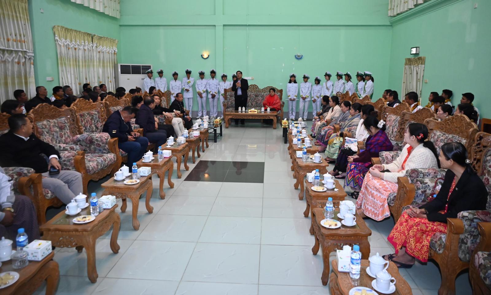 ယင်းနောက် လေဆိပ်ဧည့်ခန်းမဆောင်၌ အားကစားအဖွဲ့များအား ပြည်နယ်ဝန်ကြီးချုပ်က ခမ်းခမ်းနားနား ကျင်းပပြုလုပ်လျက်ရှိသည့် ပဉ္စမအကြိမ်မြောက် အမျိုးသားအားကစားပွဲတော်တွင် အစွမ်းကုန်ကြိုးစားယှဉ်ပြိုင်ခဲ့ကြသည့်အတွက် မိမိအနေဖြင့် ပြည်နယ်သူ/ ပြည်နယ်သားများ ကိုယ်စားဂုဏ်ယူဝမ်းမြောက်ပါကြောင်း၊ ဆုတံဆိပ်ရရှိခဲ့သည့် အားကစားအသင်းများကို ဂုဏ်ပြုသကဲ့သို့ ဆုမရရှိသော်လည်း အားကစားစိတ်ဓာတ်အပြည့်ဖြင့် ပါဝင်ယှဉ်ပြိုင်ခဲ့မှုအပေါ်၌လည်း ဂုဏ်ပြုကြိုဆိုပါကြောင်း၊ လာမည့်ပြိုင်ပွဲများတွင်လည်း ပြည်နယ်အတွက် ယခုကဲ့သို့ ဂုဏ်ယူရသည့် လူငယ်များအဖြစ် ကြိုးစားကြစေလိုကြောင်း ဂုဏ်ပြုပြောကြားသည်။