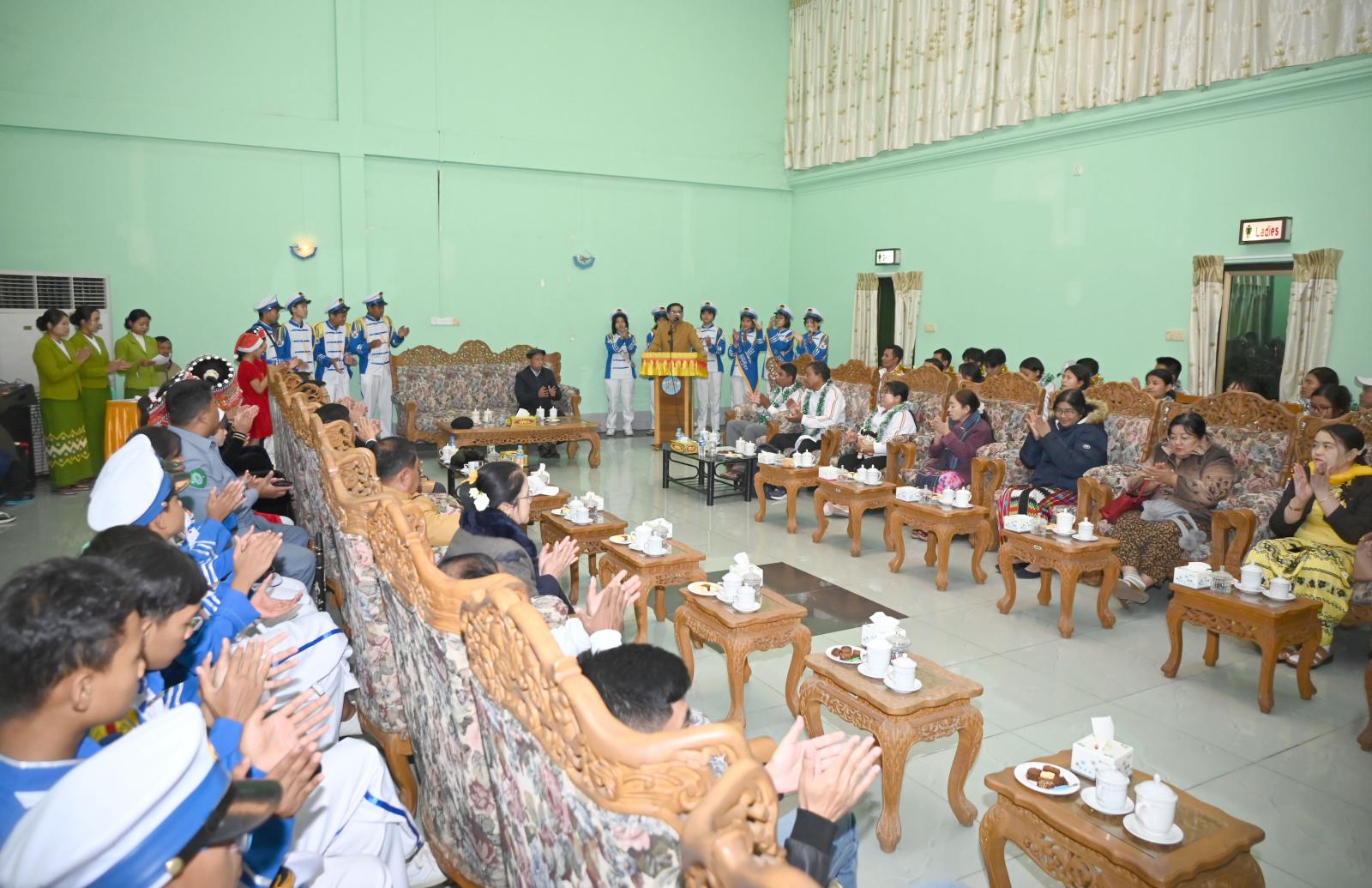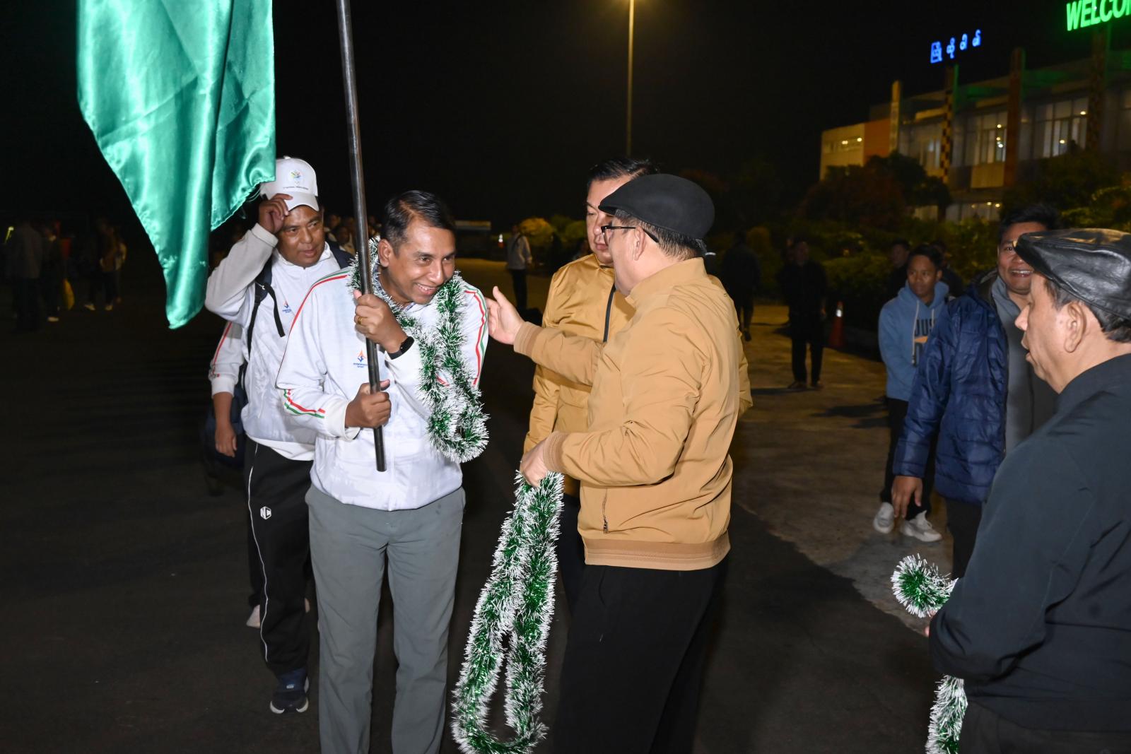 ဆက်လက်၍ ပြန်လည်ရောက်ရှိလာသော အားကစားအဖွဲ့များမှ အုပ်ချုပ်သူ/ နည်းပြများက အားကစားနည်းအလိုက် ပြိုင်ပွဲများတွင် ပါဝင်ယှဉ်ပြိုင်ခဲ့သည့် အတွေ့အကြုံများနှင့် ဆုတံဆိပ်ရရှိခဲ့မှု အခြေအနေများကို အသီးသီးရှင်းလင်းတင်ပြခဲ့ကြရာ ပြည်နယ်ဝန်ကြီးချုပ်က နောင်လာမည့် ပြိုင်ပွဲများတွင်လည်း အရည်အချင်းပြည့်မီသည့် အားကစားသမားများအား ပြန်လည်စုဖွဲ့လေ့ကျင့်ပြီး ပြည်နယ်အတွက် ယခုကဲ့သို့ ဂုဏ်ယူရသည့် လူငယ်မောင်/မယ်များအဖြစ် ကြိုးစားကြစေလိုကြောင်း အားပေးပြောကြားပြီး ကြိုဆိုဂုဏ်ပြုခဲ့ကြသည့် ဘင်ခရာအဖွဲ့၊ နယ်စပ်ဒေသတိုင်းရင်းသားလူငယ်များ ဖွံ့ဖြိုးရေးသင်တန်းကျောင်းမှ ကျောင်းသား/ ကျောင်းသူများနှင့် လီဆူရိုးရာအကအဖွဲ့တို့အား ချီးမြှင့် ငွေများ ပေးအပ်ခဲ့သည်။