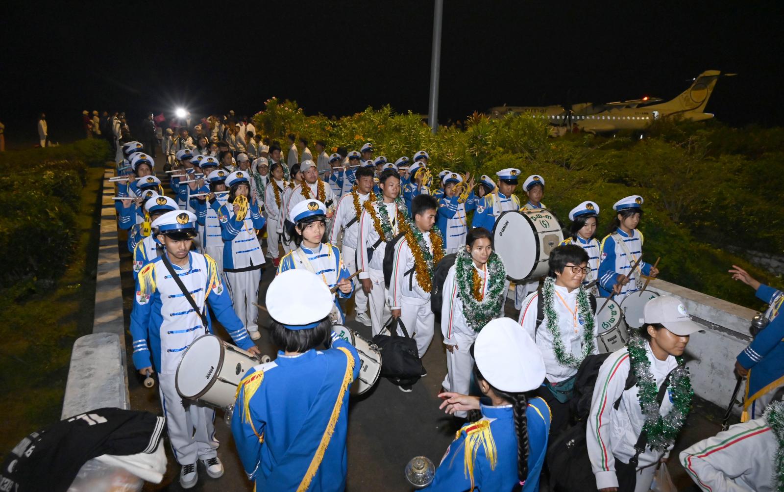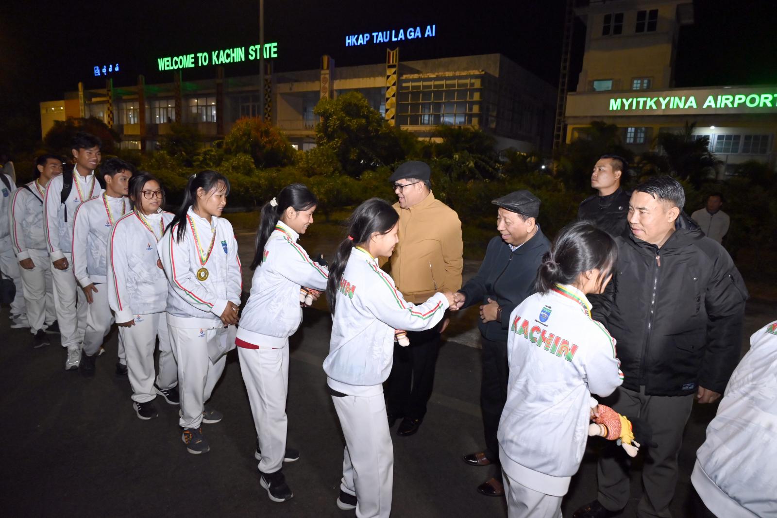 ထိုသို့ ဂုဏ်ပြုကြိုဆိုရာတွင် လေဆိပ်၌ ပြည်နယ်ဝန်ကြီးချုပ် ဦးခက်ထိန်နန်၊ ပြည်နယ် တရားလွှတ်တော်တရားသူကြီးချုပ်၊ ပြည်နယ်အစိုးရအဖွဲ့ဝင်ဝန်ကြီးများ၊ ပြည်နယ်အဆင့်ဌာန ဆိုင်ရာများ၊ အားကစားသမားများ၏ မိဘများနှင့် ညီအစ်ကို မောင်နှမများ၊ ကျောင်းသား/ ကျောင်းသူများက ဘင်ခရာအဖွဲ့နှင့်အတူ လေကြောင်းခရီးဖြင့် ပြန်လည်ရောက်ရှိလာသော ပြည်နယ်ကိုယ်စားပြုအားကစားအသင်းများမှ အုပ်ချုပ်သူ၊ နည်းပြနှင့် အားကစားသမား မောင်/မယ်များအား ဂုဏ်ပြု ပန်းကုံး၊ လီဆူရိုးရာအကအလှများဖြင့် လှိုက်လှဲနွေးထွေးစွာကြိုဆိုခဲ့သည်။