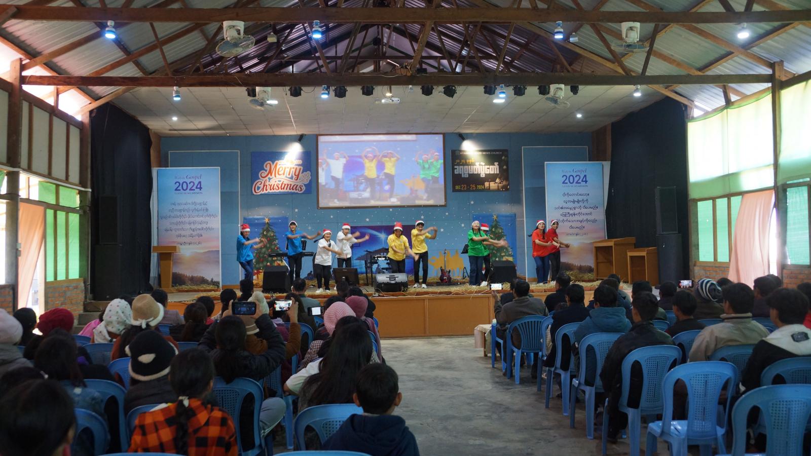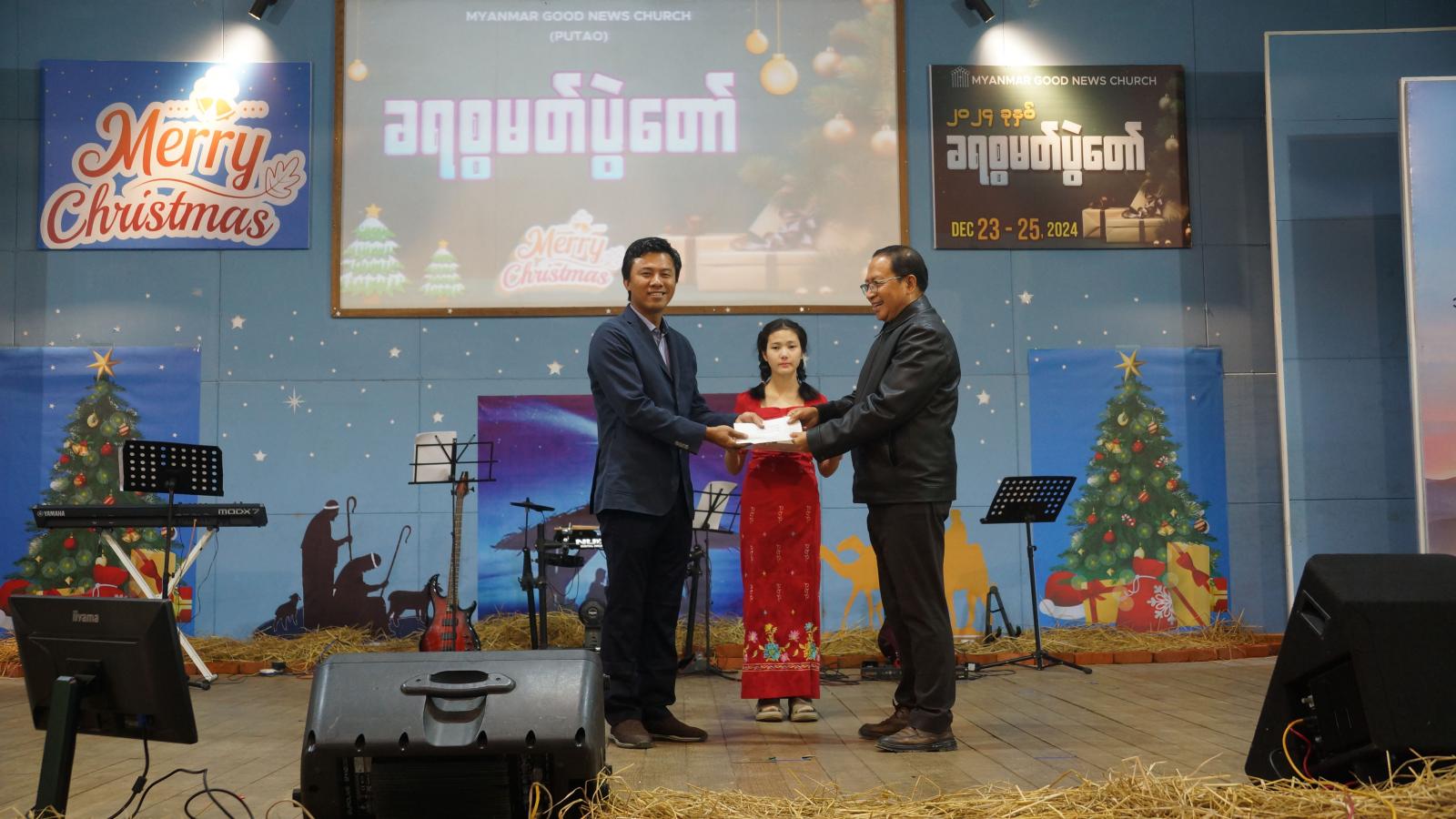 ဆက်လက်၍ ပြည်နယ်ဝန်ကြီးများနှင့် တာဝန်ရှိသူများသည် ပူတာအိုမြို့ လေယာဉ်ကွင်းရပ်ကွက်ရှိ Myanmar Good Newsအသင်းတော်မိသားစု ခရစ္စမတ်ပွဲသို့ တက်ရောက်ချီးမြှင့်ပြီး ကလေးသူငယ်များ၏ ခရစ္စမတ်အကအလှများဖြင့် ဖျော်ဖြေတင်ဆက်နေမှုများကို ကြည့်ရှုအားပေးကာ ပြည်နယ်ဝန်ကြီးများက ကချင်ပြည်နယ်အစိုးရအဖွဲ့က ခရစ္စမတ်ပွဲတော်အတွက် လှူဒါန်းငွေကျပ်(၁၀)သိန်းကို ပေးအပ်လှူဒါန်းသည်။