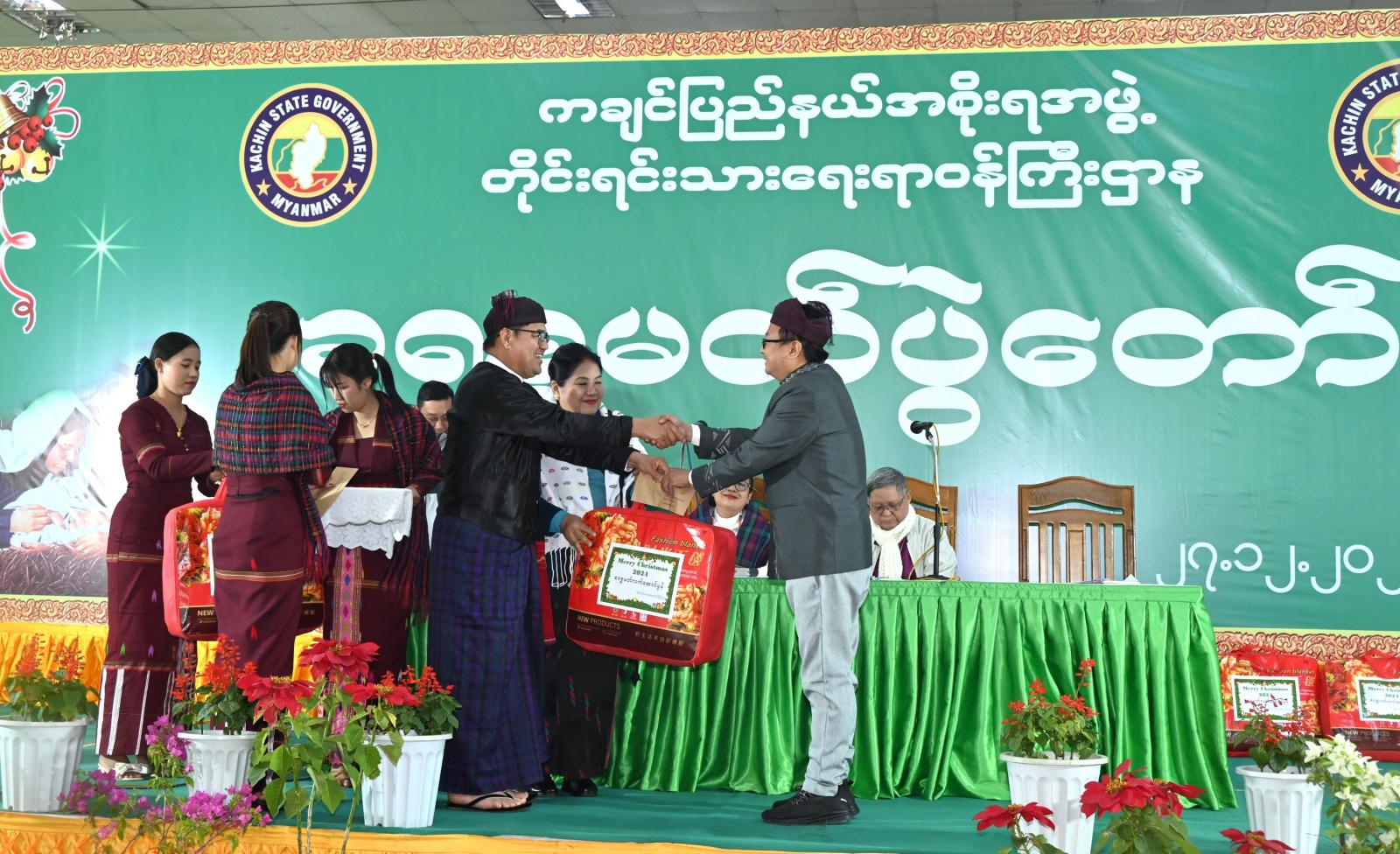 ယင်းနောက် ပြည်နယ်ဝန်ကြီးချုပ်နှင့် ဇနီးတို့ကဝတ်ပြုဆုတောင်းခြင်းအစီအစဉ်တွင် ပါဝင်ဆက်ကပ်ပေးကြသော သိက္ခာတော်ရဆရာများနှင့် ဘုန်းတော်ကြီးတို့အတွက် ခရစ္စမတ်လက်ဆောင် များကို ပေးအပ်ခဲ့ကြပြီး ပြည်နယ်တိုင်းရင်းသားရေးရာဝန်ကြီးနှင့် ဇနီးတို့က ပြည်နယ်အစိုးရအဖွဲ့ဝင် များ၊ အထူးဖိတ်ကြားထားသော ဧည့်သည်တော်များ၊ မြန်မာနိုင်ငံကချင်လူမျိုးရိုးရာယဉ်ကျေးမှု အသင်းချုပ်ဥက္ကဋ္ဌ အပါအဝင် ပြည်နယ်အတွင်းရှိ ကချင်မျိုးနွယ်စု (၆)မျိုး၊ ရှမ်းမျိုးနွယ်စု (၅)မျိုး၊ ဗမာတိုင်းရင်းသားစာပေနှင့် ယဉ်ကျေးမှုအသင်းများနှင့် ရခိုင်တိုင်းရင်းသား၊ ချင်းတိုင်းရင်းသားမျိုးနွယ်စု များအားလုံးအတွက် ခရစ္စမတ်လက်ဆောင်များကို ပေးအပ်ချီးမြှင့်ခဲ့ကြပြီး တက်ရောက်လာသူများ အား ခရစ္စမတ်နေ့လယ်စာကို အတူကတွ ရင်းနှီးနွေးထွေးစွာ သုံးဆောင်ခဲ့ကြသည်။