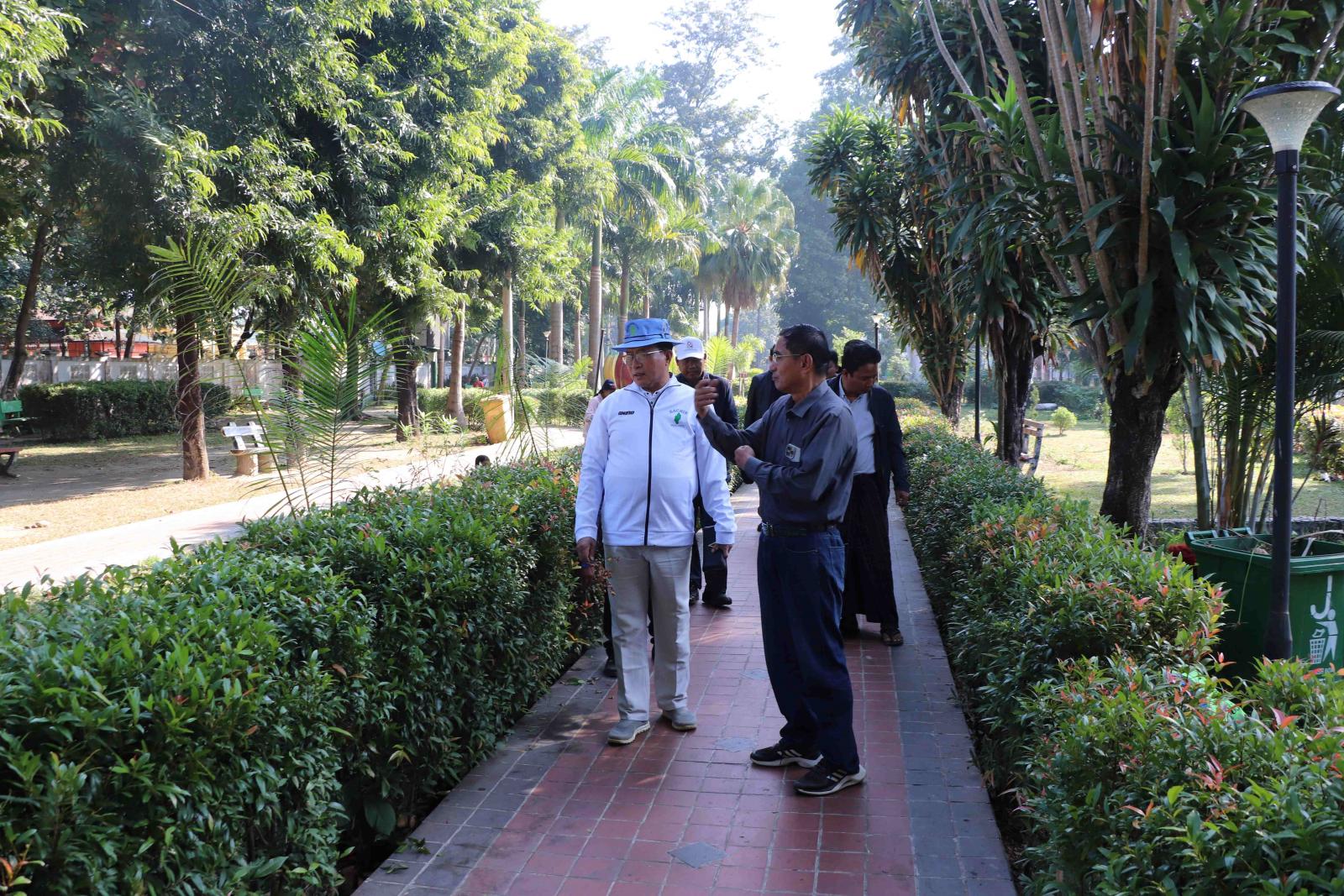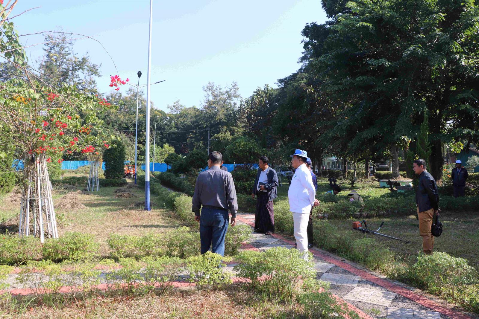 ထို့နောက် မြစ်ကြီးနားလေဆိပ်ရှေ့ရှိ မလိခပန်းခြံငယ်နှင့် အောင်ဇေရန်အောင်ဘုရားအနီးရှိ မေခပန်းခြံသို့ သွားရောက်ပြီး ပန်းခြံများအတွင်း အမှိုက်ကင်းစင်ရေးနှင့် စိမ်းလန်းစိုပြည်ရေးအတွက် သန့်ရှင်းရေး လုပ်ငန်းများဆောင်ရွက်နေမှုအခြေအနေများနှင့် မေခပန်းခြံရှိ Welcome to Myitkyina နှင့် ပုံဖော်ဆောင်ရွက်ထားသော ပန်းခြံစာသားတို့အား ရောင်စုံစလိုက်မီးများ ထွန်းညှိထားရှိရေးတို့ကို လှည့်လည်ကြည့်ရှုစစ်ဆေးခဲ့ကြပြီး ထိုမှတစ်ဆင့် မင်းရပ်ရပ်ကွက်ရှိ ပြည်သူ့ရင်ပြင်နှင့် ဧရာဦးပန်းခြံသို့ သွားရောက်ကာ ပြည်နယ်ဝန်ကြီးက သန့်ရှင်းရေးလုပ်ငန်းများ ဆောင်ရွက်နိုင်ရေးနှင့် ဒီဇင်ဘာ ၃၁ ရက်နေ့ ညသည် နှစ်သစ်ကူးညဖြစ်သည့်အတွက် ရောင်စုံအလှမီးများ ထွန်းညှိထားရှိရေး၊ အများ ပြည်သူ လွတ်လပ်စွာ အပန်းဖြေအနားယူနိုင်ရေး လိုအပ်သည်များ ကြိုတင်စီစဉ်ဆောင်ရွက်ထားရှိ ရေး တာဝန်ရှိသူများနှင့် ပေါင်းစပ်ဆောင်ရွက်ပေးခဲ့ကြောင်း သိရသည်။