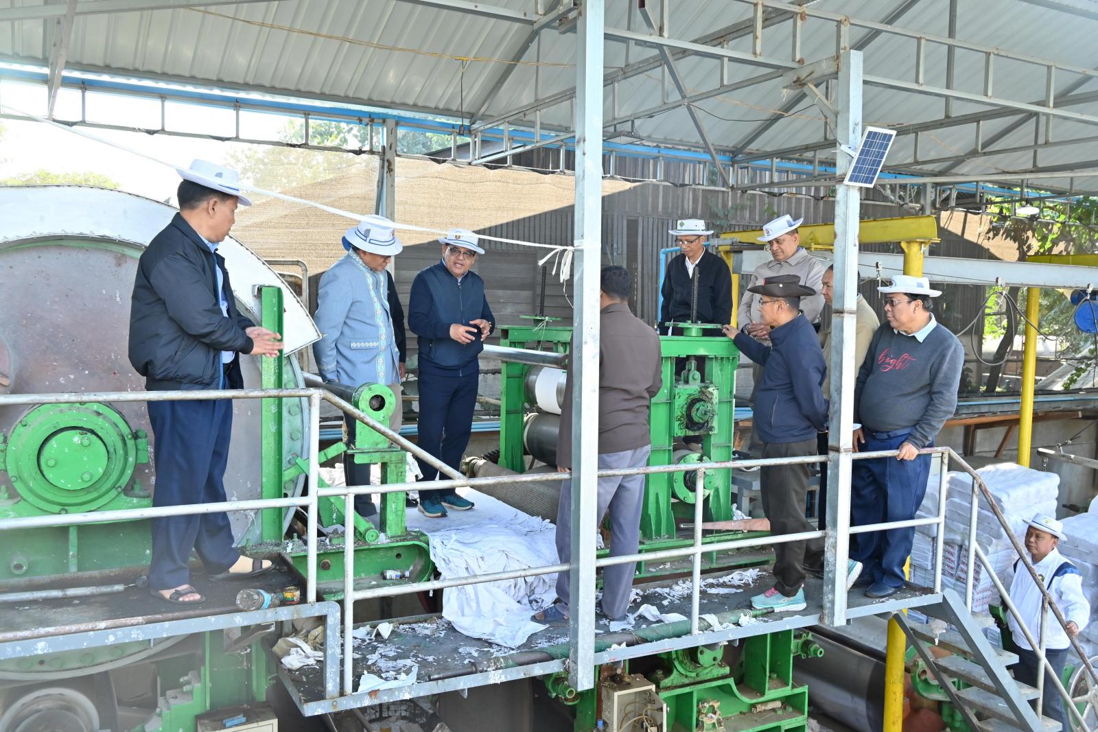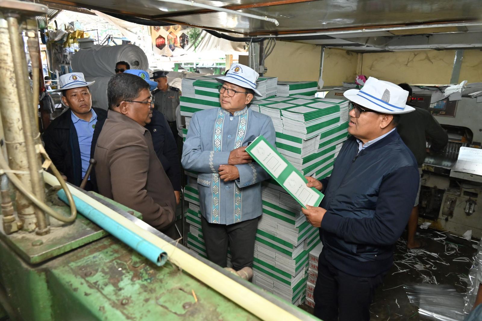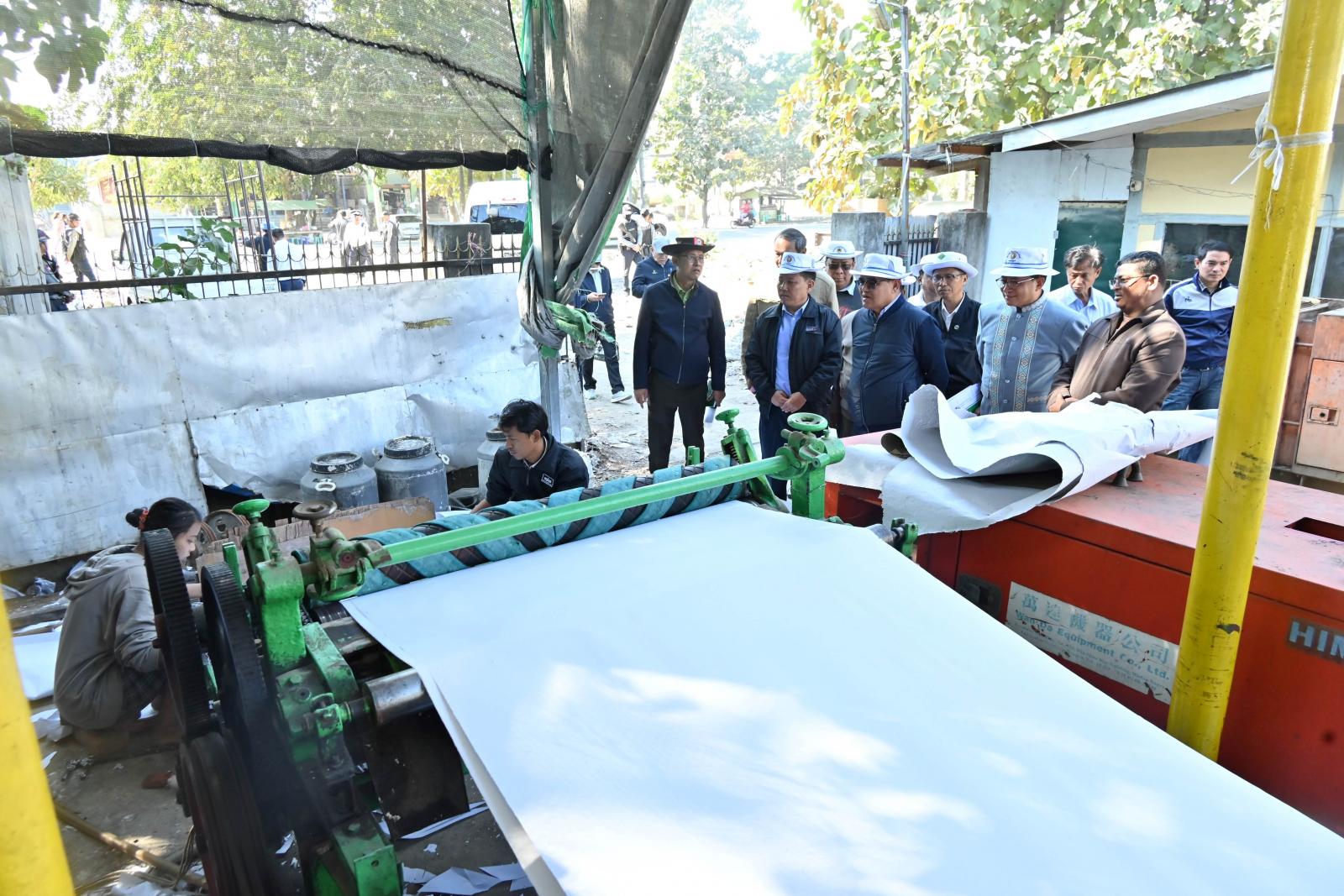ထိုမှတစ်ဆင့် ပြည်နယ်ဝန်ကြီးချုပ်သည် ပြည်နယ်ဝန်ကြီးများ၊ ပြည်နယ်အဆင့်ဌာနဆိုင်ရာ တာဝန်ရှိသူများနှင့်အတူ မြစ်ကြီးနားမြို့ စက်မှုဇုန်ရပ်ကွက်အတွင်းရှိ နိုင်ငံ့စီးပွားမြှင့်တင်ရေးရန်ပုံငွေ ဖြင့် ဆောင်ရွက်လျက်ရှိသည့်အပြင် ပြည်နယ်အတွင်း ပထမဆုံး နှစ်ဖက်ချောစက္ကူစာအုပ်ထုတ်လုပ် နိုင်ခဲ့သည့် ဖြိုးဝေဝေ စက္ကူနှင့် စာအုပ်ထုတ်လုပ်ရေးသမဝါယမအသင်းလီမိတက်ပိုင် စက်ရုံသို့ သွား ရောက်ခဲ့ကြပြီး စက်ရုံအတွင်း ပလပ်စတစ်၊ စက္ကူ၊ တစ်ရှူးငှက်ပျော စသည့် စွန့်ပစ်ပစ္စည်းများအား ပေါင်းခံစက်ဖြင့် စက္ကူကြမ်းထုတ်လုပ်၍ ထိုမှတစ်ဆင့် အဆင့်မြင့်စက်ကြီးများဖြင့် နှစ်ဖက်ချောစက္ကူ အဖြစ် ထုတ်လုပ်ဆောင်ရွက်နေမှု၊ အဆိုပါ နှစ်ဖက်ချောစက္ကူအား ကျောင်းသုံးဗလာစာအုပ်အဖြစ် ပြည်နယ်အတွင်း ဖြန့်ဝေနိုင်ရေး ရိုက်နှိက်၍ ထုတ်လုပ်/ ထုတ်ပိုးနေမှုလုပ်ငန်း အဆင့်ဆင့်တို့ကို လည်းကောင်း၊ ဒေသတွင်း ရောင်းချဖြန့်ဖြူးနေသည့် စက်ရုံထုတ် တစ်ရှူးစက္ကူထုတ်လုပ်နေမှုများကို လည်းကောင်း လှည့်လည်ကြည့်ရှုစစ်ဆေးခဲ့ကြပြီး လိုအပ်သည်များ ကူညီဆောင်ရွက်ပေးနိုင်ရေး တာဝန်ရှိသူများနှင့် ပေါင်းစပ်ဆောင်ရွက်ပေးခဲ့သည်။