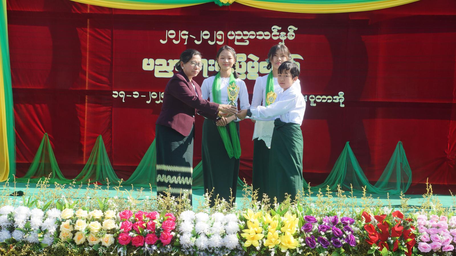 ဆက်လက်၍ ကျောင်းသား၊ ကျောင်းသူများက တေးသရုပ်ဖော်အကအလှများဖြင့်ဖျော်ဖြေတင်ဆက် ခဲ့ကြပြီး ခရိုင်စီမံအုပ်ချုပ်ရေးအဖွဲ့ အတွင်းရေးမှူး ခရိုင်ရဲတပ်ဖွဲ့မှူး ဒုတိယရဲမှူးကြီး သိန်းဆွေညွန့်နှင့် ခရိုင်/မြို့နယ်ဌာနဆိုင်ရာများက ၂၀၂၃-၂၀၂၄ ပညာသင်နှစ် တက္ကသိုလ်ဝင်တန်းစာမေးပွဲတွင် ဂုဏ်ထူးထွက်အောင်သင်ကြားပေးခဲ့သော ဆရာ၊ ဆရာမများအားလည်းကောင်း၊၂၀၂၃-၂၀၂၄ ပညာသင်နှစ် တက္ကသိုလ်ဝင်တန်းစာမေးပွဲတွင် ဂုဏ်ထူးဖြင့်အောင်မြင်ခဲ့သော ကျောင်းသား ကျောင်းသူများအားလည်းကောင်း၊ ၂၀၂၃-၂၀၂၄ ပညာသင်နှစ် ခရိုင်အဆင့်၊ မြို့နယ်အဆင့် လူရည်ချွန်ဆုရရှိသော ကျောင်းသား၊ ကျောင်းသူများအားလည်းကောင်း၊ ၂၀၂၃-၂၀၂၄ ပညာသင်နှစ်တွင် အတန်းအသီးသီးမှ ထူးချွန်စွာအောင်မြင်ခဲ့သော ကျောင်းသား ကျောင်းသူများအား လည်းကောင်း ဆုများအသီးသီး ပေးအပ်ချီးမြှင့်ကြသည်။