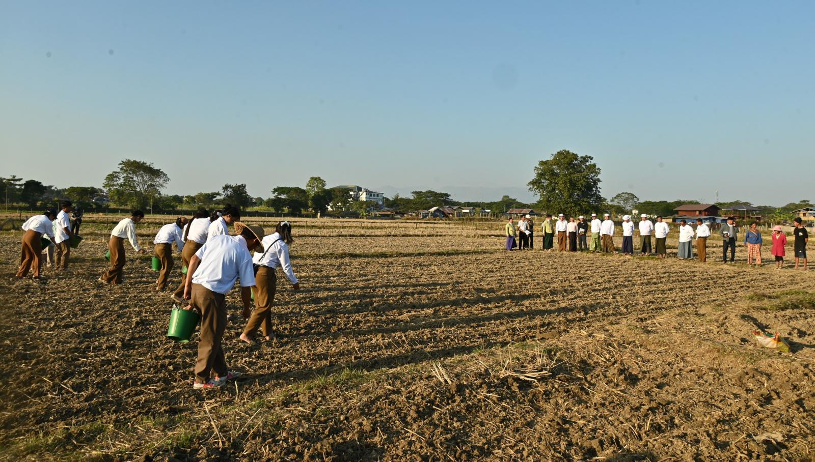 ယင်းနောက် ပြည်နယ်ဝန်ကြီးချုပ်နှင့် တာဝန်ရှိသူများသည် လယ်ကွင်းအတွင်းစိုက်ပျိုးရေးဦးစီးဌာနဝန်ထမ်းများက သီးထပ်အတွက်ဆောင်းဆီထွက်သီးနှံ နေကြာမျိုးစေ့များ တောင်သူ အသိပညာပေး ကြဲပက် သရုပ်ပြသမှုကို ကြည့်ရှုအားပေးခဲ့ကြသည်။