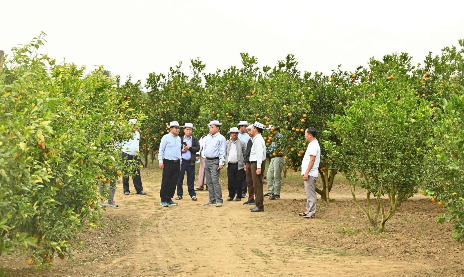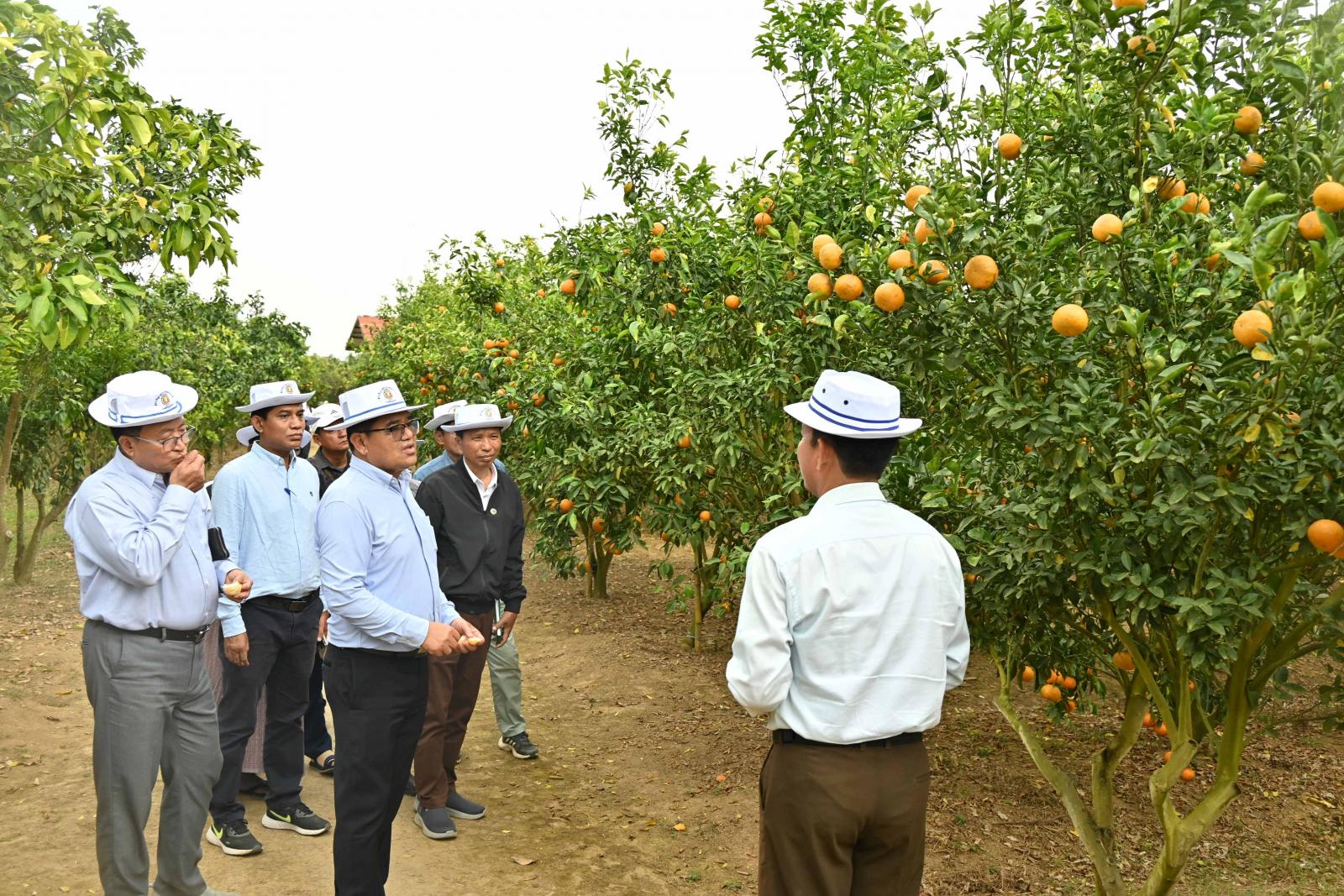 ယင်းနောက် အဆိုပါ ကျေးရွာအုပ်စုအတွင်းရှိ ဦးနော်ခမ်း၏ ခြံသို့ဆက်လက်သွားရောက်ကာ ခြံဝင်းမြေဧရိယာ (၁၈)ဧကပေါ်တွင် ဂျပန်လိမ္မော်သီးစိုက်ခင်းများအတွင်း အသီးများဖြင့် ဖြစ်ထွန်း အောင်မြင်လျက်ရှိသည့် အခြေအနေများ၊ ဘုရင်သီးပင်များ တွဲဖက်စိုက်ပျိုးထားရှိမှု၊ လိမ္မော်ပင်များအား ကိုင်းကူးစနစ်ဖြင့် ပျိုးထောင်၍ ရောင်းချစိုက်ပျိုးထားရှိမှု အခြေါအနေများကို လှည့်လည် ကြည့်ရှုစစ်ဆေးခဲ့ကြပြီး လိမ္မော်သီးများနှင့် ပျိုးပင်များအား ဈေးကွက်တင်ရောင်းချနိုင်မှု အခြေအနေများနှင့် စီးပွားဖြစ်ထွန်းမှု အခြေအနေများကို မေးမြန်းဆွေးနွေးကာ လိုအပ်သည်များကို တာဝန်ရှိသူ များနှင့် ပေါင်းစပ်ဆောင်ရွက်ပေးခဲ့သည်။