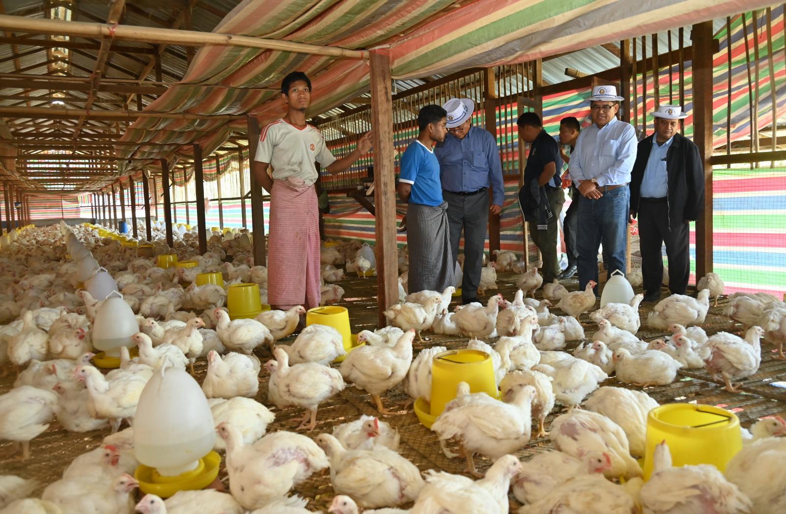 ထိုမှတစ်ဆင့် ပြည်နယ်ဝန်ကြီးချုပ်နှင့် အဖွဲ့ဝင်များသည် အဆိုပါကျေးရွာအုပ်စုအတွင်း နိုင်ငံ့စီးပွားမြှင့်တင်ရေးရန်ပုံငွေရင်းနှီးမတည်ပေးမှုဖြင့် အကျိုးဖြစ်ထွန်းအောင်မြင်လျက်ရှိသည့် ပိုင်ရှင် ဦးသိန်းဟန်၏ ကြက်ခြံသို့ သွားရောက်ပြီး ကြက်ခြံများအတွင်း ကြက်ကောင်ရေ (၉၀၀၀) မွေးမြူထား ရှိမှုအခြေအနေများကို ကြည့်ရှုစစ်ဆေးခဲ့ကြပြီး ကြက်များဈေးကွက်အတွင်း ရောင်းဝယ်ဖောက်ကားနိုင်မှု အခြေအနေများနှင့် တိုးချဲ့မွေးမြူနိုင်ရေး လိုအပ်သည်များ ကူညီပေးနိုင်ရေး ဌာနဆိုင်ရာတာဝန်ရှိသူများနှင့် ပေါင်းစပ်ညှိနှိုင်းဆောင်ရွက်ပေးခဲ့ကာ မွေးမြူရေးအထောက်အကူပြု ဆေးဝါးပစ္စည်းများ နှင့်တိရစ္ဆာန်အားဖြည့် ဖြည့်စွက်အစာအိတ်များကို ပေးအပ်ခဲ့ကြကြောင်း သိရသည်။