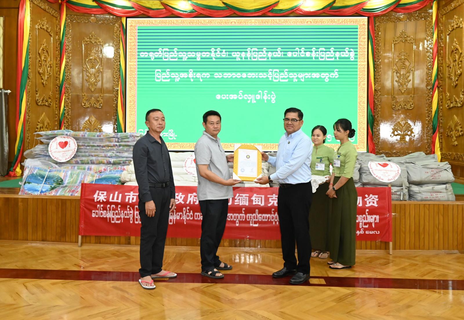 အဆိုပါ အခမ်းအနားတွင် ပြည်နယ်ဝန်ကြီးချုပ် ဦးခက်ထိန်နန်က တရုတ်ပြည်သူ့သမ္မတနိုင်ငံ ယူနန်ပြည်နယ်၊ ပေါင်စန်းပြည်နယ်ခွဲ ပြည်သူ့အစိုးရထံမှ ပေးပို့လှူဒါန်းလာသော ယာယီတဲအိမ် (အဆောင်သေး) ၁၀၀ စုံနှင့် မိုးကာလိပ် ၃၁၂ လိပ်ကို ကိုယ်စားလှယ်အဖွဲ့ထံမှ လွှဲပြောင်းပေးအပ်လှူဒါန်းမှုကို လက်ခံရယူပြီး ကျေးဇူးတင်ဂုဏ်ပြုမှတ်တမ်းလွှာများကို ပြန်လည်ပေးအပ်သည်။