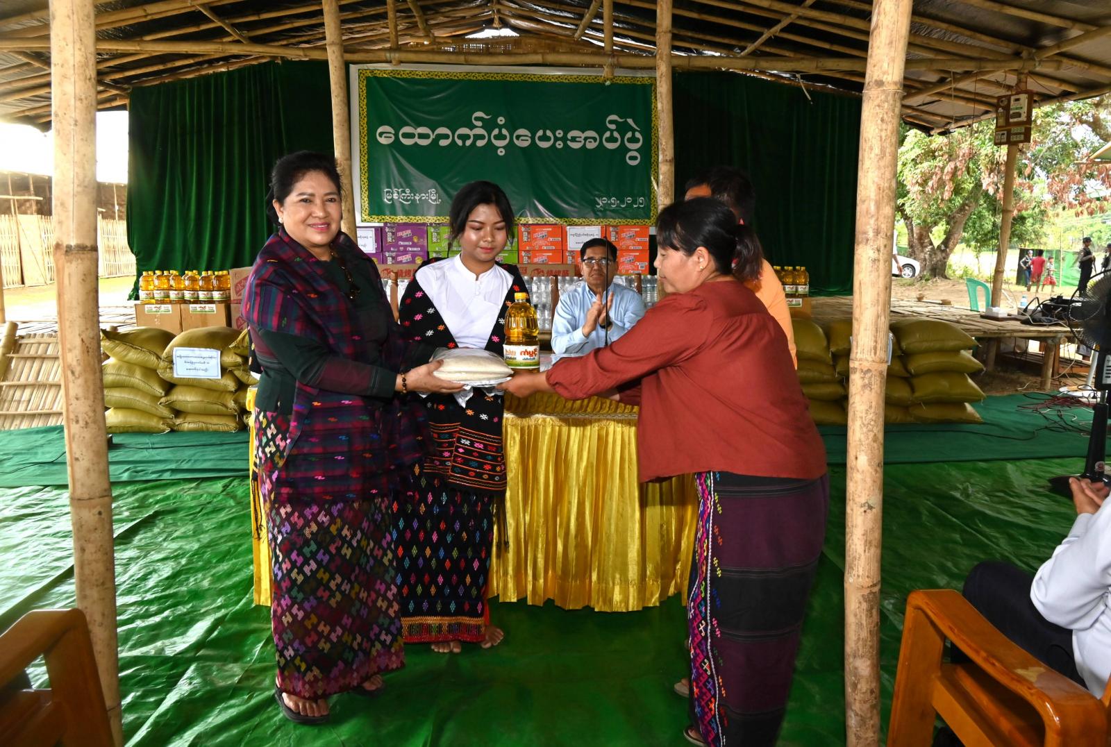ထို့နောက် နိုင်ငံတော်စီမံအုပ်ချုပ်ရေးကောင်စီအဖွဲ့ဝင် ဒေါ်ဒွဲဘူနှင့် ပြည်နယ်ဝန်ကြီးချုပ်တို့က အဆိုပါစခန်းအတွင်းရှိ အိမ်ထောင်စု (၅၀)၊ လူဦးရေ (၂၈၁)ဦးတို့အတွက် အမျိုးသားသဘာဝ ဘေးအန္တရာယ်စီမံခန့်ခွဲမှုကော်မတီက ထောက်ပံ့ပေးအပ်သည့် ဆန် (၂၄)ပြည်ပါ ဆန်အိတ် (၅၀) အိတ်နှင့် ပြည်နယ်အစိုးရအဖွဲ့က ထောက်ပံ့ပေးအပ်သည့် ဆီပိဿာ (၅၀)၊ ရေသန့်ကတ်(၅၀)၊ ခေါက်ဆွဲခြောက်ဖာ (၅၀)၊ အဆင့်စားဆန်ပြုတ်ထုတ်(၁၂)ဖာနှင့် အသားချောင်း (၁၀)ဖာတို့ကို အသီးသီးထောက်ပံ့ပေးအပ်ခဲ့ကြရာ စခန်းတာဝန်ခံက ကျေးဇူးတင်စကားနှင့် လျှပ်စစ်မီး လိုအပ်ချက်၊ အဝင်/ အထွက်လမ်း သဲကျောက်ခင်းပေးနိုင်ရေးနှင့် ပညာရေး၊ ကျန်းမာရေးစောင့်ရှောက်မှုဆိုင်ရာ လိုအပ်ချက်များကိုတင်ပြရာ နိုင်ငံတော်စီမံအုပ်ချုပ်ရေးကောင်စီအဖွဲ့ဝင်နှင့် ပြည်နယ်ဝန်ကြီးချုပ်က လိုအပ်သည်များကို ဌာနဆိုင်ရာတာဝန်ရှိသူများနှင့် ပေါင်းစပ်ညှိနှိုင်း၍ ဖြည့်ဆည်းဆောင်ရွက်ပေး ခဲ့သည်။