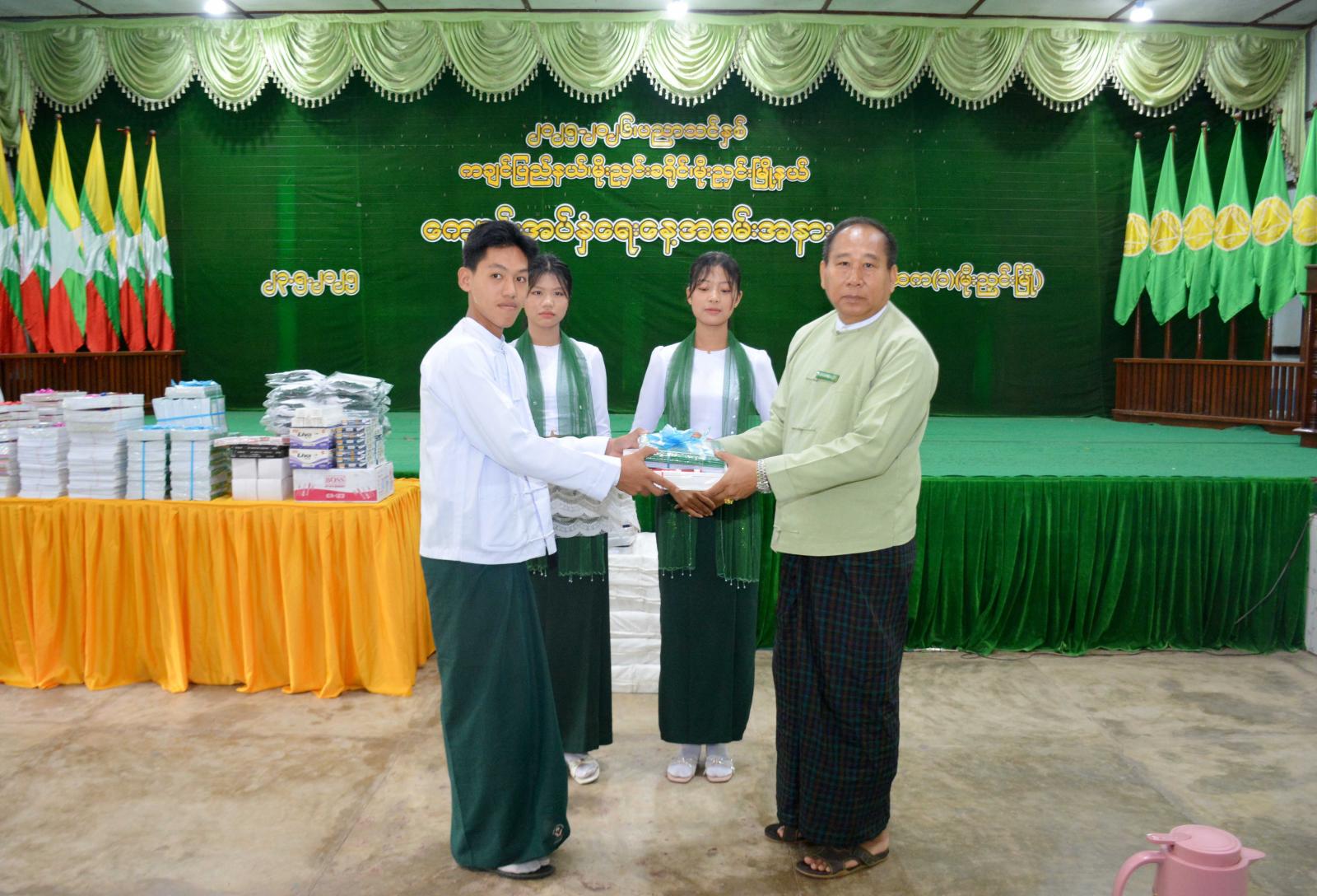 ဆက်လက်၍ ပညာရေးဝန်ကြီးဌာနမှ ကျောင်းသား ကျောင်းသူများအတွက် အခမဲ့ ထောက်ပံ့ ပေးအပ်သည့် ပုံနှိပ်၊ ဗလာစာအုပ်၊ ကျောင်းဝတ်စုံနှင့် စာရေးကိရိယာများကို လည်းကောင်း၊ ၂၀၂၅ ခုနှစ် တက္ကသိုလ်ဝင်စာမေးပွဲပြန်လည်ဖြေဆိုမည့် ကျောင်းသား ကျောင်းသူများအား ဗလာစာအုပ်နှင့် စာရေးကိရိယာများကိုလည်းကောင်း ခရိုင်စီမံအုပ်ချုပ်ရေးအဖွဲ့ဥက္ကဋ္ဌ ဦးညီညီလွင်နှင့် သက်ဆိုင်ရာ တာဝန်ရှိသူများက အသီးသီးပေးအပ်ကြပြီးနောက် အ.ထ.က(၃)ကျောင်းမှ ကျောင်းသား ကျောင်းသူ များက “ပြည်မြန်မာ”တေးသီချင်းဖြင့် သီဆိုဖျော်ဖြေ၍ အခမ်းအနားကို ပိတ်သိမ်းခဲ့ကြောင်း သိရသည်။