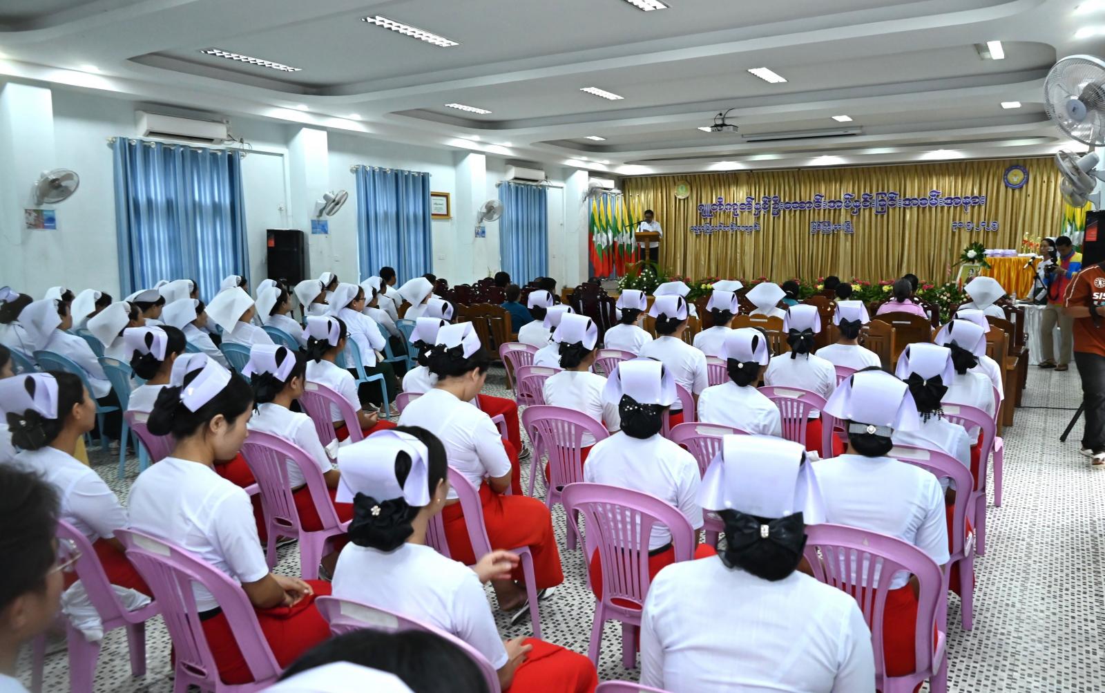 ရှေးဦးစွာ ပြည်နယ်ဝန်ကြီးချုပ် ဦးခက်ထိန်နန်က နိုင်ငံတစ်နိုင်ငံ ဖွံ့ဖြိုးတိုးတက်ရေး အတွက် ကဏ္ဍပေါင်းစုံ ဖွံ့ဖြိုးတိုးတက်ရမည်ဖြစ်သကဲ့သို့ အဆိုပါ ကဏ္ဍများအနက် ကျန်းမာရေး စောင့်ရှောက်မှုပေးသည့် ကဏ္ဍသည် အရေးကြီးသည့် ကဏ္ဍတစ်ရပ်ပင် ဖြစ်ပါကြောင်း၊ သို့ဖြစ်ပါ၍ ယနေ့ သူနာပြုအတတ်ပညာကို သင်ယူနေကြသည့် သင်တန်း သား၊ သင်တန်းသူများအနေဖြင့် သူနာပြုကောင်းများ ဖြစ်လာစေရန် အတတ်ပညာများကို ကျွမ်းကျင်အောင် လေ့လာဆည်းပူးပြီး ကျင့်ဝတ်များကို ထိန်းသိမ်းရန် လိုအပ်ပါကြောင်း၊ ထို့အပြင် သူနာပြုတစ်ဦး၏ ကျင့်ဝတ်နှင့်အညီ ပြုမှုပြောဆို ကျင့်ကြံ့နေထိုင်လျက် သစ္စာအဓိဌာန်ပါအတိုင်း မိမိတို့ သင်ယူတတ်မြောက်ခဲ့သော အတတ်ပညာဖြင့် ပြည်သူများအား အရည်အသွေးပြည့်ဝစွာဖြင့် ကျန်းမာရေးစောင့်ရှောက်မှုပေးနိုင်ရေး ကြိုးစားအားထုတ်ကြရန် လိုအပ်ပါကြောင်း တိုက်တွန်းမှာကြားသည်။