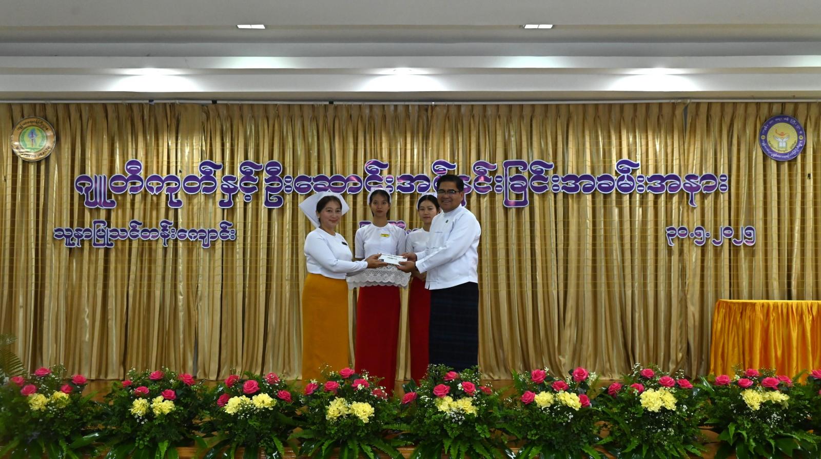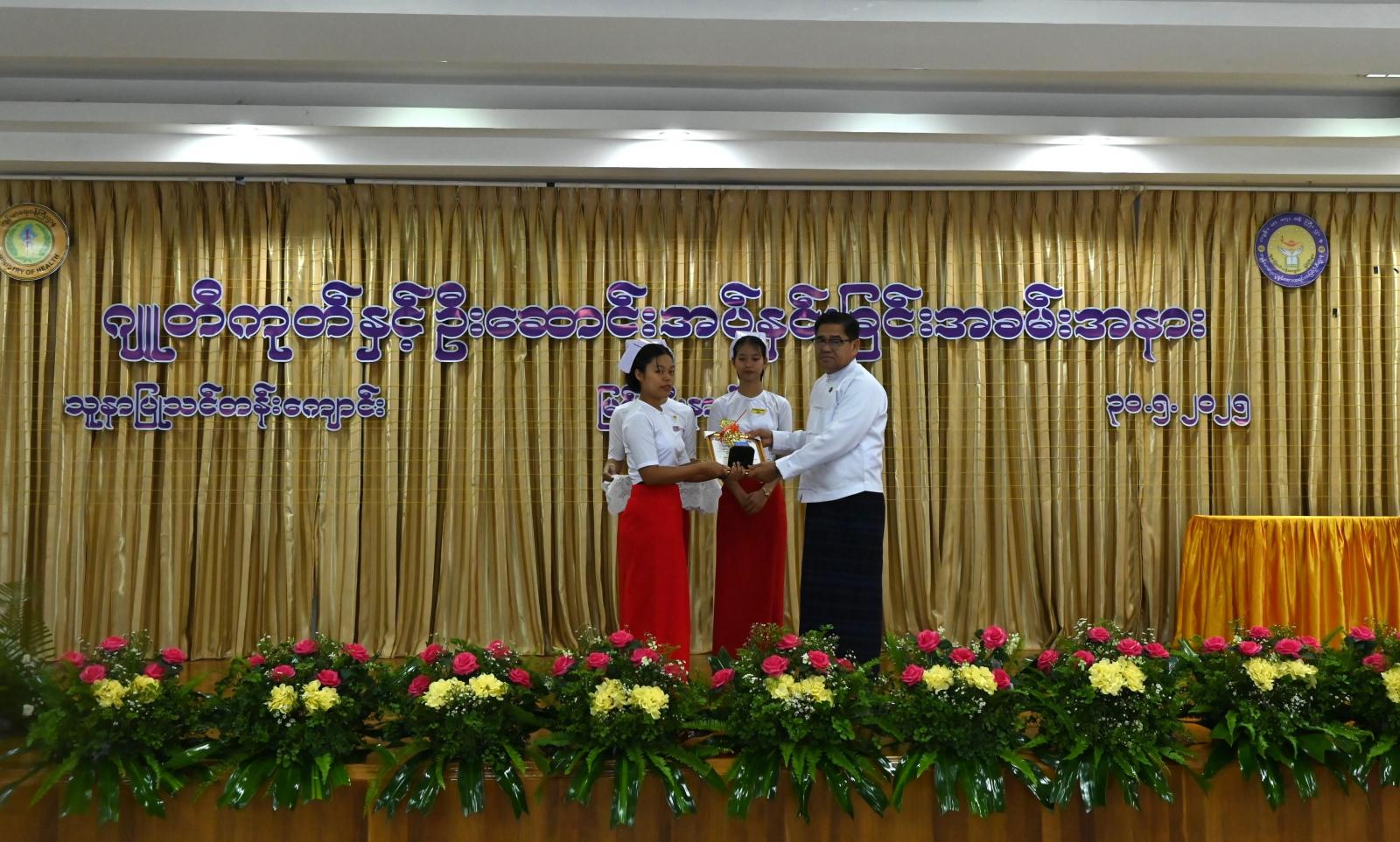 ယင်းနောက် ပြည်နယ်ဝန်ကြီးချုပ်က ပထမနှစ် သင်တန်းသား/ သင်တန်းသူများအနက် ဒီပလိုမာ အရည်အချင်းစစ် စာမေးပွဲတွင် ပထမ၊ ဒုတိယနှင့် တတိယဆုရရှိသည့် သင်တန်းသူများ အား ဂုဏ်ပြုဆုတံဆိပ်၊ ဂုဏ်ပြုမှတ်တမ်းလွှာနှင့် ဂုဏ်ပြုချီးမြှင့်ငွေများကို လည်းကောင်း၊ သူနာပြုသားဖွားသင်တန်းကျောင်းအတွက် ချီးမြှင့်ငွေကျပ်သိန်း ၂၀ ကို လည်းကောင်း ပေးအပ်ချီးမြှင့်ခဲ့ သည်။