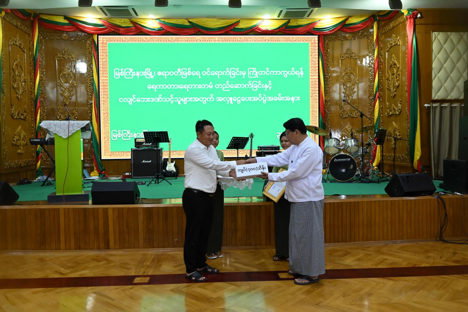 ဆက်လက်၍ ပြည်နယ်စီးပွားရေးရာဝန်ကြီး ဦးမျိုးဆွေက မြစ်ကြီးနားမြို့ ဧရာဝတီမြစ်ရေ ဝင်ရောက်ခြင်းမှ ကြိုတင်ကာကွယ်ရန်အတွက် ရေကာတာ၊ ရေတားတမံများ တည်ဆောက်နိုင်ရေးနှင့် ငလျင်ဘေးဒဏ်သင့် ဒေသများမှ ပြည်သူများအား ကူညီထောက်ပံ့နိုင်ရေးအတွက် ဒေသ တွင်း ကုမ္ပဏီလုပ်ငန်းရှင်များနှင့် အသင်းအဖွဲ့များမှ တာဝန်ရှိသူများက စုစုပေါင်း အလှူငွေကျပ် သိန်း (၃၆၅၀)ကို အသီးသီးပေးအပ်လှူဒါန်းမှုကို လက်ခံရယူပြီး ကျေးဇူးတင်ဂုဏ်ပြုမှတ်တမ်းလွှာ များပေးအပ်ခဲ့သည်။