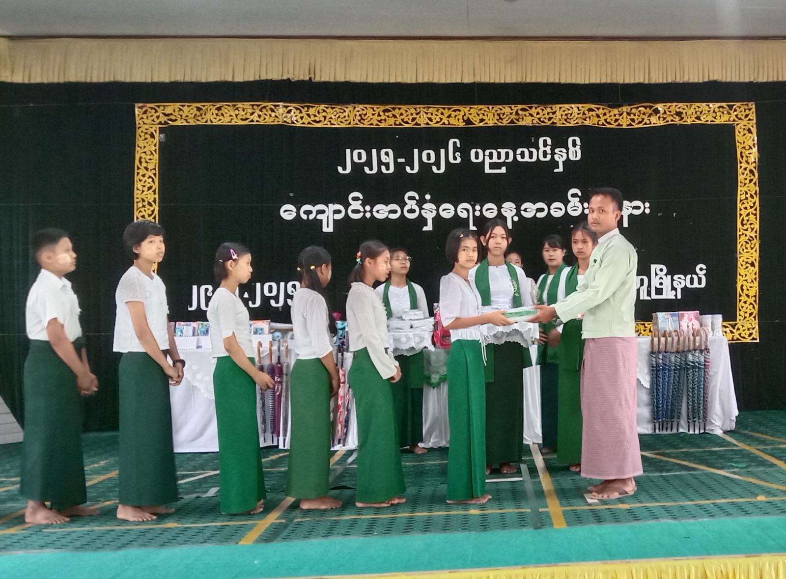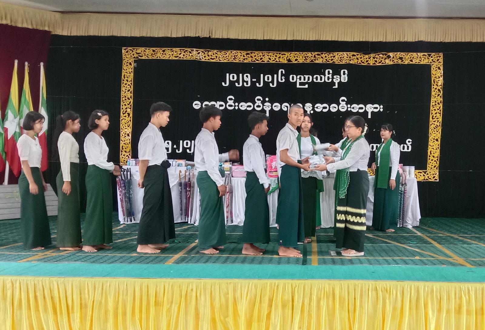 ယင်းနောက် မြို့နယ်ပညာရေးမှူး ဒေါ်မြတ်နွယ်က ကျောင်းနေအရွယ်ကလေးတိုင်း ကျောင်းအပ်နှံရေးအခွင့်အလမ်းများရရှိပြီး လူတိုင်းအခြေခံပညာသင်ယူခွင့်ရရှိစေရန်၊ ကျောင်းတက်၊ ကျောင်းနေနှုန်းမြင့်မားလာစေရန်နှင့် ကျောင်းအပ်နှံရေးလုပ်ငန်းစဉ်များကို ရှင်းလင်းဆွေးနွေးပြောကြားခဲ့ပြီး အခမ်းအနားသို့ တက်ရောက်လာသည့် ကျောင်းသား၊ ကျောင်းသူများအား ပညာရေးဌာနနှင့် မြို့နယ်စီမံအုပ်ချုပ်ရေးအဖွဲ့မှ ထောက်ပံ့သည့် ဗလာစာအုပ်၊ ခဲတံ၊ ဘောပင်၊ ပေတံ၊ ကျောင်းဝတ်စုံများ၊ စေတနာရှင်အလှူရှင်များမှ ကျောပိုးအိတ်၊ ထီး၊ ထမင်းချိုင့်၊ ကွန်ပါဘူးနှင့် ထောက်ပံ့ငွေများကို ထောက်ပံ့ပေးအပ်ခဲ့ကြကြောင်း သိရှိရသည်။