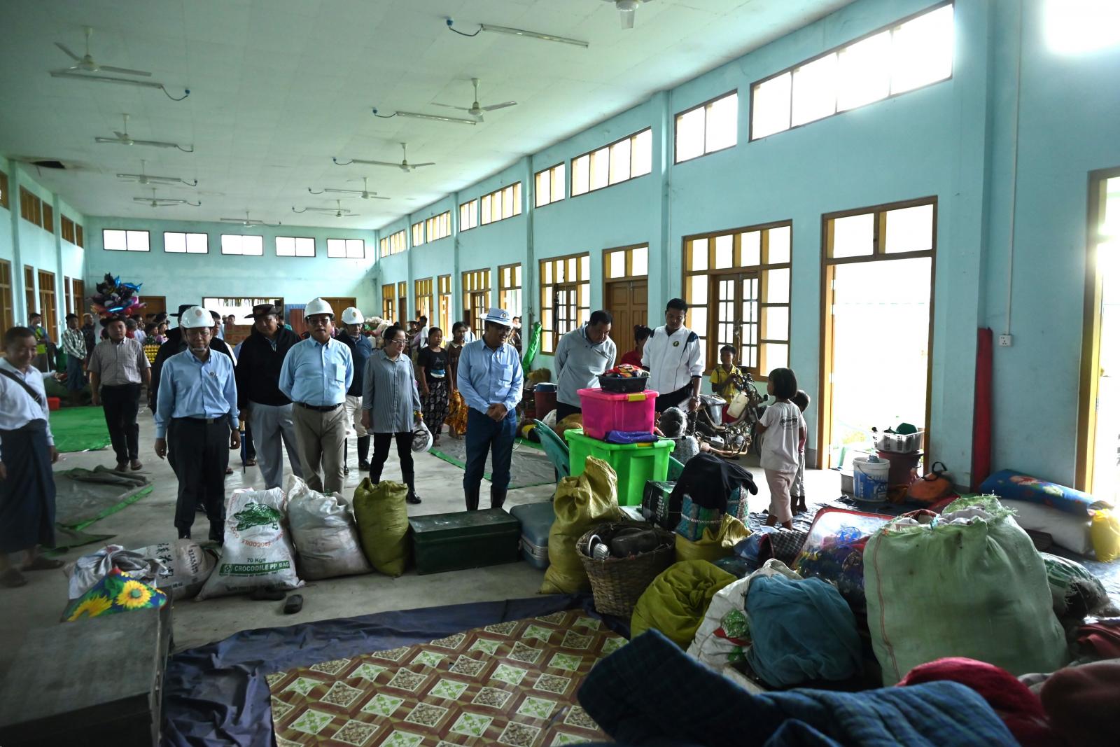 ထိုမှတစ်ဆင့် ပြည်နယ်ဝန်ကြီးချုပ်နှင့်အဖွဲ့ဝင်များသည် လယ်ကုန်း(ဇီးလွန်)ရပ်ကွက် အမှတ် (၁၂) အခြေခံပညာအထက်တန်းကျောင်း၌ ရေဘေးကယ်ဆယ်ရေးစခန်းဖွင့်လှစ်၍ လယ်ကုန်း၊ ကြက် ပေါင်ခြံရပ်ကွက်နှင့် ရမ်ပူမြေနိမ့်ပိုင်းများမှ ရွေ့ပြောင်းကယ်ဆယ်ထားသည့် အိမ်ထောင်စု(၁၅၁)စု၊ လူဦးရေ ၁၂၂၈ ဦးတို့အား နေရာချထားပေးသည့် အခြေအနေများကို လိုက်လံကြည့်ရှုစစ်ဆေးခဲ့ကြပြီး ပြည်သူများအား အားပေးစကားပြောကြားကာ မိသားစုအတွက် ဆန်၊ ဆီ၊ ကြက်ဥနှင့် အသင့်စားသုံး နိုင်သော ခေါက်ဆွဲခြောက်၊ ဆန်ပြုတ်ဘူးများနှင့် ရေသန့်ဘူးများကို ထောက်ပံ့ပေးအပ်ခဲ့ကြသည်။