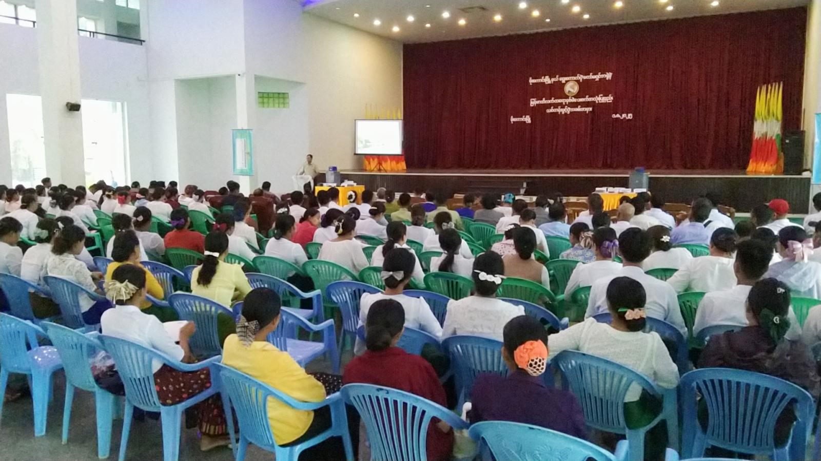 သင်တန်းဖွင်ပွဲအခမ်းအနားကို မြို့နယ်စီမံခန့်ခွဲရေးနှင့်အုပ်ချုပ်ရေးကော်မတီဥက္ကဋ္ဌ ဦးသီဟဇော်က အဖွင့်အမှာစကားပြောကြားပြီး မြို့နယ်ရွေးကောက်ပွဲကော်မရှင်အဖွဲ့ခွဲမှ ဦးစီးအရာရှိ ဒေါ်သူဇာဝင်းက သင်တန်းနှင့်ပတ်သက်၍ power point ဖြင့် ရှင်းလင်းတင်ပြသည်။