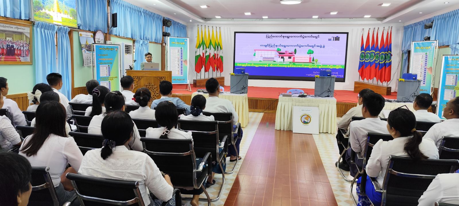 ကချင်ပြည်နယ် ရွေးကောက်ပွဲကော်မရှင်အဖွဲ့ခွဲအနေဖြင့် ပြည်နယ်အတွင်း မြန်မာအီလက်ထရောနစ်မဲပေးစက် (MEVM) အသုံးပြုနည်းသင်တန်းများနှင့် မဲပေးစက်အသုံးပြု လက်တွေ့စမ်းသပ်မဲပေးခြင်းများ ဆောင်ရွက်လျက်ရှိသည့်အပြင် သြဂုတ် ၁ ရက်နေ့ နံနက် ၉ နာရီခွဲကလည်း မြန်မာအီလက်ထရောနစ်မဲပေးစက်အသုံးပြုမည့် ဘထ္ထရီများအတွက် ဘထ္ထရီအားသွင်းစက်အသုံးပြုနည်းသင်တန်းကို ပြည်နယ်ရွေးကောက်ပွဲကော်မရှင်အဖွဲ့ခွဲရုံး အစည်းအဝေးခန်းမ၌ ကျင်းပပြုလုပ်သည်။