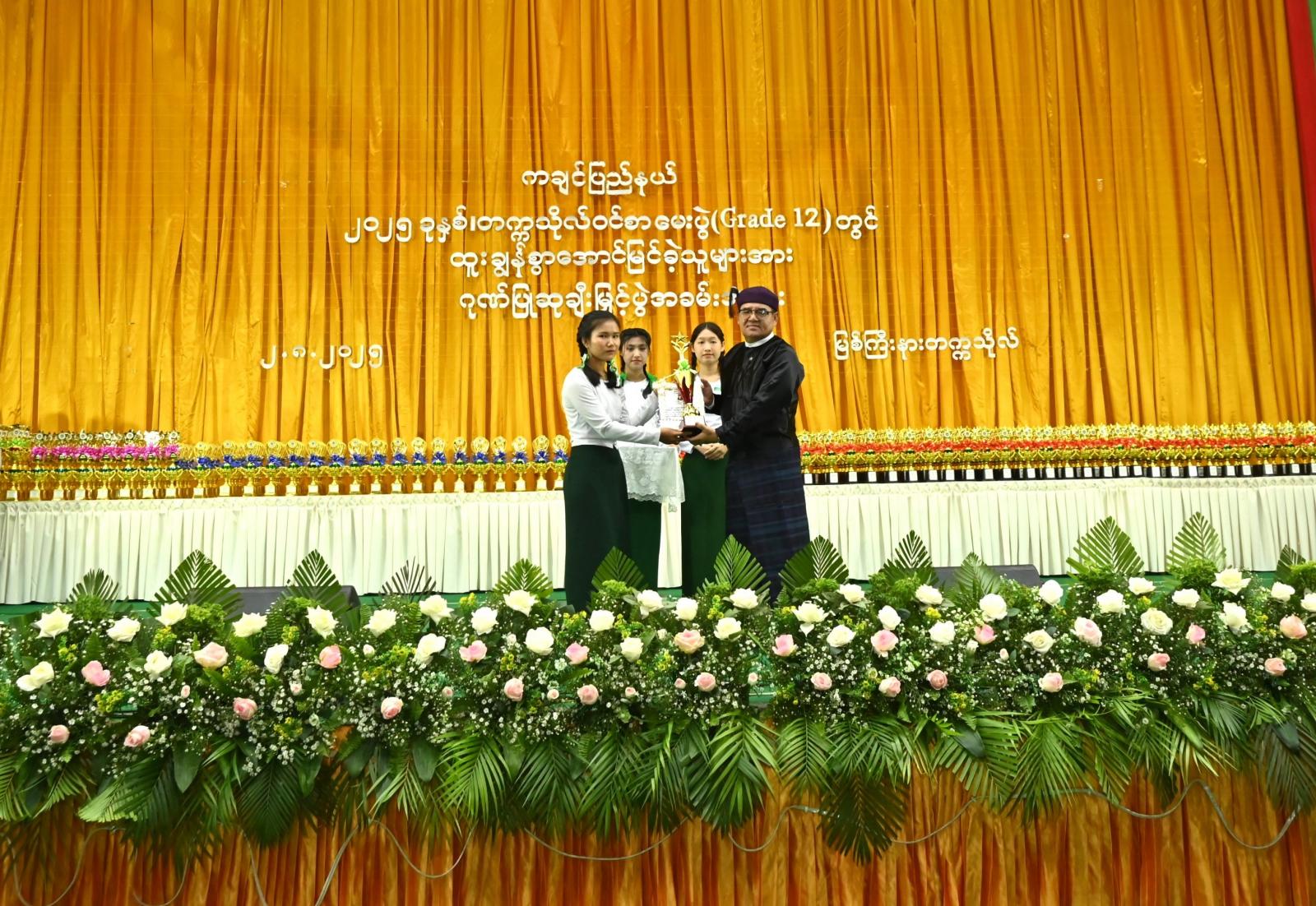 ကချင်ပြည်နယ်အတွင်း ၂၀၂၅ ခုနှစ်၊ တက္ကသိုလ်ဝင်စာမေးပွဲကို ခရိုင်(၆)ခရိုင်၊ မြို့နယ်(၁၂) မြို့နယ်ရှိ စာစစ်ဌာန (၂၂)ခုတွင် ဝင်ရောက်ဖြေဆိုသူ (၈၅၈၄) ဦးအနက် (၄၁၀၀)ဦး အောင်မြင်ခဲ့ သဖြင့် အောင်ချက်ရာခိုင်နှုန်း (၄၇ ဒဿမ ၇၆)ရရှိခဲ့ပြီး နိုင်ငံတော်အဆင့်တွင် အဋ္ဌမအဆင့် ရရှိခဲ့ပြီး (၆)ဘာသာဂုဏ်ထူးရှင်(၁၄)ဦး၊ (၅)ဘာသာဂုဏ်ထူးရှင်(၃၉)ဦး၊ (၄)ဘာသာဂုဏ်ထူးရှင်(၁၀၂)ဦး၊ (၃)ဘာသာဂုဏ်ထူးရှင်(၂၁၅)ဦး၊ (၂)ဘာသာဂုဏ်ထူးရှင်(၃၁၁)ဦးနှင့် (၁) ဘာသာဂုဏ်ထူးရှင်(၈၁၆)ဦးတို့ဖြင့် စုစုပေါင်းဂုဏ်ထူးရှင်(၁၄၉၇)ဦးရရှိခဲ့သည့်အပြင် ဝိဇ္ဇာဘာသာတွဲ နိုင်ငံတော်အဆင့် Top-10 စာရင်းတွင် ကချင်ပြည်နယ်မှပထမအဆင့်ရရှိခဲ့ကြောင်းနှင့် ယနေ့အခမ်းအနားတွင်(၃)ဘာသာ ဂုဏ်ထူးရရှိသူများအထိ ဂုဏ်ပြုချီးမြှင့်ခဲ့ခြင်းဖြစ်ပြီး နှစ်သာသာနှင့်တစ်ဘာသာဂုဏ်ထူးရှင်များကို နေအိမ်များအရောက် လိုက်လံပို့ဆောင် ဂုဏ်ပြုချီးမြှင့်ပေးအပ်သွားမည်ဖြစ်ကြောင်း သိရသည်။