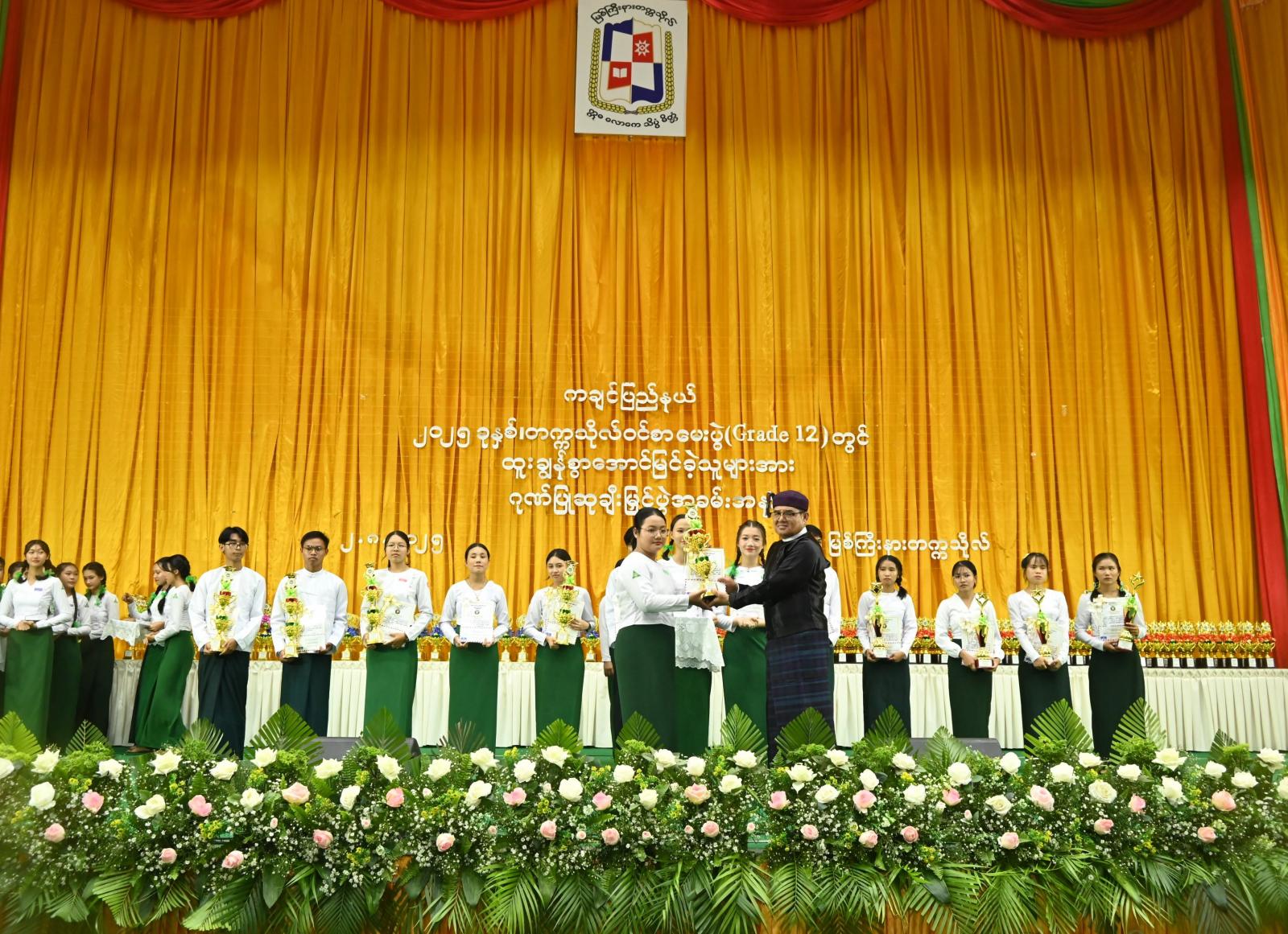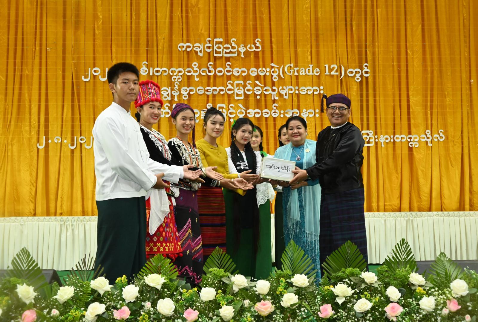 ကချင်ပြည်နယ်အတွင်း ၂၀၂၅ ခုနှစ်၊ တက္ကသိုလ်ဝင်စာမေးပွဲတွင် ထူးချွန်စွာအောင်မြင်ခဲ့ကြသည့် ကျောင်းသား/ကျောင်းသူများအား ပညာရည်ချွန်ဆုချီးမြှင့်ပွဲအခမ်းအနားကို မြစ်ကြီးနား တက္ကသိုလ်ဘွဲ့နှင်းသဘင်ခန်းမ၌ သြဂုတ် ၂ ရက် နံနက် ၁၀ နာရီက ကျင်းပပြုလုပ်ရာ အခမ်းအနားကို အခြေခံပညာကျောင်းများမှကျောင်းသား/ကျောင်းသူလေးများက “ဘက်စုံပညာကိုယ်ရည်ဒို့လှမ်းချီ” တေးသီချင်း၊တိုင်းရင်းသားရိုးရာအကအလှများဖြင့်သီဆိုဖျော်ဖြေဖွင့်လှစ်ပေးကြသည်။