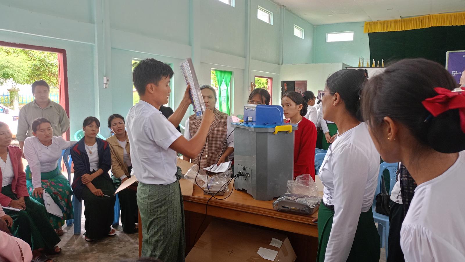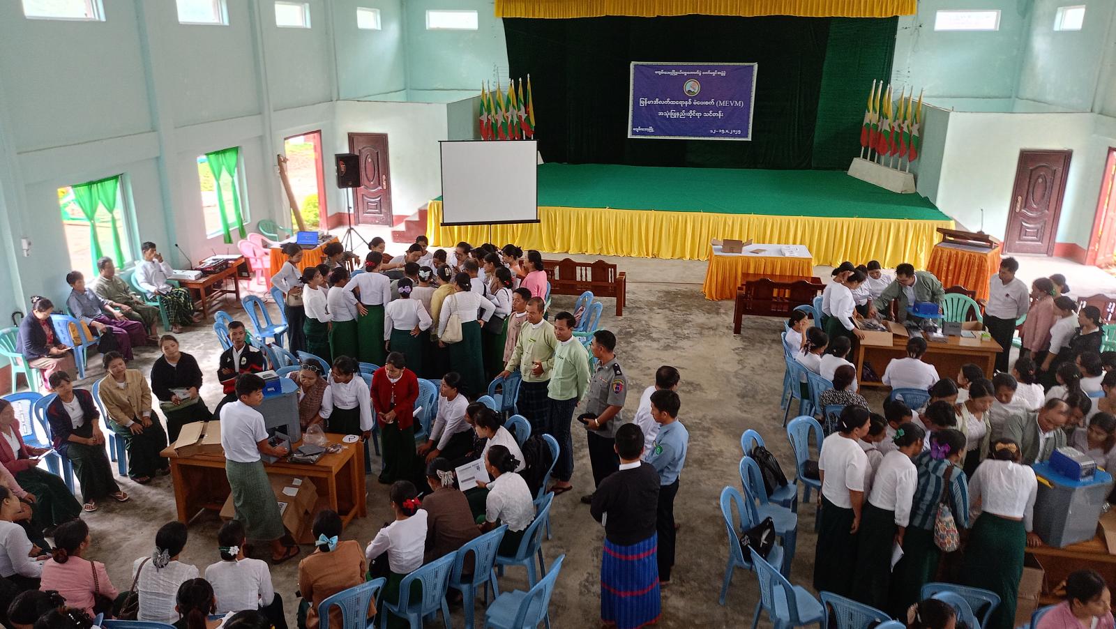 ကချင်ပြည်နယ်၊ ပူတာအိုခရိုင်၊ မချမ်းဘောမြို့တွင် မကြာမီကျင်းပပြုလုပ်မည့် ပါတီစုံဒီမိုကရေစီအထွေထွေရွေးကောက်ပွဲတွင် မြန်မာအီလက်ထရောနစ်မဲပေးစက်ကို ကျွမ်းကျင်စွာ အသုံးပြုနိုင်ရန်ရည်ရွယ်၍ မြန်မာအီလက်ထရောနစ် မဲပေးစက်(MEVM)အသုံးပြုနည်းဆိုင်ရာသင်တန်းကို ယမန်နေ့နံနက် ၉ နာရီက ဂူဘားခန်းမ၌ ကျင်းပခဲ့သည်။