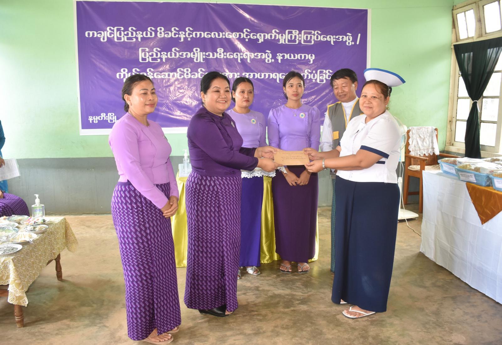 ထို့နောက် ပြည်နယ်မိခင်နှင့် ကလေးစောင့်ရှောက်မှုကြီးကြပ်ရေးအဖွဲ့ နာယကက ကိုယ်ဝန်ဆောင်မိခင်များအား အားပေးစကားပြောကြားပြီး နာယကနှင့် အဖွဲ့ဝင်များက အာဟာရပြည့် စားသောက်ဖွယ်ရာများနှင့် တိုက်နယ်ဆေးရုံ ကျန်းမာရေးဝန်ထမ်းများအတွက် ချီးမြှင့်ငွေများကို အသီးသီးထောက်ပံ့ပေးအပ်ခဲ့ကြသည်။