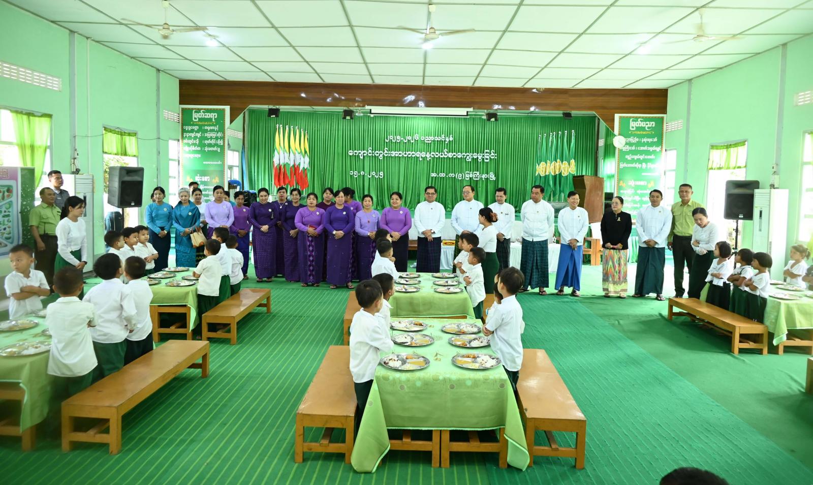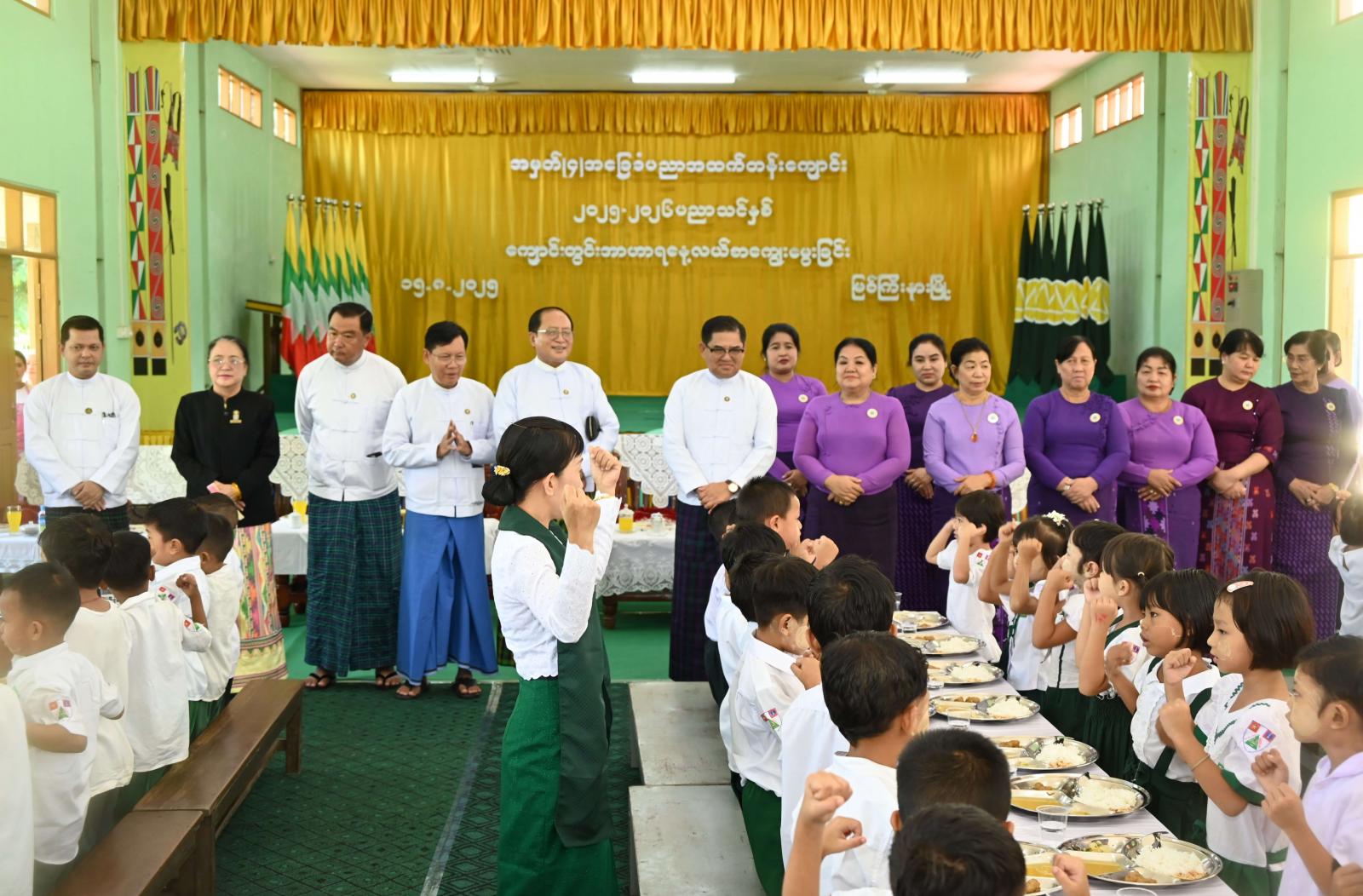 ထို့နောက် ပြည်နယ်ဝန်ကြီးချုပ်နှင့် ဇနီး၊ တာဝန်ရှိသူများသည် အမှတ်(၄) အခြေခံပညာအထက်တန်းကျောင်းသို့သွားရောက်ပြီး ကျောင်းအစည်းအဝေးခန်းမ၌ KG တန်းကလေးငယ်များ အား ကျောင်းတွင်း အာဟာရကျွေးမွေးခြင်းအစီအစဉ်ဖြင့် နေ့လယ်စာကျွေးမွေးနေမှုကို ကြည့်ရှုအားပေးခဲ့ကြပြီး ကလေးငယ်များအား အာဟာရဆေးမှုန့်များနှင့် မုန့်များကို လိုက်လံကျွေးမွေးပေးခဲ့ကြကြောင်း သိရသည်။