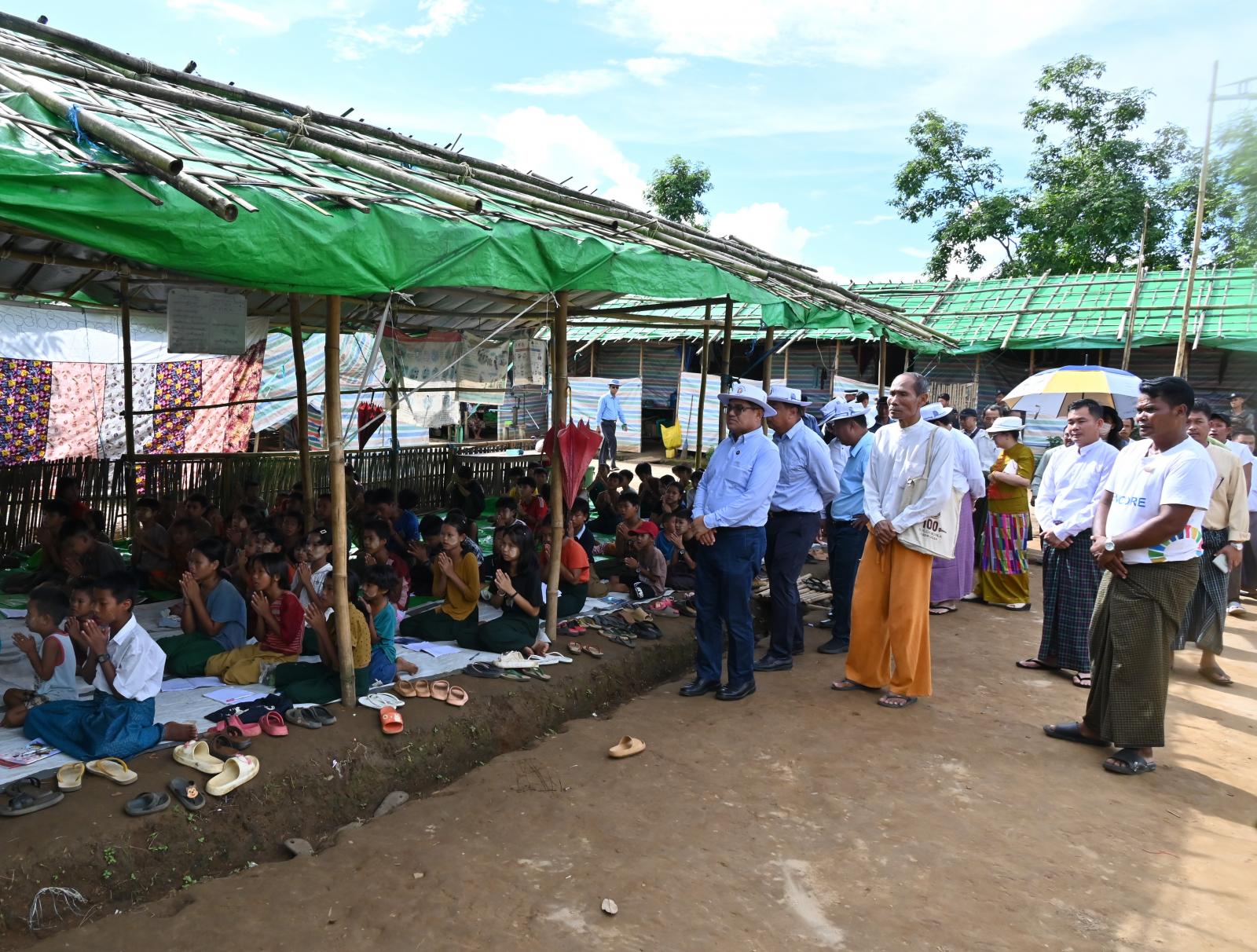 ထို့နောက် ပြည်နယ်ဝန်ကြီးချုပ်က လိုအပ်ချက်များအပေါ် ဌာနဆိုင်ရာတာဝန်ရှိသူများနှင့် ပေါင်းစပ်ညှိနှိုင်းဆောင်ရွက်ပေးခဲ့ပြီး စခန်းအတွင်းရှိ ယဉ်ကျေးလိမ္မာဓမ္မစကူးသင်တန်းမှ ကလေးငယ်များအတွက် အာဟာရကျွေးမွေးစရိတ်အဖြစ် ငွေကျပ် (၁၀) နှင့် ယာယီအိပ်ဆောင်များ ပြုပြင်တိုးချဲ့ဆောက်လုပ်နိုင်ရေးအတွက် ငွေကျပ် (၁၀) တို့ကို ထောက်ပံ့ပေးအပ်ခဲ့ကြပြီး စခန်းအတွင်း ရေဝပ်ဧရိယာဖြစ်ပေါ်နေမှုအခြေအနေများနှင့် နန်းကွေ့ချောင်းရေတိုက်စားမှုအား ကြည့်ရှုစစ်ဆေးခဲ့ကြပြီး စခန်းအတွင်းရေဝပ်သည့်နေရာများအား သဲကျောက်ခင်းပေးနိုင်ရေးနှင့် ချောင်းရေတိုက်စားမှုအား ကွင်းဆင်းဆောင်ရွက်နိုင်ရေး ဌာနဆိုင်ရာတာဝန်ရှိသူများနှင့် ပေါင်းစပ်ညှိနှိုင်းဆောင်ရွက်ပေးခဲ့ကြောင်းသိရသည်။