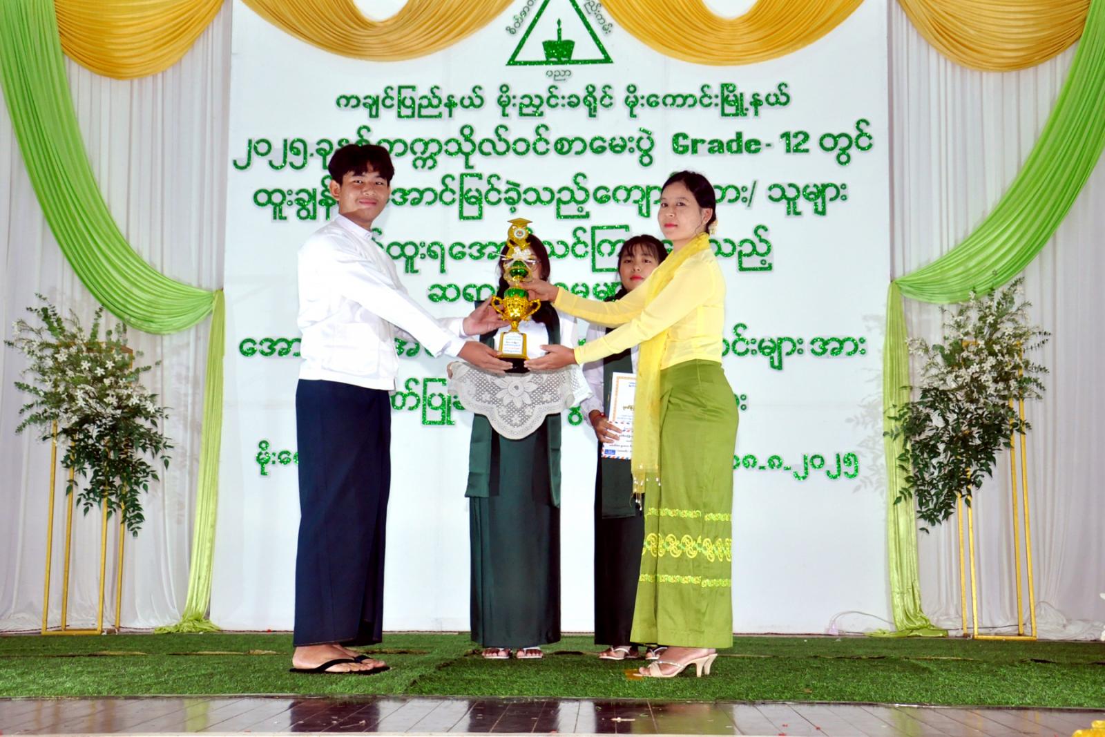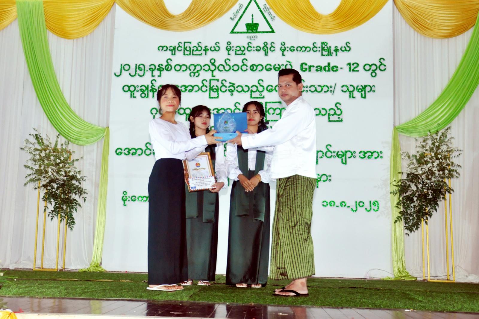 ကချင်ပြည်နယ်၊ မိုးညှင်းခရိုင်၊ မိုးကောင်းမြို့နယ် ၂၀၂၅ ပညာသင်နှစ် တက္ကသိုလ်ဝင်စာမေးပွဲ (Grade-12) တွင် ဂုဏ်ထူးဖြင့်ထူးချွန်စွာအောင်မြင်ခဲ့သည့် ကျောင်းသား၊ ကျောင်းသူများ ဂုဏ်ထူးရအောင် သင်ကြားပေးသည့် ဆရာ၊ ဆရာမများ၊ ပြည်နယ်နှင့်မြို့နယ်အဆင့် ဆုရရှိသည့် ကျောင်းများအား ဂုဏ်ပြုဆုချီးမြှင့်ပွဲကို မိုးကောင်းမြို့တော်ခန်းမ၌ ယမန်နေ့နံနက်(၉)နာရီတွင်ကျင်းပခဲ့ရာ အခမ်းအနားကို အ.ထ.က(၂)မိုးကောင်းမှ ကျောင်းသား၊ ကျောင်းသူများက “ပညာပန်းခင်း”တေးသီချင်းဖြင့် သီဆိုဖွင့်လှစ်ခဲ့ကြောင်း သိရသည်။