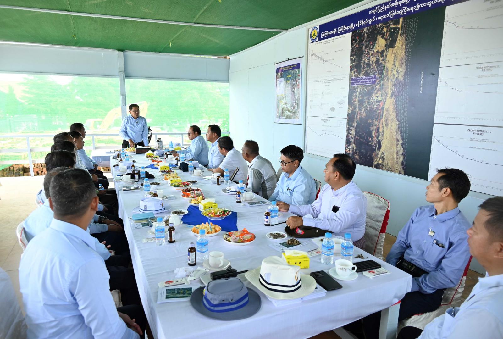 ထို့နောက် ရှင်းလင်းဆောင်၌ ရေလျှံတားကျောက်စီမြေထိန်းနံရံနှင့် တမံတည်ဆောက်ခြင်း လုပ်ငန်းများနှင့် စပ်လျဉ်း၍ ပြည်နယ်ဦးစီးမှူး ဦးစိန်လွင်က မြစ်ရေကြီးရေလျှံမှုမှ ကာကွယ်ရေးနိုင်ရေး ဆောင်ရွက်ခဲ့သည့် လုပ်ငန်းများစီမံကိန်းများ၊ ရေလျှံတားကျောက်စီရေထိန်းနံရံ တည်ဆောက် လျက်ရှိသည့် အစီအစဉ်များနှင့် ဆက်လက်ဆောင်ရွက်သွားရမည့် လုပ်ငန်းစီမံကိန်းများကိုလည်းကောင်း၊ တာဝန်ရှိသူများက လုပ်ငန်းစီမံကိန်းအလိုက် ပြီးစီးအောင်ဆောင်ရွက်သွားမည့် အစီအစဉ်များကိုလည်းကောင်း၊ ရှင်းလင်းတင်ပြကြပြီး ပြည်နယ်လမ်းပန်းဆက်သွယ်ရေးဝန်ကြီး ဦးခင်မောင်ထွေးက တည်ဆောက်ရေးလုပ်ငန်းများအပေါ် အနီးကပ်စစ်ဆေးကြပ်မတ်ဆောင်ရွက်သွားမည့် အစီအစဉ်များကို ရှင်းလင်းတင်ပြရာ ပြည်နယ်ဝန်ကြီးချုပ်က လုပ်ငန်းများ သတ်မှတ်ချိန်အမီ၊ အရည်အသွေးပြည့်မီစွာ ပြီးစီးအောင်ဆောင်ရွက်ရေး၊ လုပ်ထုံးလုပ်နည်းနှင့်အညီ ဆောင်ရွက်နိုင်ရေး လိုအပ်သည်များကို ညှိနှိုင်းပေါင်းစပ်ဆောင်ရွက်ပေးခဲ့သည်။
