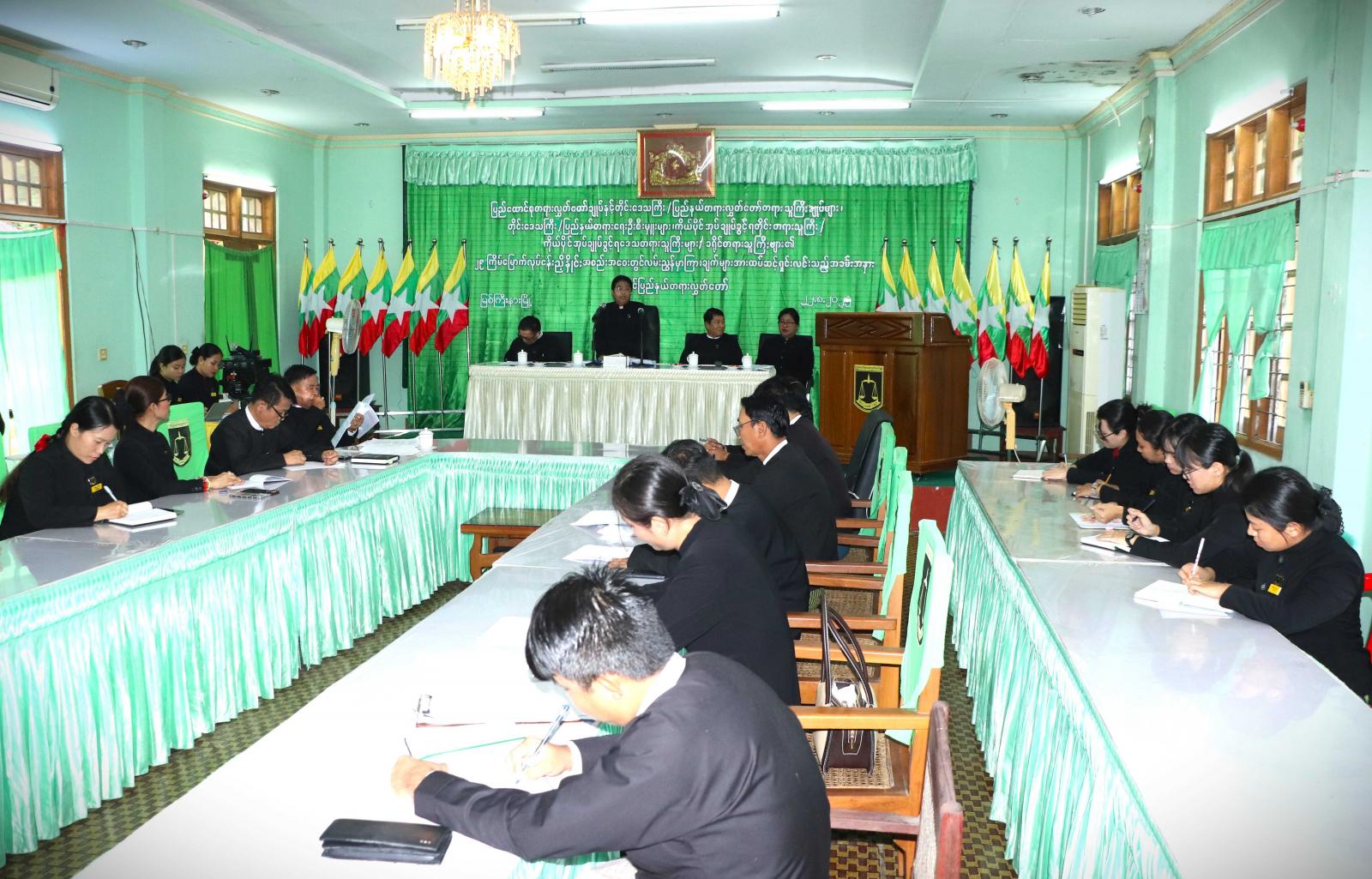 ပြည်ထောင်စုတရားလွှတ်တော်ချုပ်နှင့် တိုင်းဒေသကြီး/ပြည်နယ်တရားလွှတ်တော် တရားသူကြီးချုပ်များ၊ တရားရေးဦးစီးမှူးများ၊ ကိုယ်ပိုင်အုပ်ချုပ်ခွင့်ရတိုင်းတရားသူကြီး/ ကိုယ်ပိုင်အုပ်ချုပ်ခွင့်ရ ဒေသတရားသူကြီးများ၊ ခရိုင်တရားသူကြီးများ၏ (၂၉)ကြိမ်မြောက် လုပ်ငန်းညှိနှိုင်း အစည်းအဝေးမှ မှာကြားချက်များအား ကချင်ပြည်နယ်တရားလွှတ်တော်ရုံး၊ အစည်းအဝေးခန်းမ၌ ထပ်ဆင့်ရှင်းလင်းပွဲ အခမ်းအနားကို ယမန်နေ့ မွန်းလွဲ ၂ နာရီက ကျင်းပပြုလုပ်သည်။