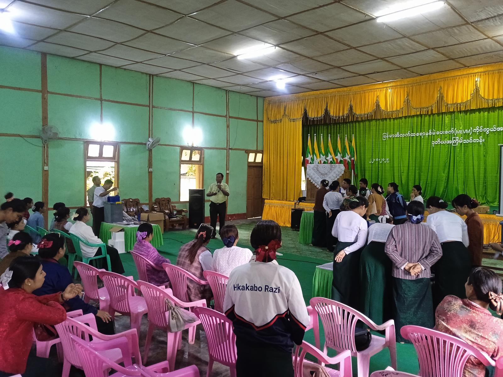 ကချင်ပြည်နယ်၊ တနိုင်းခရိုင်၊ တနိုင်းမြို့နယ် မြန်မာအီလက်ထရောနစ်မဲပေးစက် (MEVM) ကိုင်တွယ်အသုံးပြုနည်း ဒုတိယအကြိမ်သင်တန်းကို ယမန်နေ့နံနက် ၉ နာရီက ဟူးကောင်းခန်းမ၌ ဖွင့်လှစ်ခဲ့ကြောင်း သိရသည်။