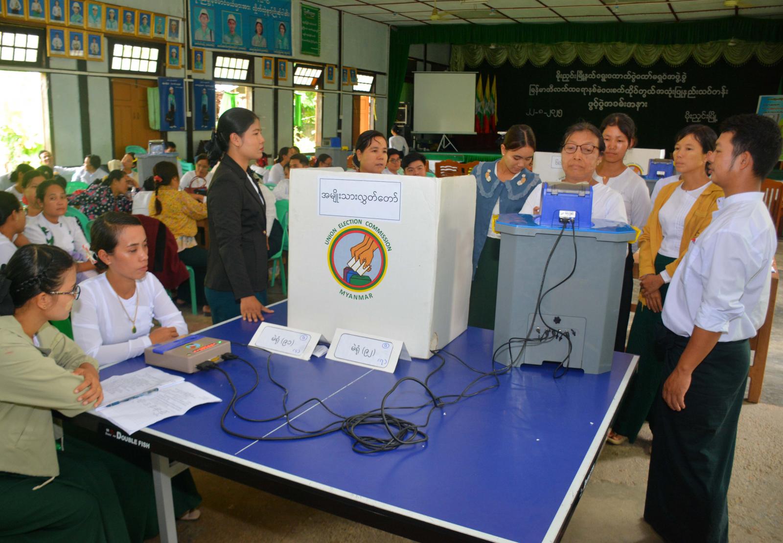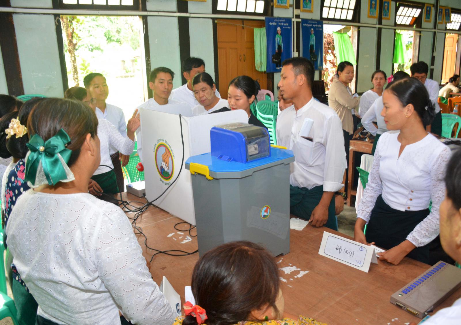 သင်တန်းတွင် တက်ရောက်လာကြသည့် မဲရုံတာဝန်ခံသင်တန်းသား သင်တန်းသူများအား သင်တန်းနည်းပြများက အီလက်ထရောနစ်မဲပေးစက်ကိုင်တွယ် အသုံးပြုပုံးနည်း အဆင့်ဆင့်တို့ကို အုပ်စုဖွဲ့၍ လက်တွေ့ပြသ သင်တန်းပေးလျက်ရှိရာ သင်တန်းသား သင်တန်းသူများမှ သိလိုသည်များအား ပြန်လည်မေးမြန်းဆွေးနွေးကြပြီးနောက် မြေပြင်အမှန်တကယ် မဲပေးပုံနည်းစနစ်အတိုင်း လက်တွေ့သရုပ်ပြသခဲ့ကြကြောင်း သိရသည်။