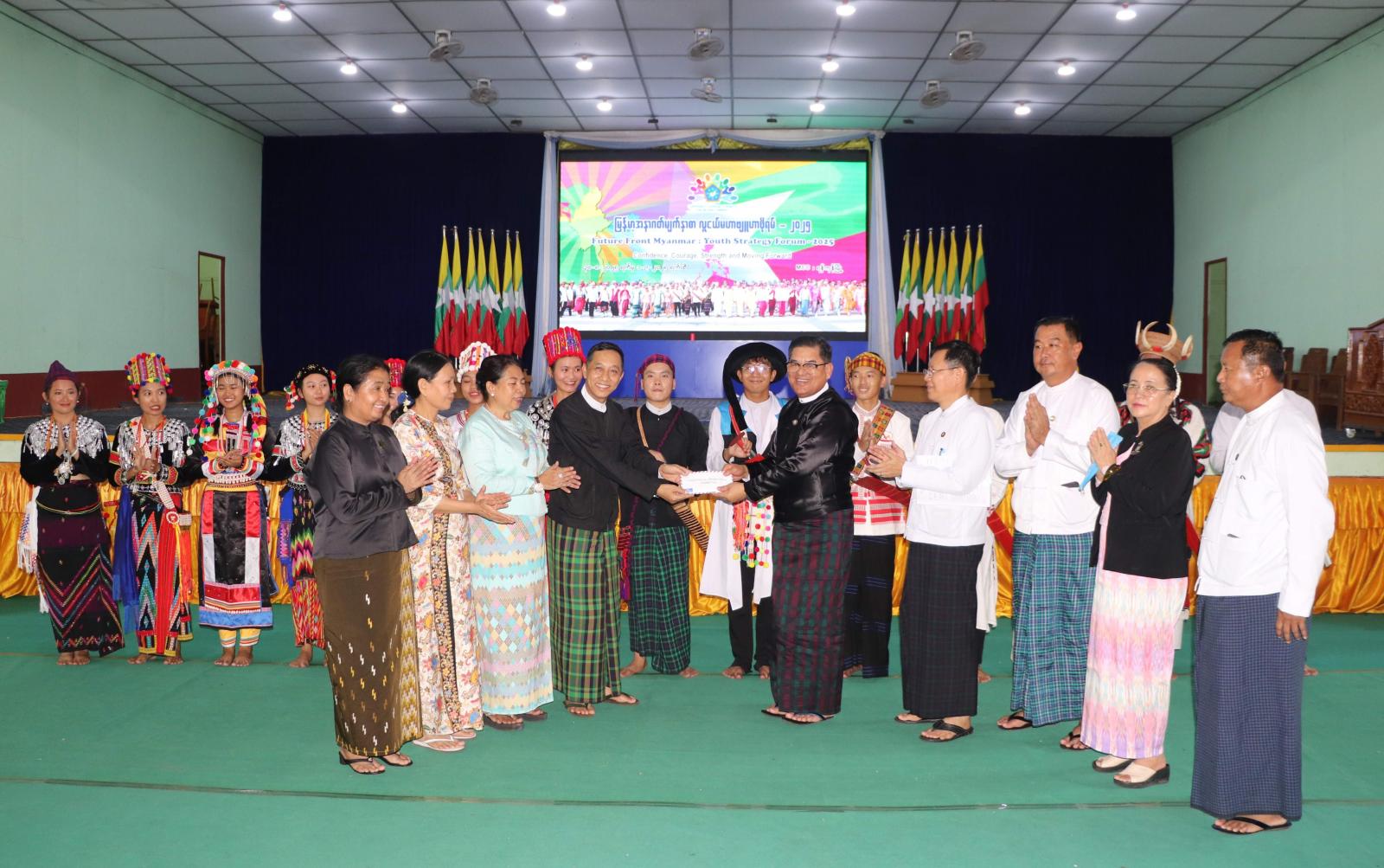 ထို့နောက် ပြည်နယ်ဝန်ကြီးချုပ်နှင့် အဖွဲ့ဝင်များသည် မိုးလုံလေလုံအားကစားခန်းမ၌ လာမည့် သြဂုတ် ၃၀ ရက်မှ စက်တင်ဘာ ၁ ရက်အထိ ရန်ကုန်တိုင်းဒေသကြီးတွင် ကျင်းပမည့် မြန်မာ့အနာဂတ်မျက်နှာစာ လူငယ်မဟာဗျူဖိုရမ် (၂၀၂၅)သို့ ပါဝင်ကြမည့် ကချင်ပြည်နယ် ကိုယ်စားပြုအဖွဲ့မှ ကချင်တိုင်းရင်းသားရိုးရာအကအဖွဲ့၏ ကြိုတင်ပြင်ဆင်လေ့ကျင့်နေမှုကို ကြည့်ရှုအားပေးခဲ့ကြပြီး ပြည်နယ်ဝန်ကြီးချုပ်က ရိုးရာအကအဖွဲ့အတွက် ချီးမြှင့်ငွေကျပ် ၁၀ သိန်းကို ပေးအပ်ချီးမြှင့်ခဲ့ကြကာ လူငယ် ဖိုရမ်သို့ သွားရောက်ကြမည့် ကိုယ်စားလှယ်အဖွဲ့နှင့် လူငယ်အကအဖွဲ့တို့အား ပါဝင်ခွင့်ရသည့်အတွက် အကောင်းမွန်ဆုံးကြိုးစားပါဝင်ကြရေး၊ ကပြဖျော်ဖြေရာတွင်လည်း ရိုးရာဓလေ့၊ ရိုးရာ မူဟန်ကိုပေါ်လွင်အောင် ကြိုးစားကြရေးနှင့် လိုအပ်သည်များကို ဖြည့်ဆည်းပံ့ပိုးပေးနိုင်ရေး တာဝန်ရှိသူများနှင့် ပေါင်းစပ်ညှိနှိုင်းဆောင်ရွက်ပေးခဲ့ကြောင်း သိရသည်။