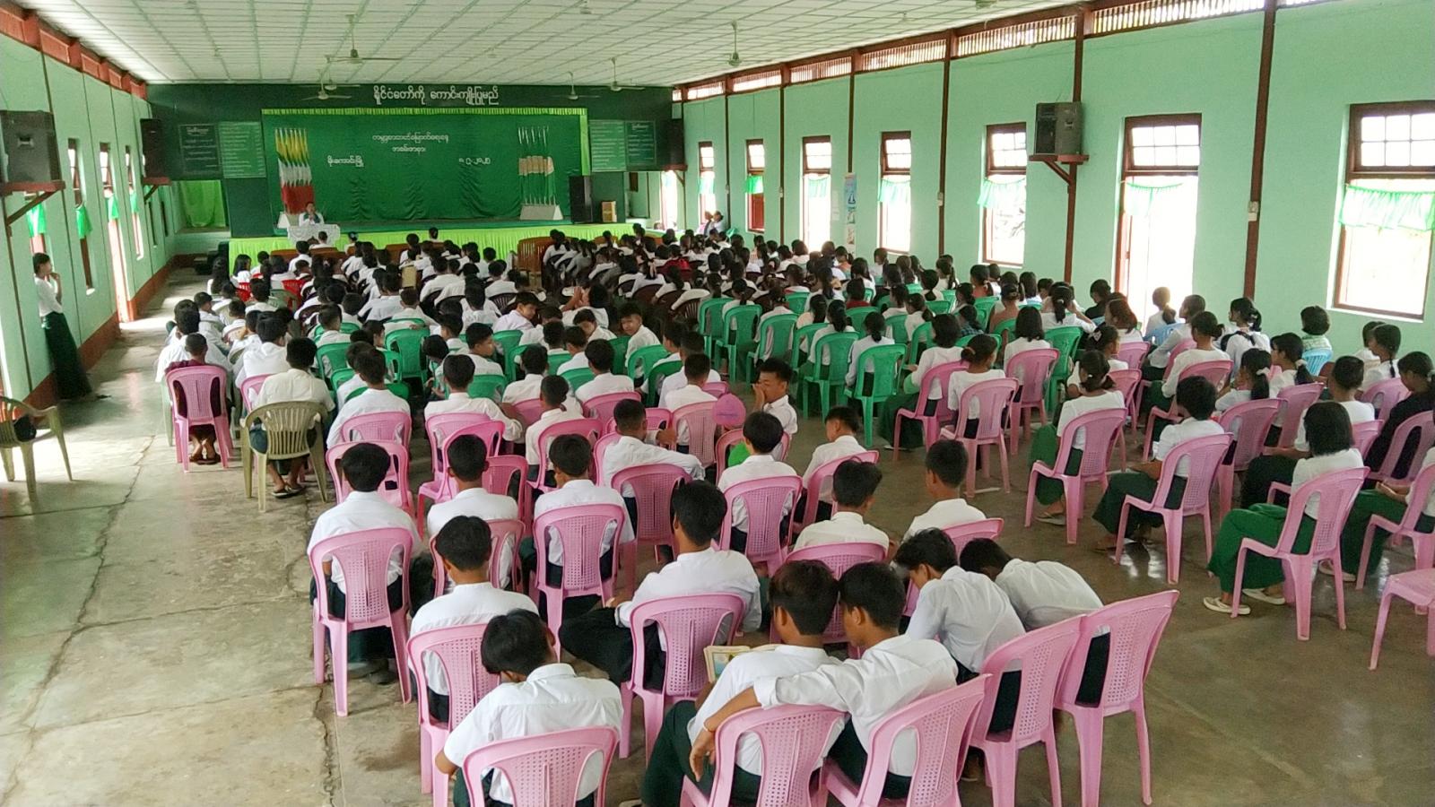 အခမ်းအနားတွင် မြို့နယ်ပညာရေးမှူးကိုယ်စား အ.ထ.က(၂)ကျောင်းအုပ်ဆရာမကြီး ဒေါ်စန်းစန်းရီက အဖွင့်အမှာစကားပြောကြားပြီး ပြန်ကြားရေးနှင့်ပြည်သူ့ဆက်ဆံရေးဦးစီးဌာနမှ ဒုတိယဦးစီးမှူး ဒေါ်အိအိဖြိုးက ''စာတတ်မြောက်ခြင်းနှင့် နိုင်ငံတော်ဖွံ့ဖြိုးတိုးတက်မှု'' ခေါင်းစဉ်ဖြင့် ဟောပြောသည်။