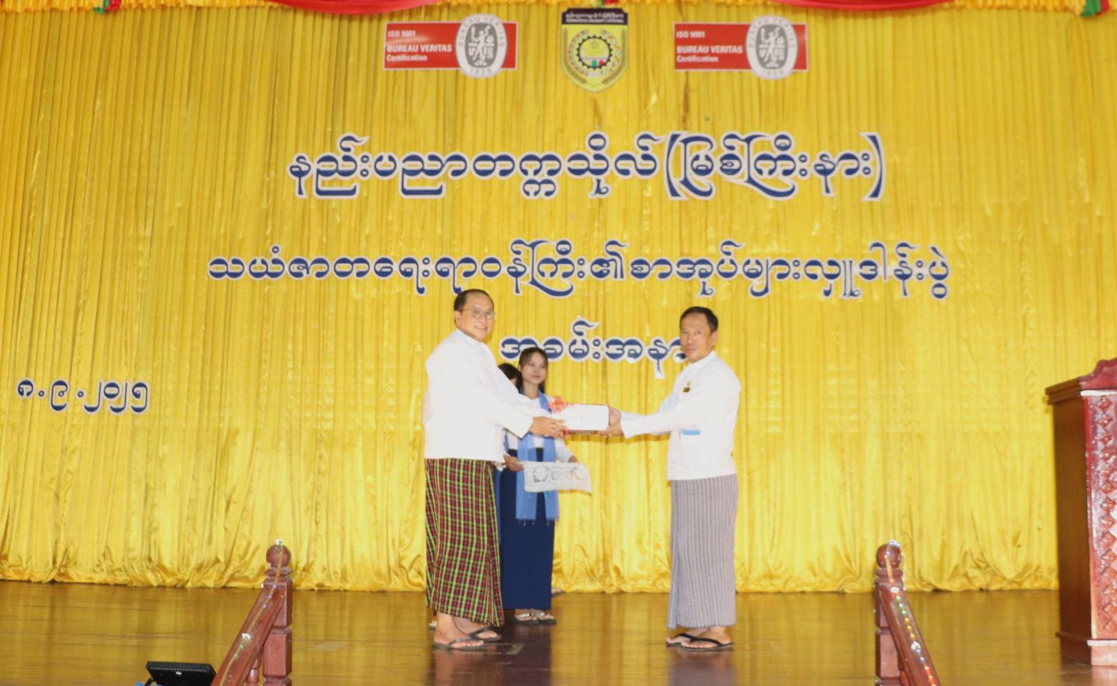 ထို့နောက် နည်းပညာတက္ကသိုလ်ဒုတိယပါမောက္ခချူပ် ဒေါက်တာမင်းမင်းဦးက စာကြည့် တိုက်အတွက် ငွေကျပ်သိန်း (၁၀၀)တန်ဖိုးရှိ သုတ/ ရသစာအုပ်စာစောင်များကို လှူဒါန်းပေးအပ်ခဲ့သည့်အတွက် ကျေးဇူးတင်စကားပြန်လည်ပြောကြားပြီး ပြည်နယ်ဝန်ကြီးက စာကြည့်တိုက်အ တွက် ကျပ်သိန်း ၁၀၀ တန်ဖိုးရှိ သုတ/ရသ စာအုပ်စာဆောင်များ ပေးအပ်လှူဒါန်းရာ ဒုတိယ ပါမောက္ခချုပ်က ကျေးဇူးတင်ဂုဏ်ပြုမှတ်တမ်းလွှာ ပြန်လည်ပေးအပ်ခဲ့သည်။