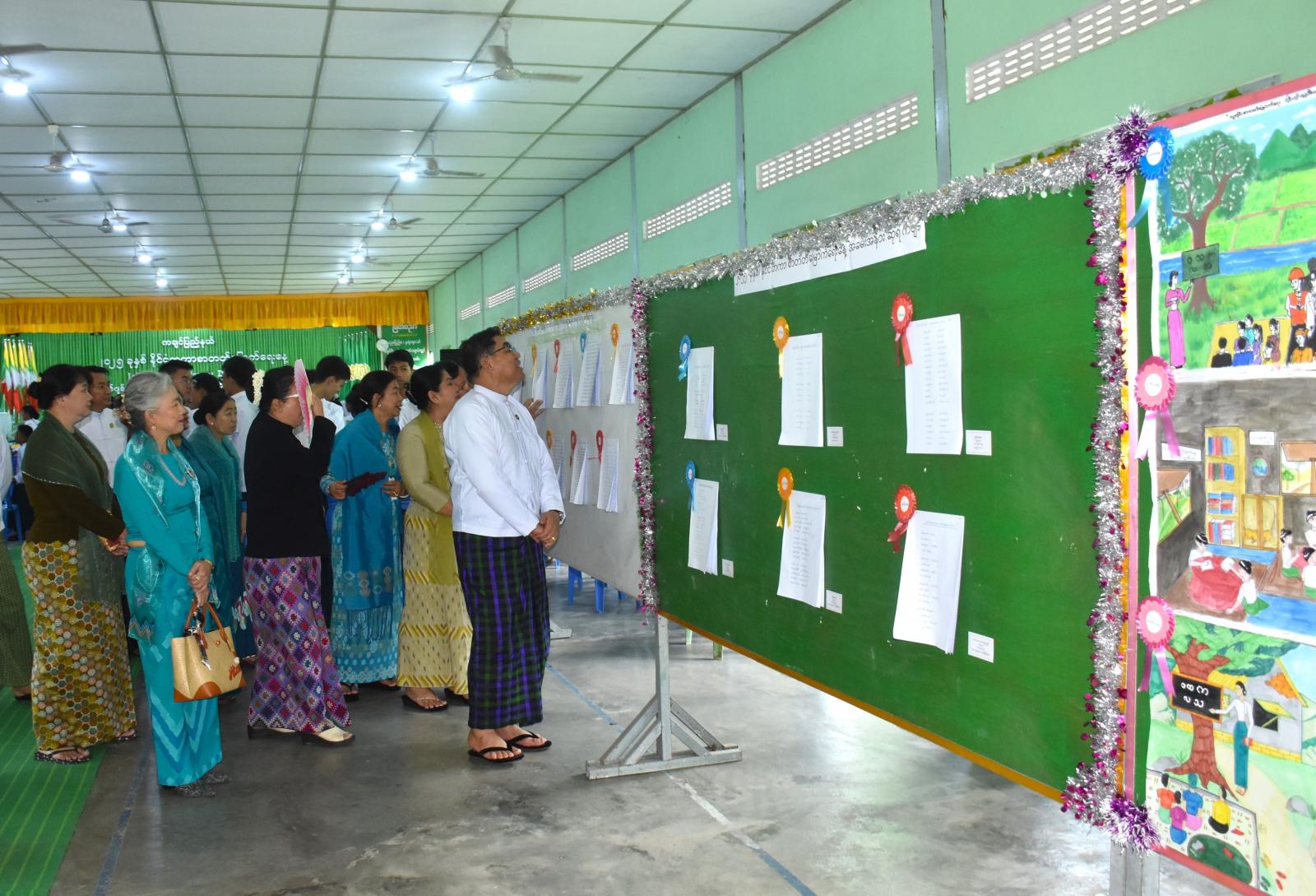 ယင်းနောက် လေ့ကျင့်ရေးအလယ်တန်းကျောင်းမှ ကျောင်းသူလေးများက လက်ပံကောက်တေးသီချင်း သရုပ်ဖော်အကဖြင့် ကပြဖျော်ဖြေကြရာ ပြည်နယ်အစိုးရအဖွဲ့ဝင် လူမှုရေးရာဝန်ကြီး ဦးမိုးမင်းသိန်းက ဖျော်ဖြေရေးအဖွဲ့များအတွက် ချီးမြှင့်ထောက်ပံ့ငွေများကို ပေးအပ်ချီးမြှင့်ခဲ့ပြီး ပြည်နယ်ဝန်ကြီးချုပ်နှင့် ဇနီး၊ ပြည်နယ်တရားလွှတ်တော်တရားသူကြီးချုပ်၊ ပြည်နယ်အစိုးရအဖွဲ့ဝင်ဝန်ကြီးများနှင့် ၎င်းတို့၏ဇနီးများ၊ ပြည်နယ်အဆင့်ဌာနဆိုင်ရာတာဝန်ရှိသူများက ခန်းမအတွင်း ခင်းကျင်းပြသထားသော ဆုရပြိုင်ပွဲဝင်များ၏ မှတ်တမ်းများ စာစီစာကုံး၊ ပန်းချီနှင့်ကဗျာများကို ကြည့်ရှုလေ့လာခဲ့ကြသည်။