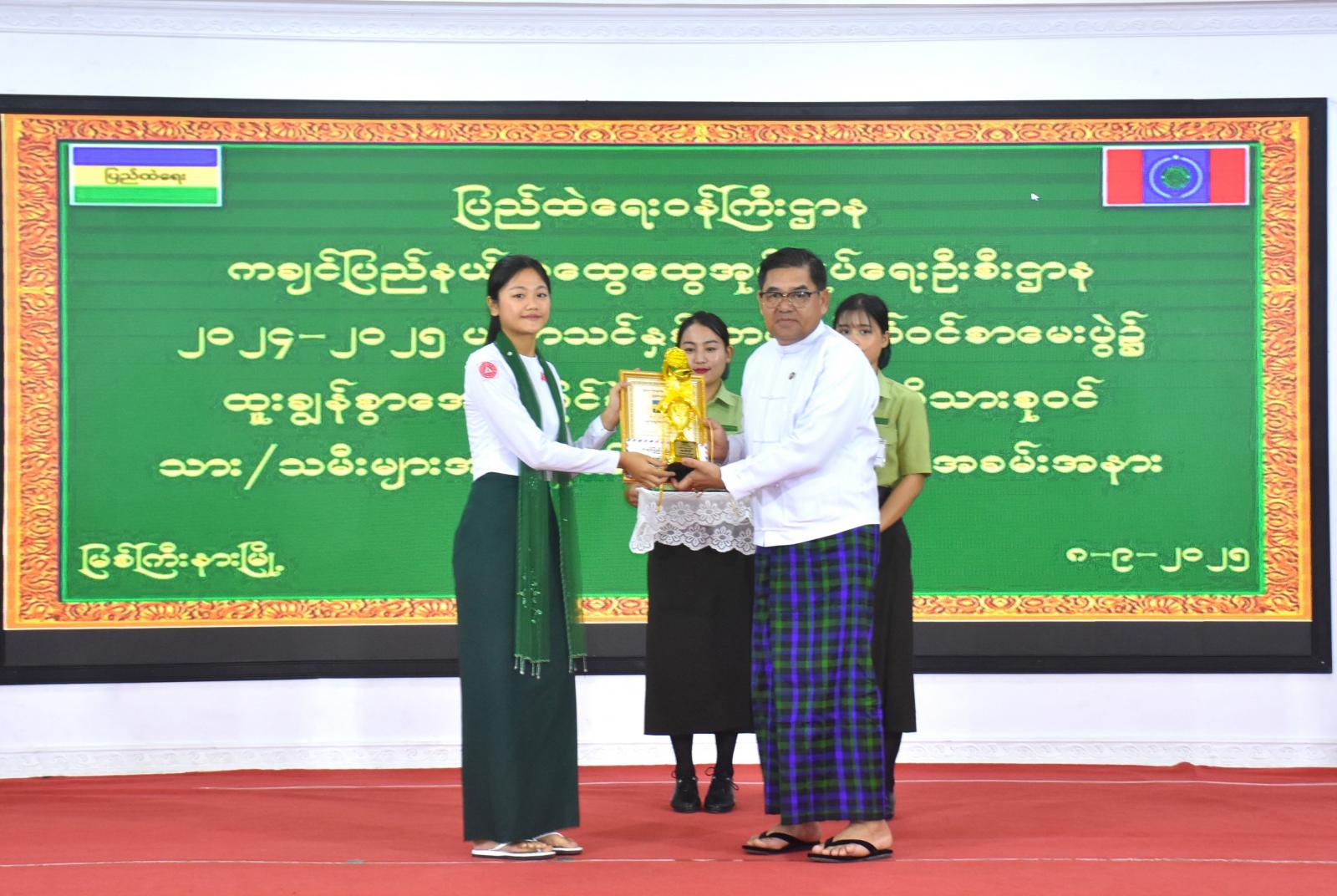 ထို့နောက် ပြည်နယ်ဝန်ကြီးချုပ်နှင့် ဇနီးတို့က တက္ကသိုလ်ဝင်စာမေးပွဲအောင်မြင်ခဲ့ကြသော (၄) ဘာသာဂုဏ်ထူးရှင် (၁)ဦး၊ (၃)ဘာသာဂုဏ်ထူးရှင် (၁)ဦး၊ (၂)ဘာသာဂုဏ်ထူးရှင် (၂)ဦး၊ (၁) ဘာသာဂုဏ်ထူးရှင် (၄)ဦးနှင့် ရိုးရိုးအောင် (၅)ဦးတို့အား ဂုဏ်ပြုမှတ်တမ်းလွှာနှင့် ဂုဏ်ပြုချီးမြှင့် ငွေများကို အသီးသီးပေးအပ်ချီးမြှင့်ခဲ့ကြရာ ဂုဏ်ထူးရကျောင်းသူတစ်ဦးက ကျေးဇူးတင်စကားပြန် လည်ပြောကြားခဲ့ကြောင်း သိရသည်။