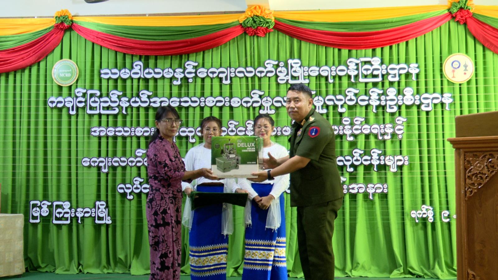 ကချင်ပြည်နယ်အစိုးရအဖွဲ့၏ အစီအစဉ်ဖြင့် ပြည်နယ်အသေးစားစက်မှုလက်မှုလုပ်ငန်းဦးစီးဌာနက ဖွင့်လှစ်သော အသေးစားကုန်ထုတ်လုပ်ငန်းများ ဖန်တိးပေးနိုင်ရေးနှင့် ကျေးလက်နေ မိသားစုများ ဝင်ငွေတိုးရေးစီမံကိန်းလုပ်ငန်း နည်းပညာသင်တန်းများကို ဖွင့်လှစ်သင်ကြားပေးလျက်ရှိရာ စက်တင်ဘာ ၉ ရက် မွန်းလွဲ ၁ နာရီက အဆိုပါဦးစီးဌာန လေ့ကျင့်ပျိုးထောင်ရေးခန်းမ၌ စီမံကိန်းလုပ်ငန်းများအတွက် ဒေသဖွံ့ဖြိုးရေးလုပ်ငန်းသုံးပစ္စည်းများ ပေးအပ်ပွဲအခမ်းအနားကို ကျင်းပပြုလုပ်သည်။