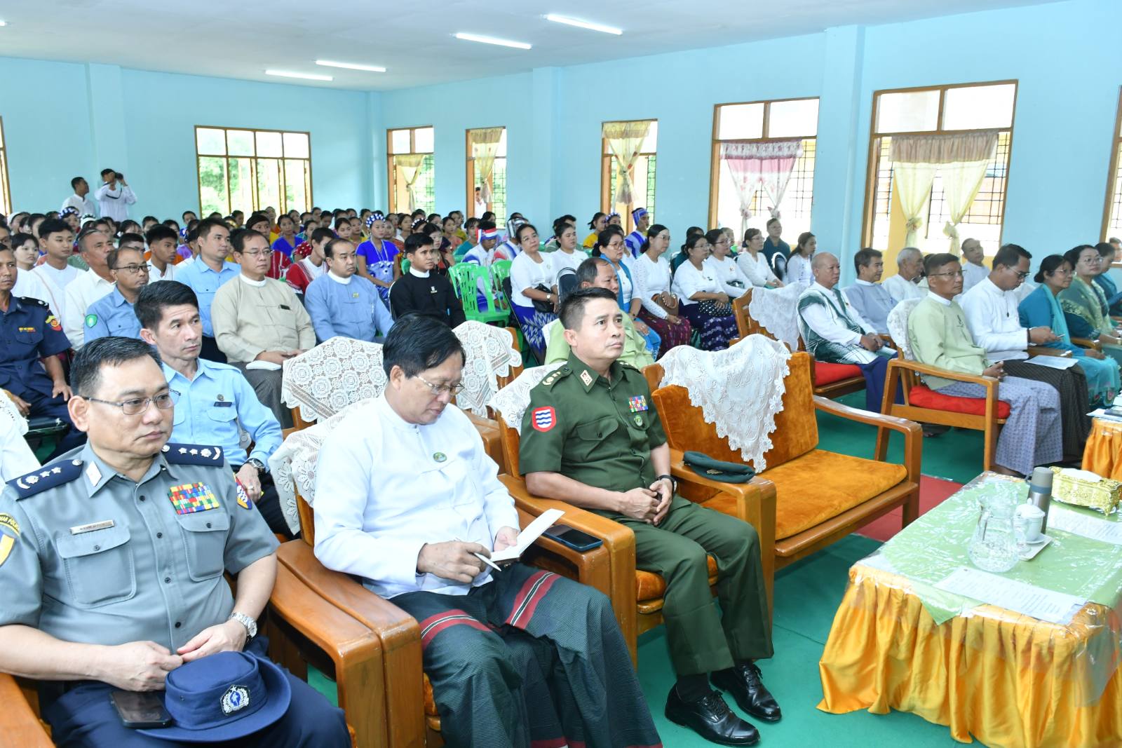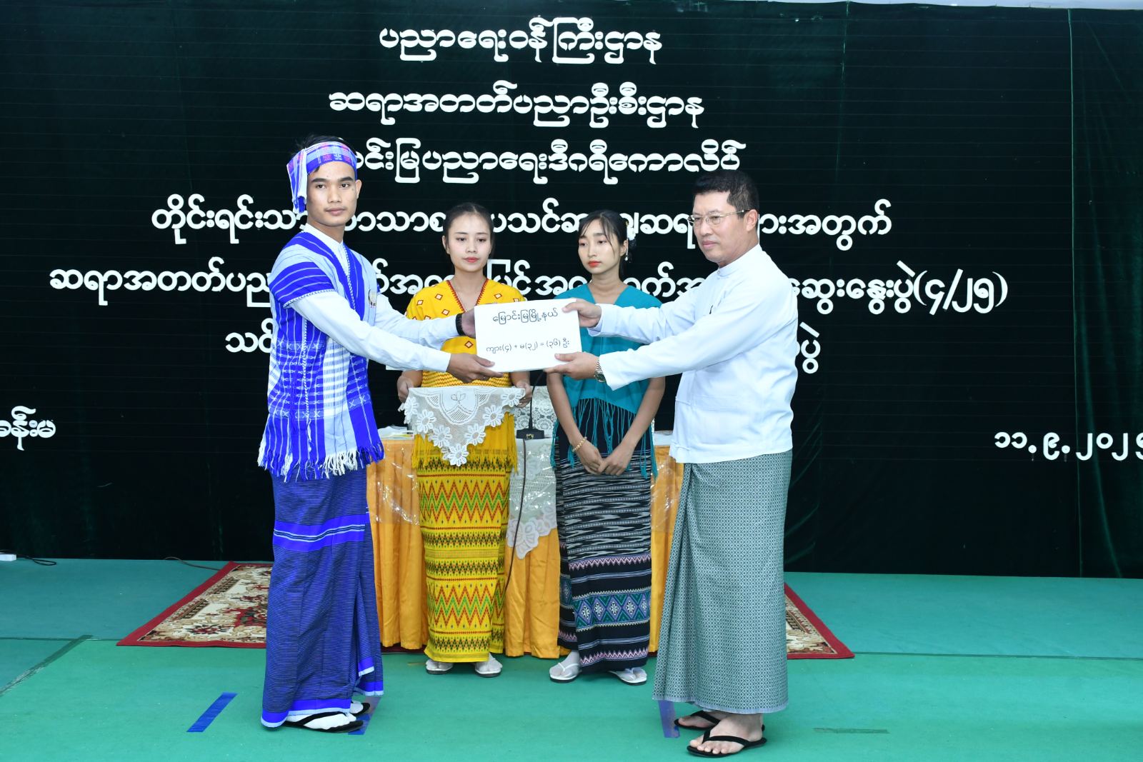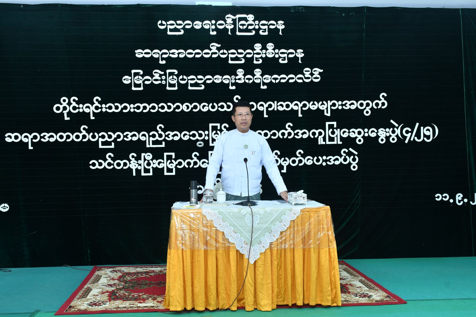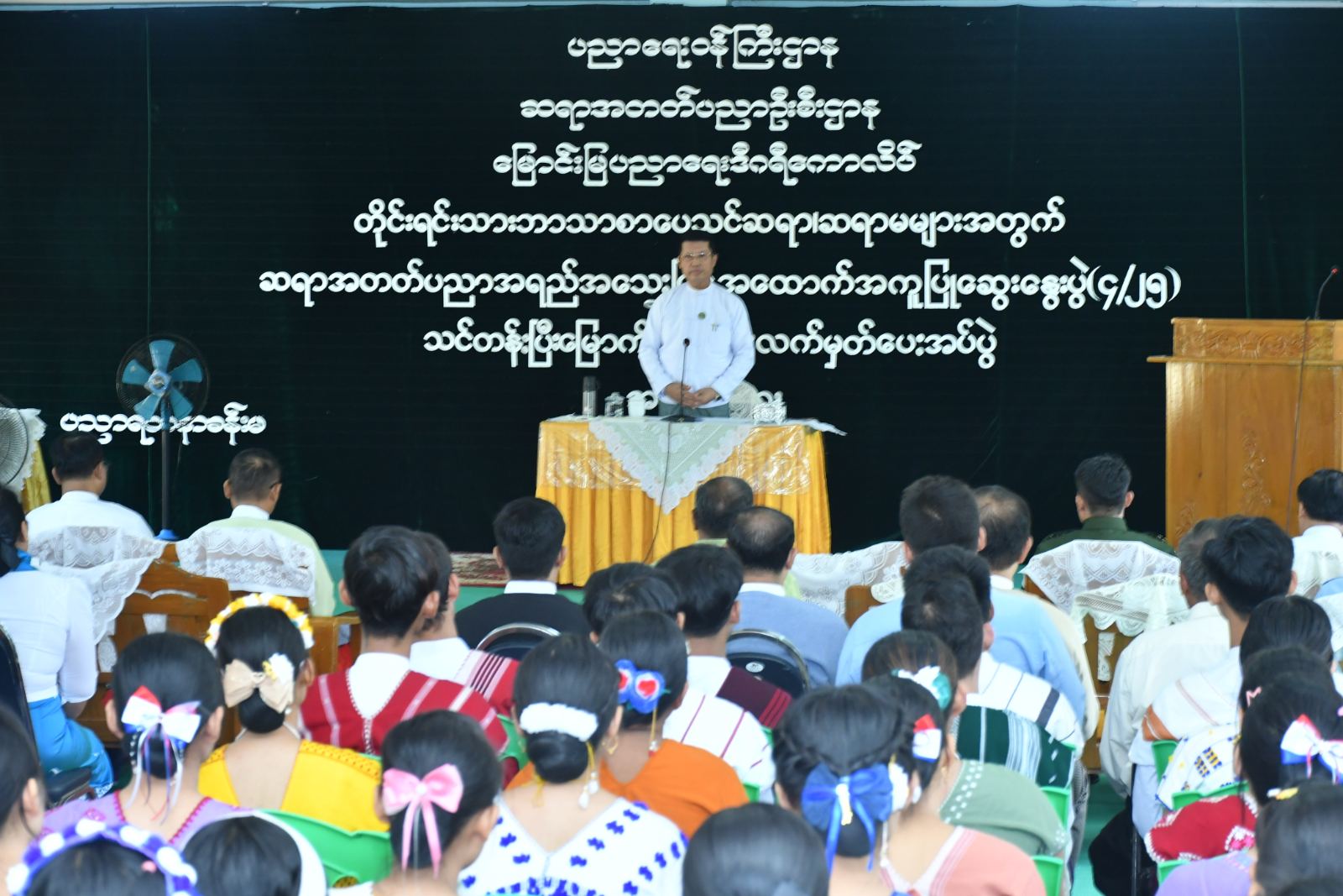 ထို့နောက် အခမ်းအနားသို့ဆက်လက် တက်ရောက်ခဲ့ရာ တိုင်းရင်းသားဘာသာစာပေသင် ဆရာ၊ ဆရာမများက “ပွင့်ဖူးဝေဆာ ကျောင်းသီချင်းဖြင့် စုပေါင်းသီဆိုဖွင့်လှစ်ခဲ့ပြီး တိုင်းဒေသကြီးဝန်ကြီးချုပ်က“ တိုင်းရင်းသားဘာသာစာပေသင် ဆရာ၊ ဆရာမများအတွက် ဆရာအတတ်ပညာအရည်အသွေးမြှင့် အထောက်အကူပြုဆွေးနွေးပွဲကို နိုင်ငံ၏ရေမြေသဘာဝရင်းမြစ်များကို ထိန်းသိမ်းစောင့်ရှောက်လိုစိတ်၊ သမိုင်းကြောင်းနောက်ခံများကိုသိရှိနားလည်၍ တိုင်းရင်းသားအချင်းချင်း ရင်းနှီးချစ်ကြည်စွာ နေထိုင်လိုစိတ်များ ရင့်သန်လာစေရန်၊ လူမှုကျင့်ဝတ်နှင့်အညီ လိုက်နာရမည့်စည်းမျဉ်းစည်းကမ်း၊ အခွင့်အရေးနှင့် တာဝန်များကို သိရှိလိုက်နာကျင့်သုံးနိုင်ရန်၊ လူမှုရေးဆိုင်ရာ ကျွမ်းကျင်မှုများဖြစ်သည့် ဆက်သွယ်ပြောဆိုခြင်း (Communication)၊ လေးနက်စွာ ဆန်းစစ်ဝေဖန်ခြင်းနှင့် ပြဿနာဖြေရှင်းခြင်း (Critical Thinking and Problem Solving) ၊ တီထွင်ဖန်တီးခြင်း (Creativity and Innovation)၊ နိုင်ငံ့သားကောင်းဖြစ်ခြင်း (Citizenship) စသည့် ကိုယ်ရည်ကိုယ်သွေး ကျွမ်းကျင်မှုကိုရရှိနိုင်ရန်၊ ကမ္ဘာ့နိုင်ငံသားကောင်းများ၏ အရည်အသွေးများကိုလည်းသိရှိနားလည် နိုင်ရန်၊ နိုင်ငံ့ဝန်ထမ်းဥပဒေ၊ နည်းဥပဒေများကို သိရှိလိုက်နာနိုင်ရန်နှင့် ဒီမိုကရေစီ အလေ့အကျင့်ကောင်းများ ရရှိနိုင်မည် စသည့် ရည်ရွယ်ချက်များဖြင့် ဆောင်ရွက်ခဲ့ခြင်းဖြစ်ပါကြောင်း၊ တိုင်းဒေသကြီးသည် အခြေခံပညာကျောင်းများဖွင့်လှစ်မှု၊ ကျောင်းတက်ရောက်မှုအများဆုံးတိုင်းဒေသကြီးဖြစ်ပြီး အနာဂတ်တွင်နိုင်ငံ့တာဝန်များကို ပုခုံးပြောင်းထမ်းဆောင်မည့် လူငယ်လူရွယ်များကို ဗလငါးတန်နှင့်ပြည့်စုံအောင် ပြုစုပျိုးထောင်ရာတွင် ဆရာ၊ ဆရာမများ၏ အခန်းကဏ္ဍသည်များစွာအရေးပါပြီး လိုအပ်သည့်နေရာများကို ဖြည့်ဆည်းပေးနေခြင်းလည်းဖြစ်ပါကြောင်း၊ ယခုကဲ့သို့ ဆွေးနွေးပွဲများပြုလုပ်ရာတွင် တိုင်းဒေသကြီးအတွက် များစွာအကျိုးရှိပါကြောင်း၊ မကြာခင်ကာလအတွင်း တိုင်းဒေသကြီး၏ စိုက်ပျိုးရေး၊ မွေးမြူရေးလုပ်ငန်းများအတွက် အထောက်အကူဖြစ်စေမည့် စိုက်ပျိုးရေးနှင့်မွေးမြူရေးတက္ကသိုလ် (မအူပင်) ကို ဖွင့်လှစ်တော့မည်ဖြစ်ပါကြောင်း၊ တိုင်းရင်းဘာသာစာပေသင် ဆရာ၊ ဆရာမများအနေဖြင့် တိုင်းဒေသကြီး၏ပညာရေးကဏ္ဍနှင့် တိုင်းရင်းသားများ၏ ပညာသင်ကြားနိုင်မှုအခွင့်အလမ်းများ ပိုမိုတိုးတက်မြင့်မားရေး ကြိုးပမ်းဆောင်ရွက် သွားကြစေလိုကြောင်းနှင့် နိုင်ငံ့အကျိုးပြု သားကောင်းရတနာများဖြစ်အောင် မွေးထုတ်ပေးနိုင်သူများဖြစ်အောင် ကြိုးစားသွားကြစေလိုကြောင်း ” အမှာစကားများပြောကြားပြီး တိုင်းရင်းသားဘာသာစာပေသင် ဆရာ၊ ဆရာမများအား သင်တန်းပြီးမြောက်ကြောင်း လက်မှတ်များပေးအပ်ခဲ့