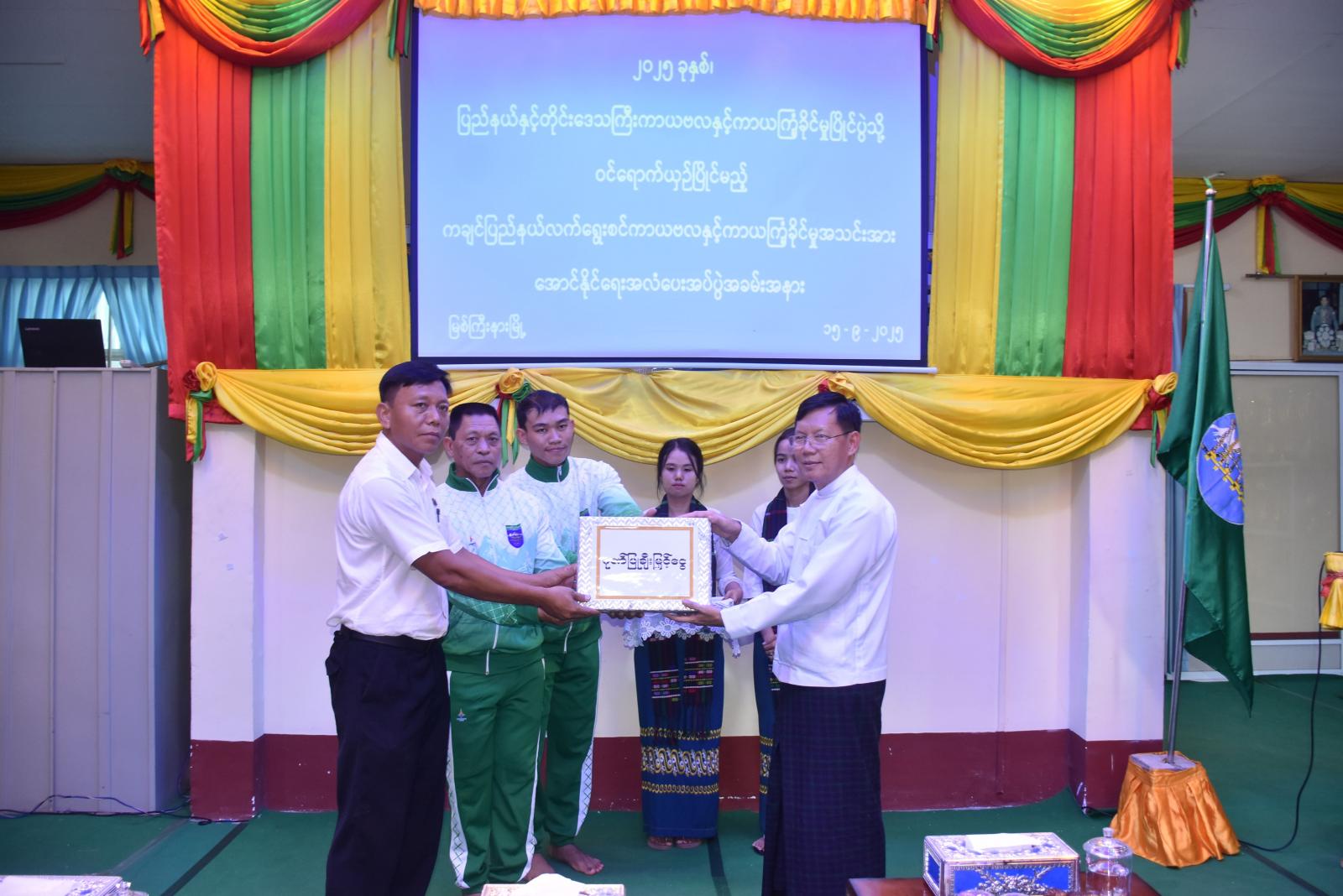 ယင်းနောက် ပြည်နယ်လက်ရွေးစင်အသင်းနည်းပြ ဦးဇော်မြင့်စိန်က အောင်နိုင်ရေးအတွက် ကြိုတင်ပြင်ဆင်လေ့ကျင့်ခဲ့မှု အခြေအနေများနှင့် ပြိုင်ပွဲဝင်ရောက်ယှဉ်ပြိုင်သွားမည့် အစီအမံများကို ရှင်းလင်းတင်ပြပြီး ပြည်နယ်ဝန်ကြီးက လက်ရွေးစင်အသင်းအတွက် အောင်နိုင်ရေးအလံနှင့် ချီးမြှင့် ထောက်ပံ့ငွေများကို အုပ်ချုပ်သူ၊ နည်းပြနှင့် အားကစားသမားများထံ ပေးအပ်ချီးမြှင့်ရာ အသင်း အုပ်ချုပ်သူက ကျေးဇူးတင်စကားနှင့် အောင်နိုင်ရေးအတွက် ကတိစကားပြောကြားခဲ့ကြောင်း သိရဿည်။