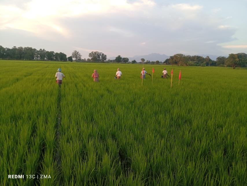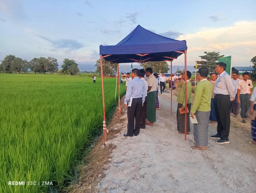 ဆက်လက်ပြီး တောင်သူဦးကြိုးကြာ၏ လယ်မြေတစ်ဧကခွဲရှိ ဧရာမင်းစပါးခင်းအတွင်း သဘာဝမြေသြဇာနှင့်ပုလဲဓာတ်မြေသြဇာရောစပ် ကြဲပက်နေမှုကို ကြည့်ရှုအားပေးခဲ့ကြသည်။